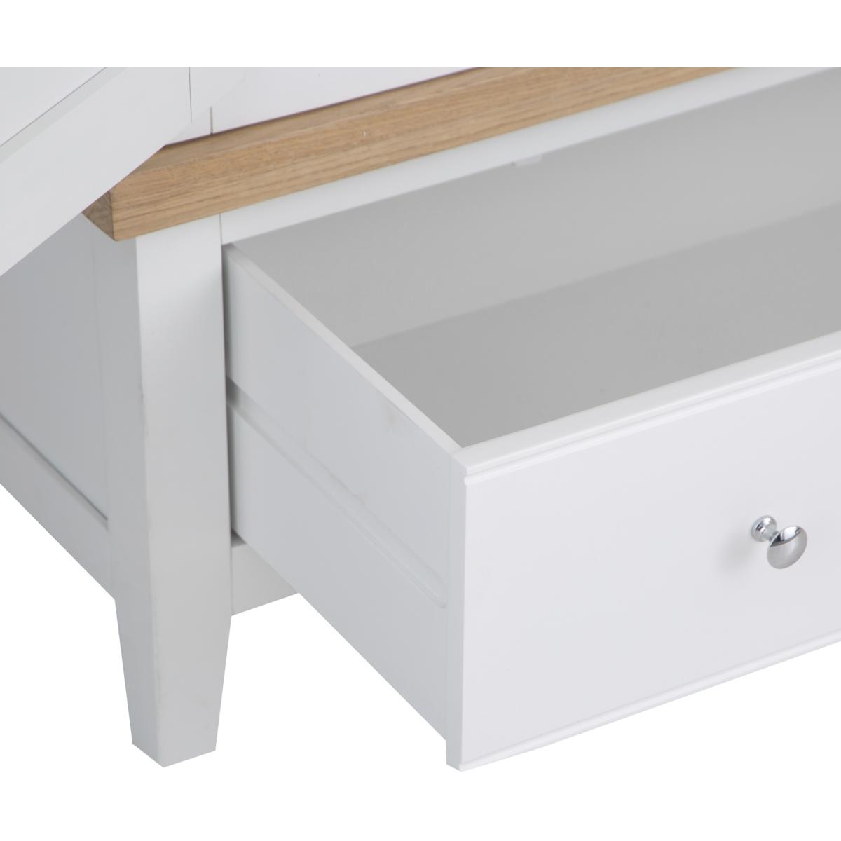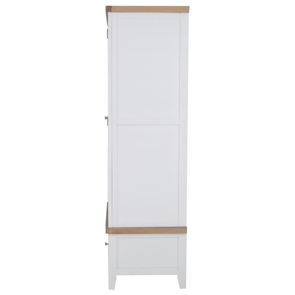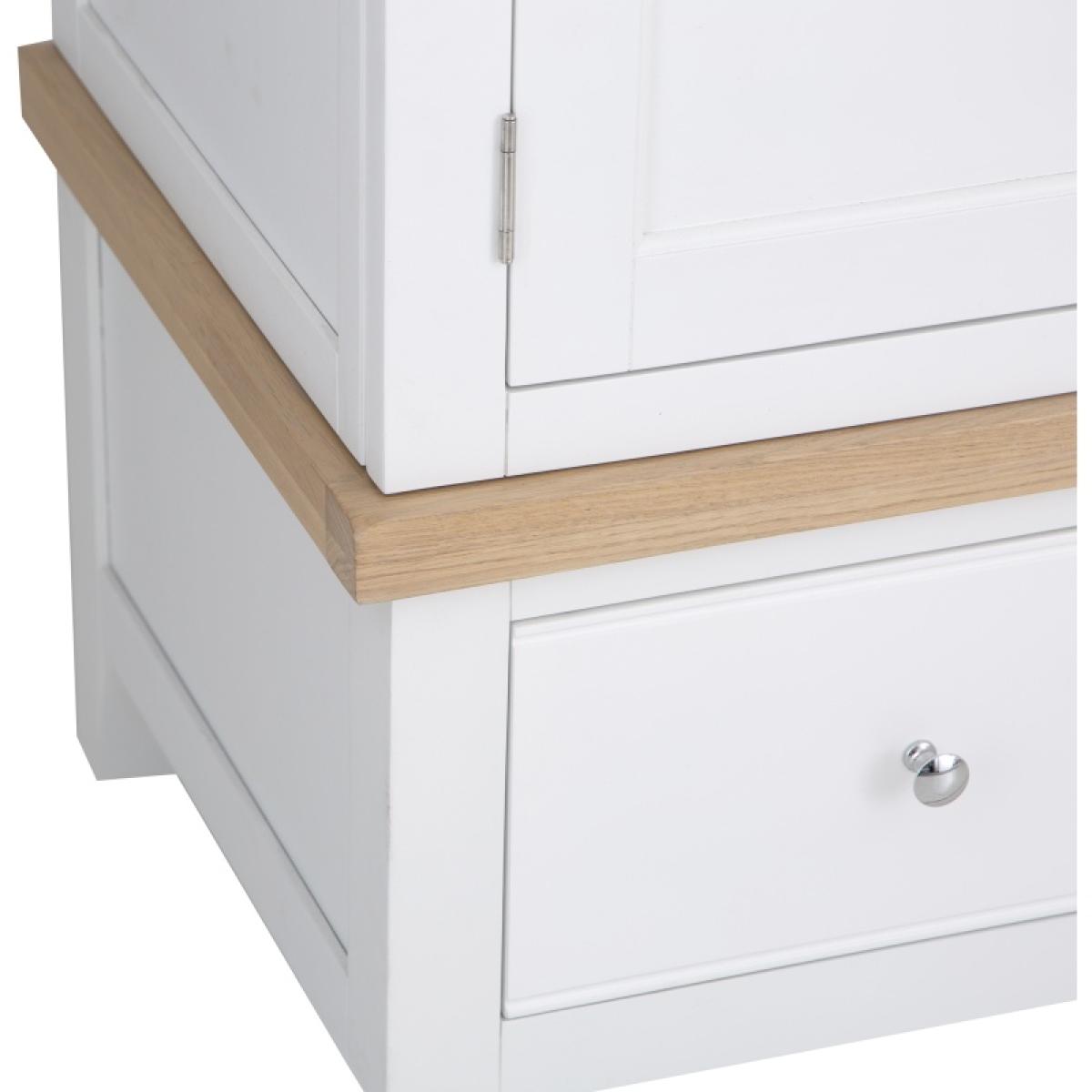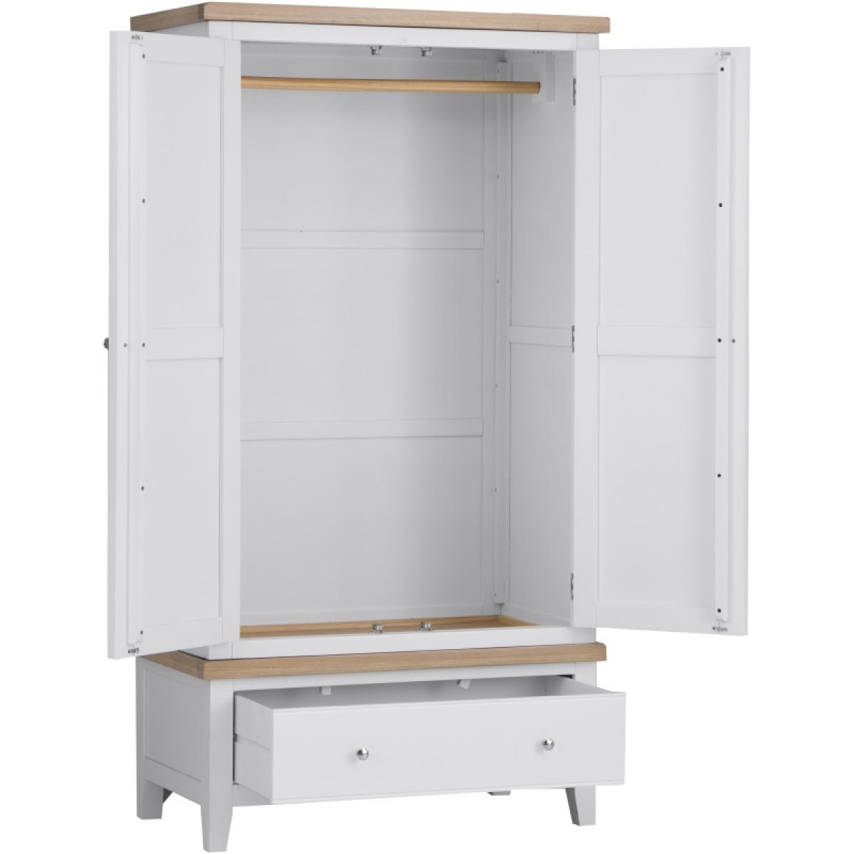 With washed oak tops and a beautifully painted finish and chrome elements, this bedroom collection seamlessly blends rustic warmth with contemporary design, adding a classic but stylish feel to any bedroom. The Easton 2 Door Wardrobe in White features chrome handles and a hardwood hanging rail. This range is also available in Grey. Features: Assembly required. Chrome Handles Hardwood Hanging Rail Clean Internal Finish Available in a White or Grey Finish. Quality Oak Top for Durability Modern Style Country Design Made From Solid Oak, Pine & Real Veneer Dimensions: Height: 190cm Width: 100cm Depth: 55cm All screens vary in colour reproduction and whilst every effort has been made to display the colour as accurately as possible it is for guidance only.