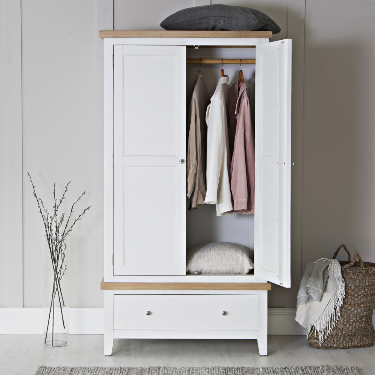 I love this classic white wardrobe for its clean, versatile look that easily complements a range of interior styles, from Scandi minimalism to traditionalising country spaces. Its neutral colour keeps the room feeling fresh and bright, making it ideal for smaller or more delicate spaces. Practical styling tips include adding open baskets or organisers inside for smaller items, and layering with textured throws or soft cushions on top to add a cosy touch. It works particularly well in bedrooms with light or neutral colour schemes, but can also serve as a statement piece in a more eclectic or colourful room with minimal fuss. The two-door design makes it a pragmatic choice for those seeking a simple yet functional furniture piece.