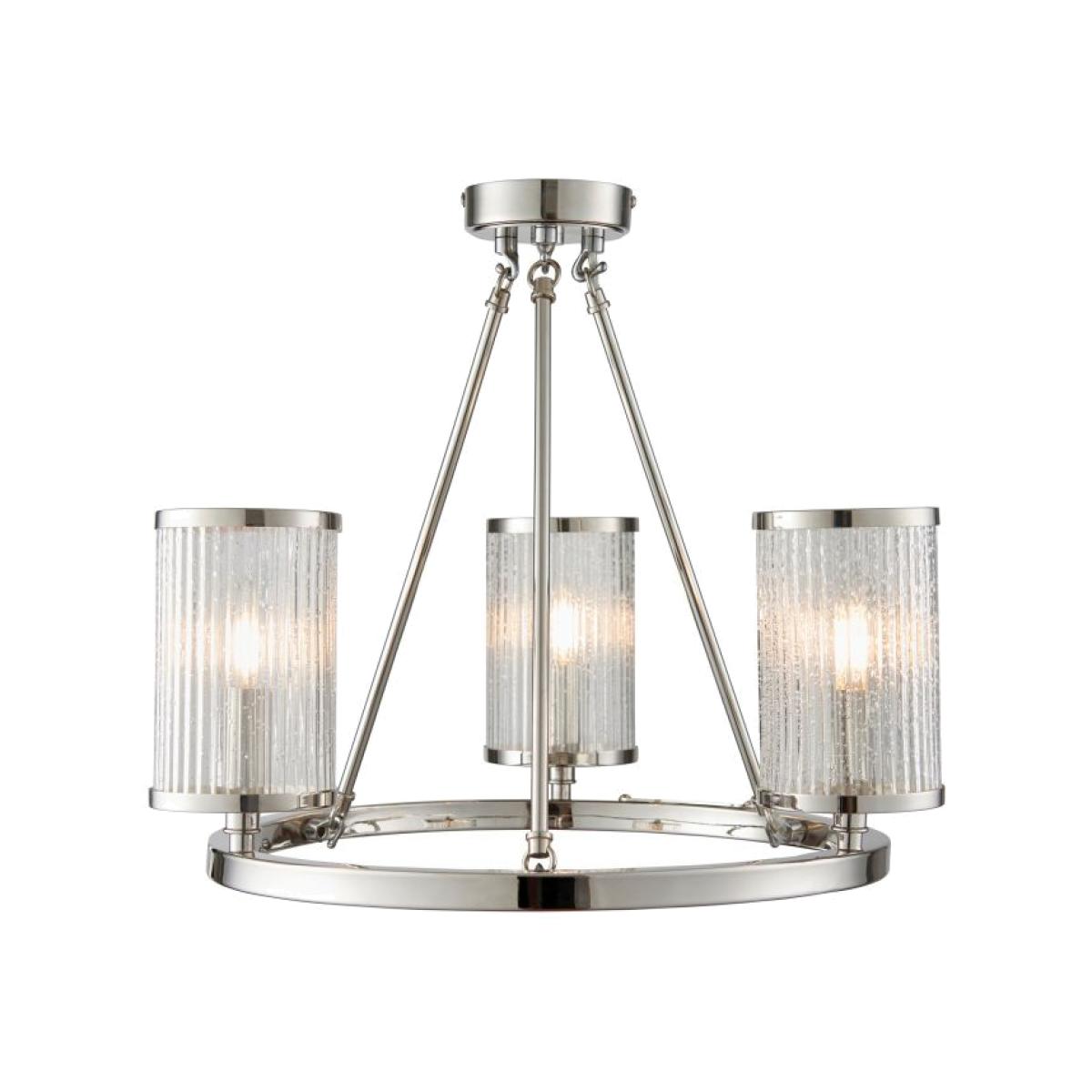 A unique classic styled chandelier in bright nickel plated finish. Inspired by hurricane lamps, the clear ribbed glass shades with bubble details create a perfect diffused light when lit by filament LED lamps. Each shade rests subtly on the rectangular section hoop and is suspended by three fixed arms.