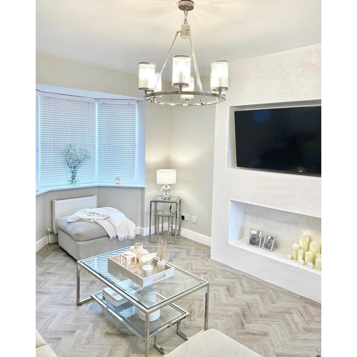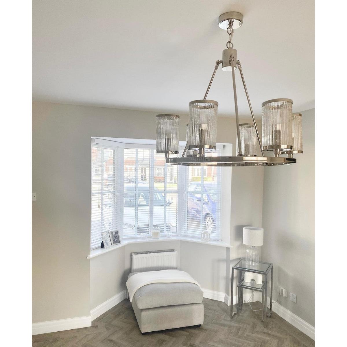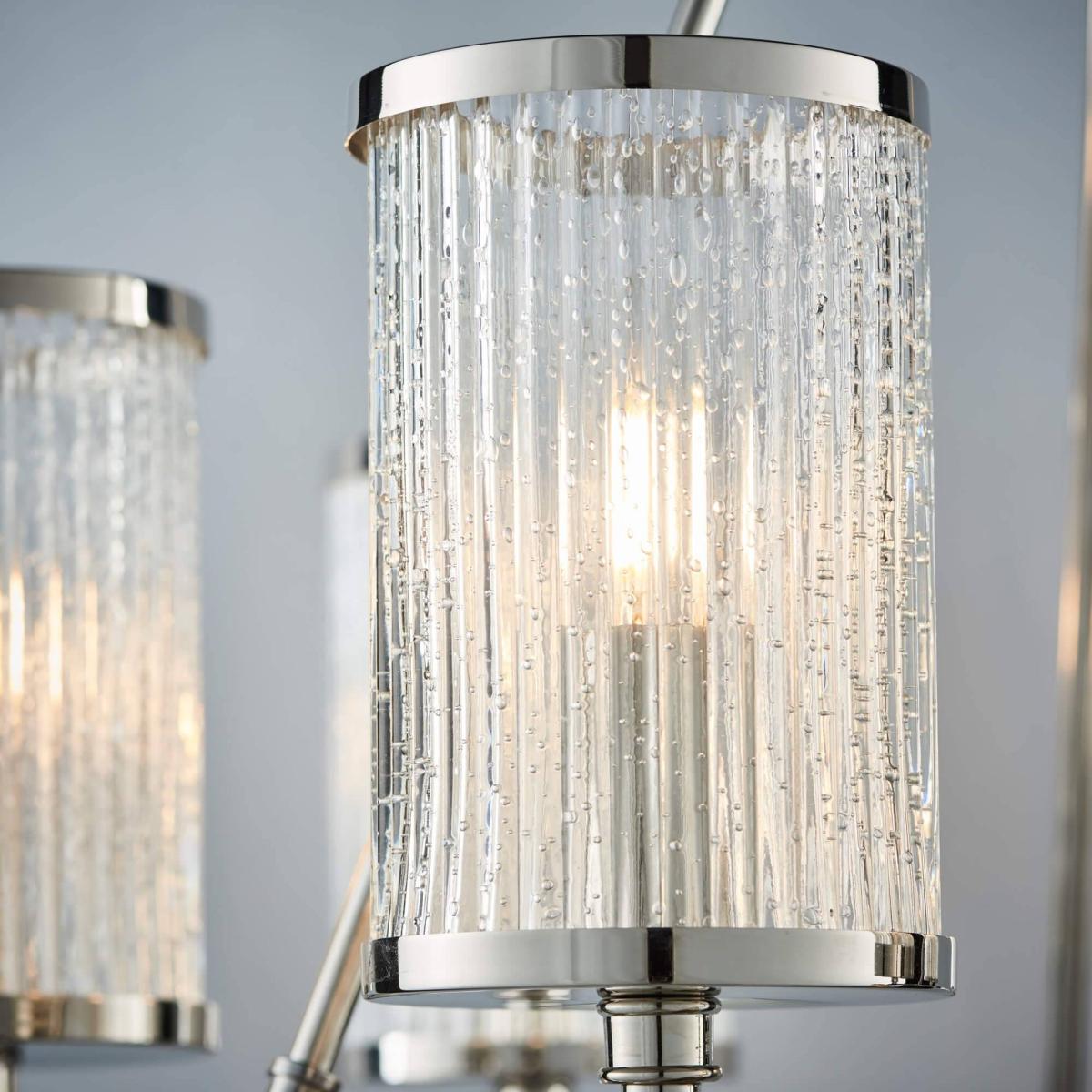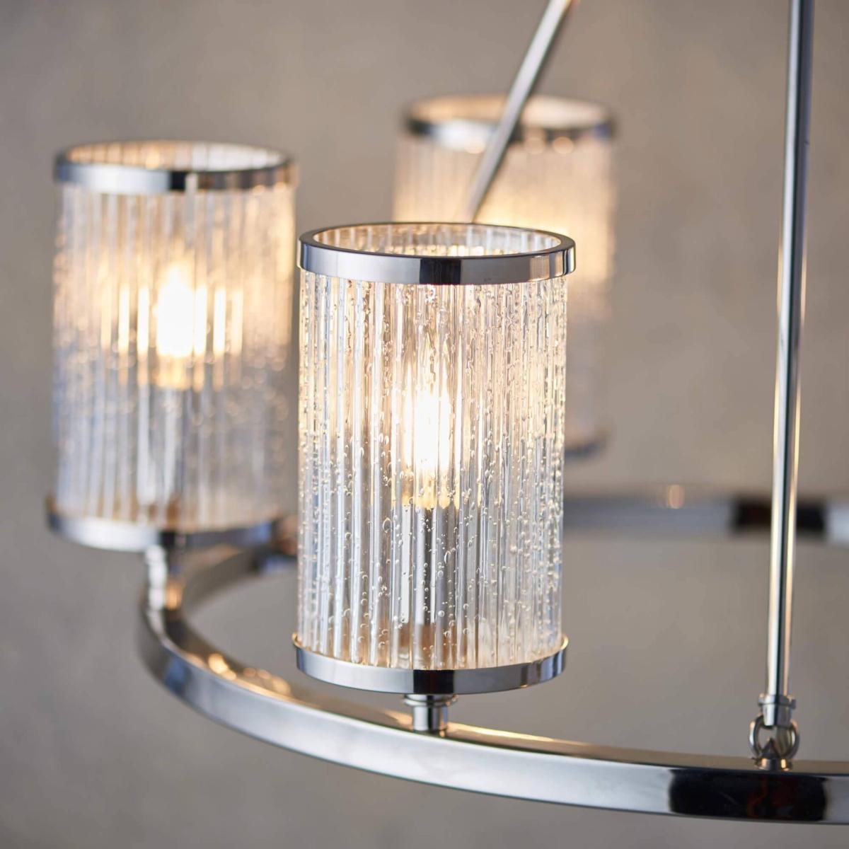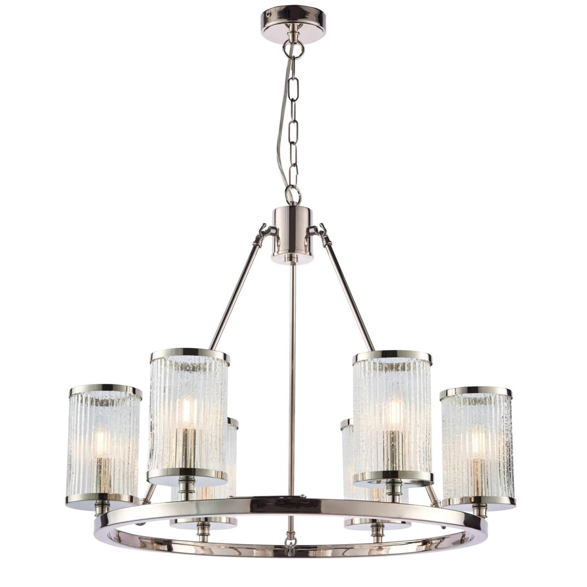 Modern Chandelier boasting a Polished Nickel finish. A striking addition to your living space, this chandelier is part of the Easton range from Endon. Finished in polished nickel throughout, the chandelier boasts a hollow hoop, of which is suspended by 3 fixed arms and supports 6 bubble detailed, clear glass ribbed shades. The chandelier is suspended by a decorative metal chain which can be adjusted in height. A beautiful piece sure to look amazing in hallways, lounges and above any dining table. Pagazzi recommends using our E14 4w LED Clear Candle bulbs for a crisp, clean light. Modern Chandelier boasting a Polished Nickel finish. A striking addition to your living space, this chandelier is part of the Easton range from Endon. Finished in polished nickel throughout, the chandelier boasts a hollow hoop, of which is suspended by 3 fixed arms and supports 6 bubble detailed, clear glass ribbed shades. The chandelier is suspended by a decorative metal chain which can be adjusted in height. A beautiful piece sure to look amazing in hallways, lounges and above any dining table. Pagazzi recommends using our E14 4w LED Clear Candle bulbs for a crisp, clean light.
