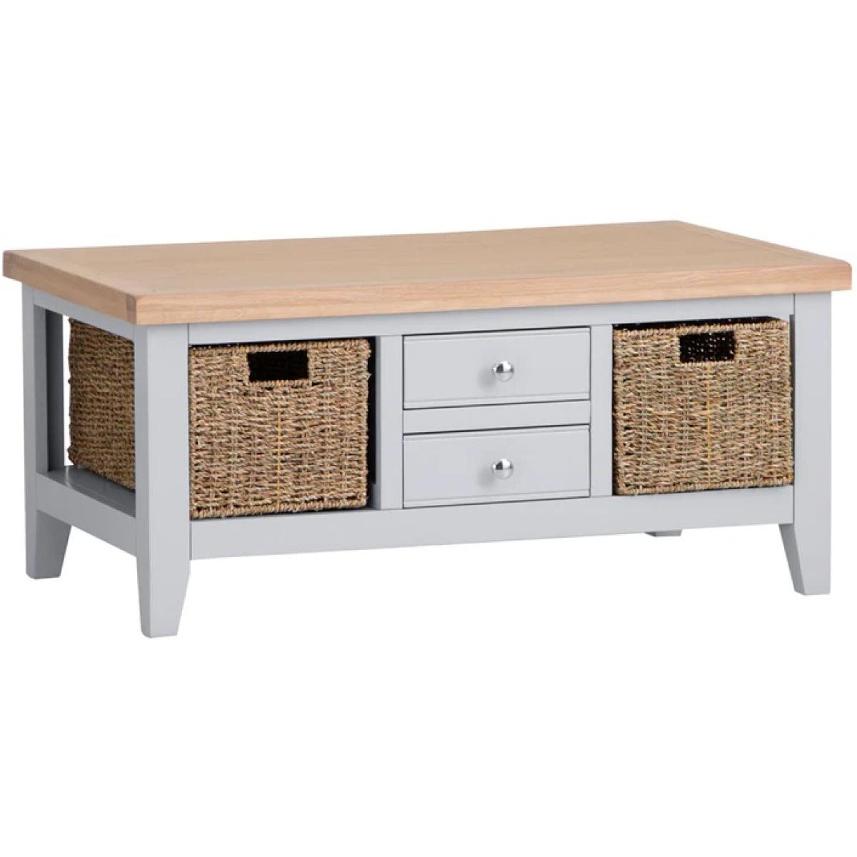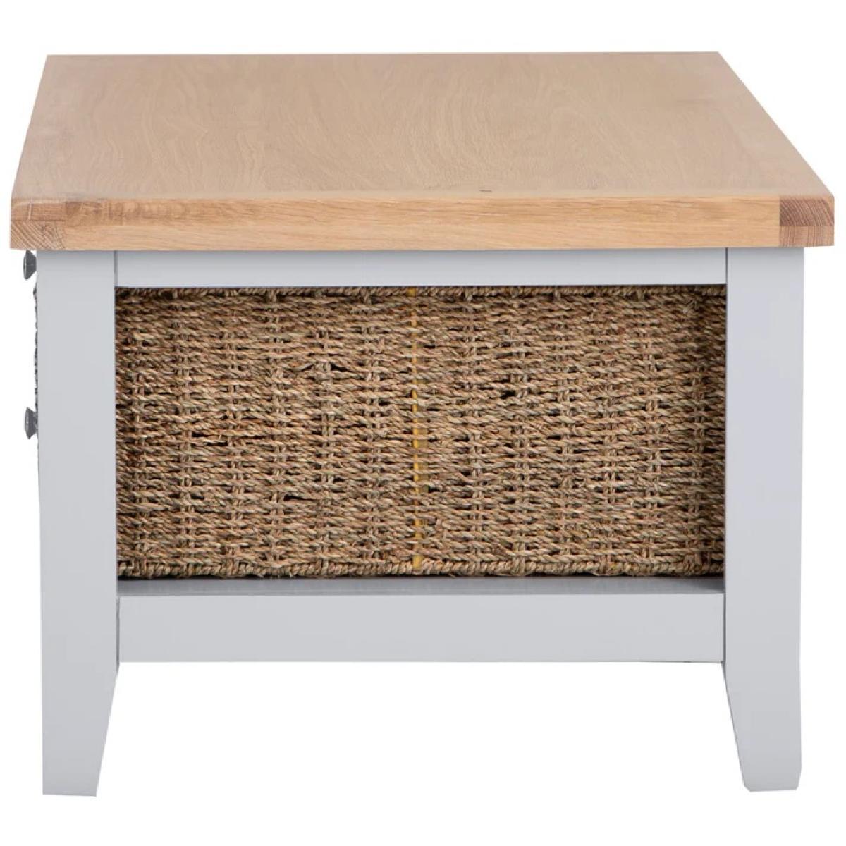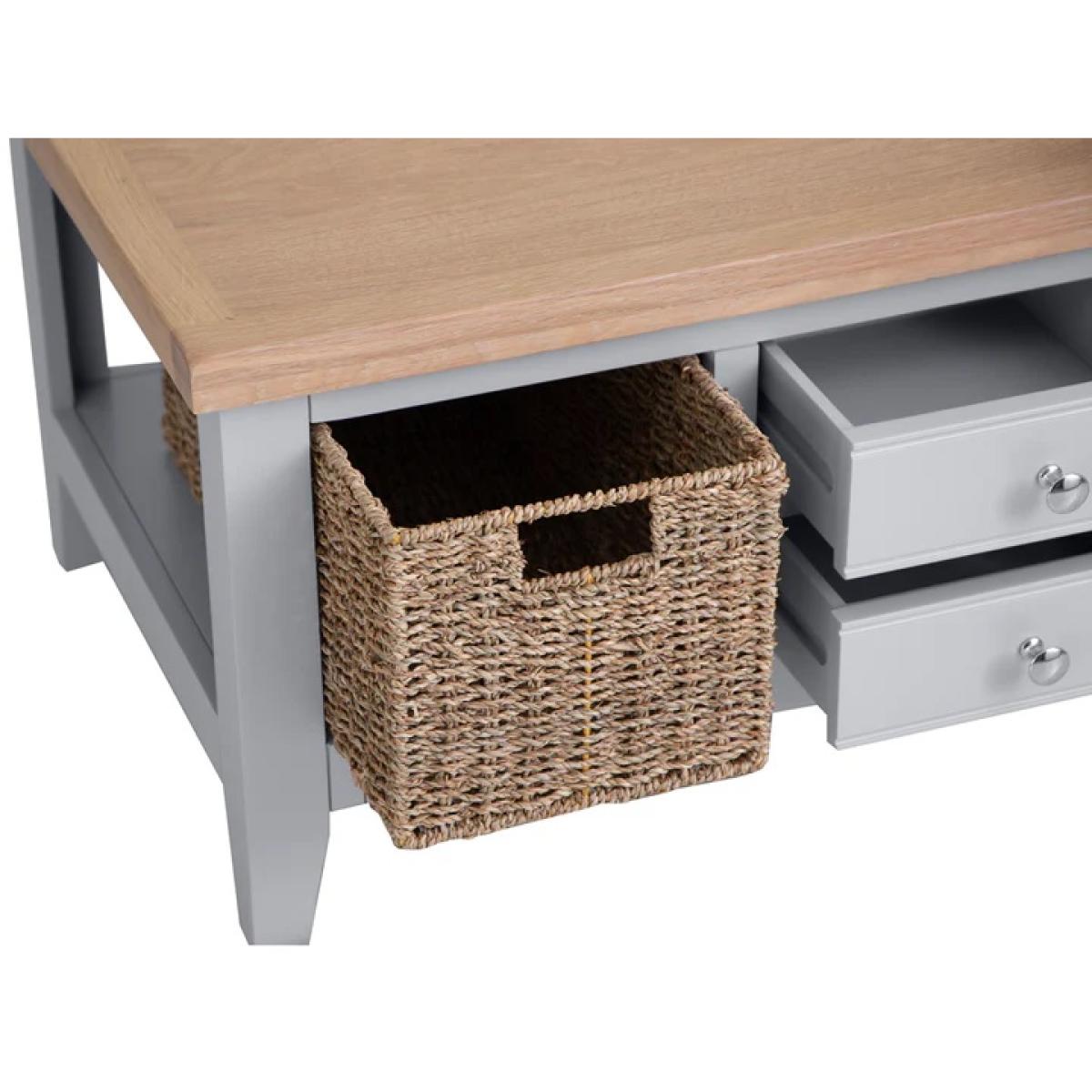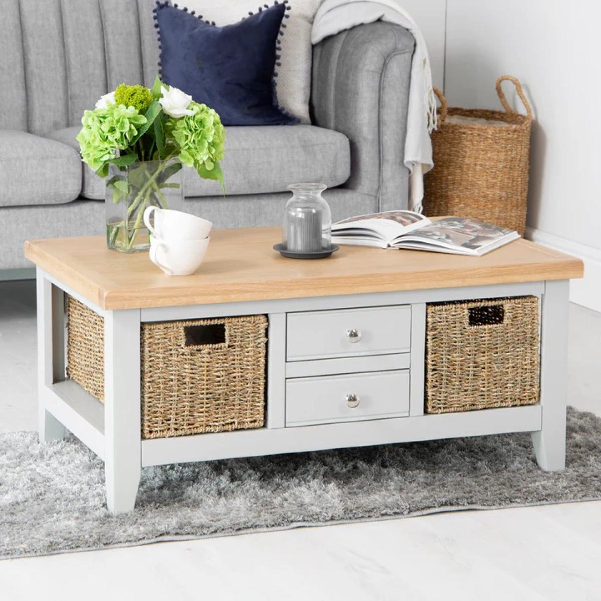I really like this one because of its versatile design and practical storage options. The grey top gives it a neutral, contemporary feel that works well in both modern and coastal schemes. It’s perfect for adding a relaxed touch to living rooms, especially when paired with light or pastel colour palettes. I’d suggest styling it with a few decorative books, a vase of fresh flowers (like in the image) or a cosy tray for remotes and essentials. Its built-in drawers and open baskets make it functional for keeping clutter at bay, while its size is ideal for smaller spaces or as a central piece in larger open-plan rooms. Overall, it’s a practical and stylish addition that can adapt to a variety of interior styles.