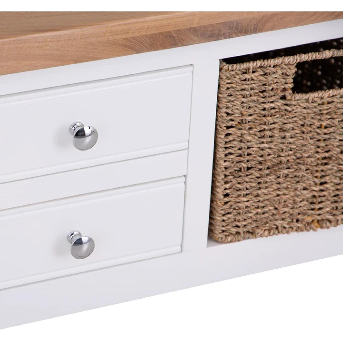 With washed oak tops and a beautifully painted finish and chrome elements, this collection seamlessly blends rustic warmth with contemporary design, adding a classic but stylish feel to any living space. This Easton Coffee Table in White features chrome handles. This range is also available in Grey. Features:  No assembly required. Chrome Handles Available in a White or Grey Finish. Quality Oak Top for Durability Modern Style Country Design Made From Solid Oak, Pine & Real Veneer Dimensions: Height: 45cm Width: 100cm Depth: 60cm All screens vary in colour reproduction and whilst every effort has been made to display the colour as accurately as possible it is for guidance only.