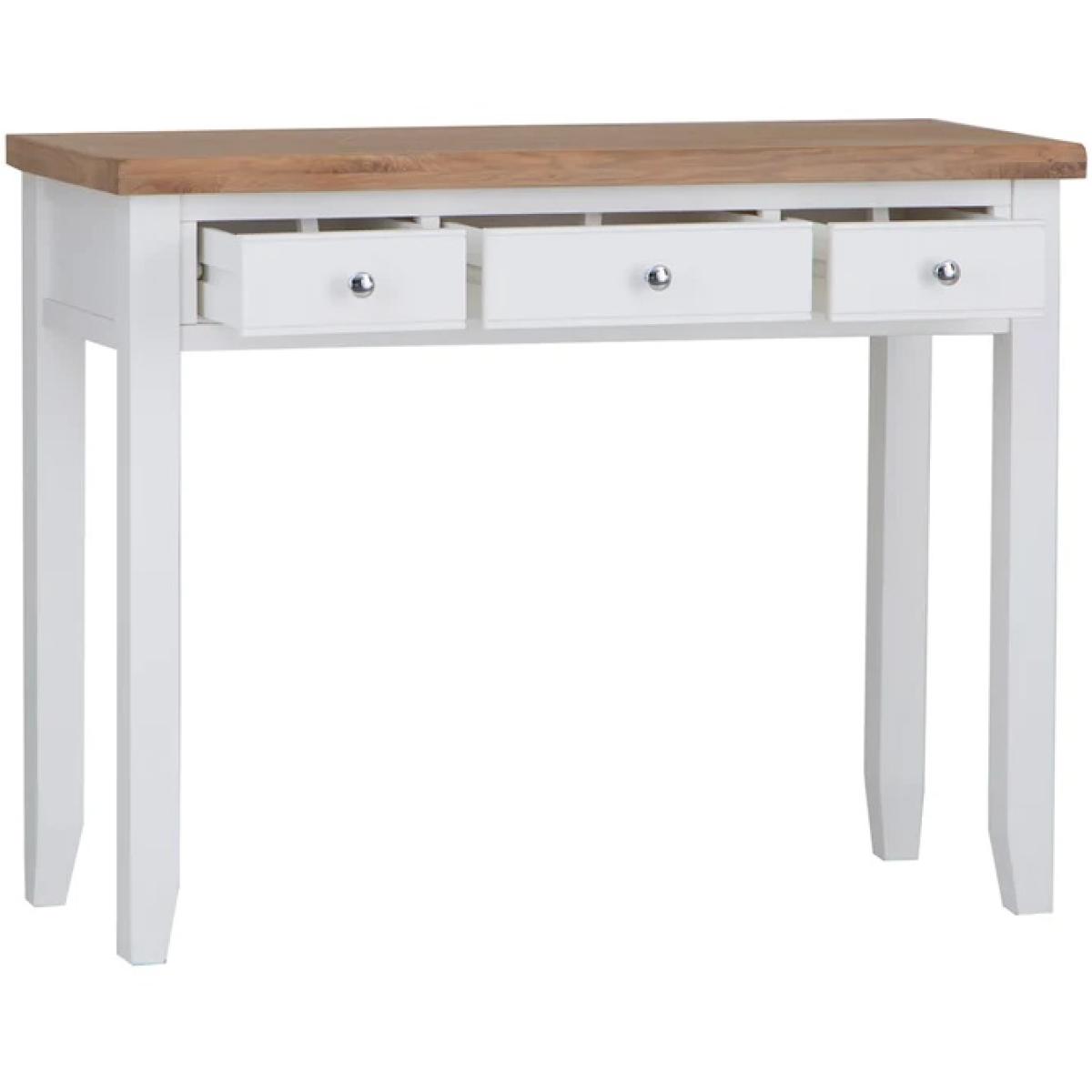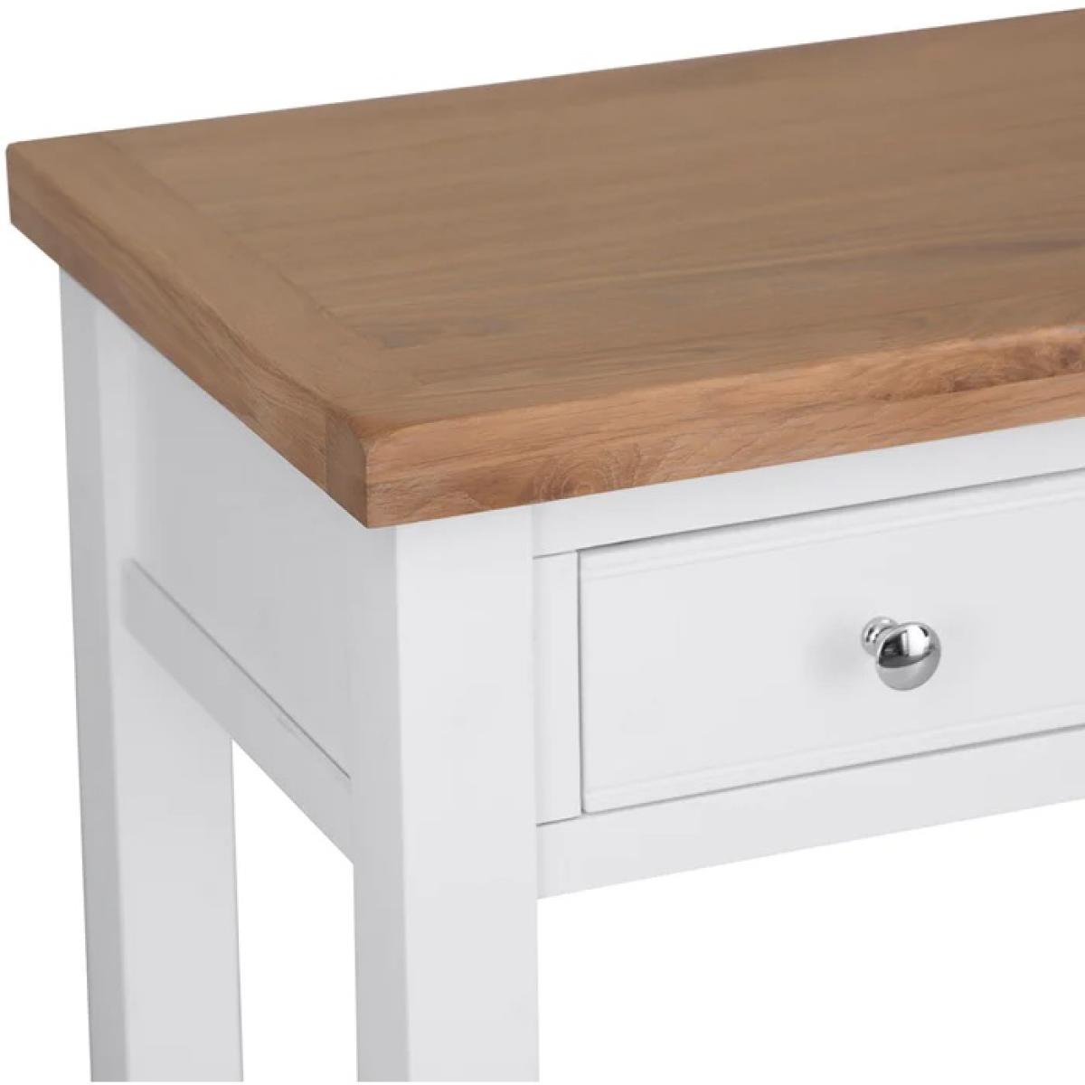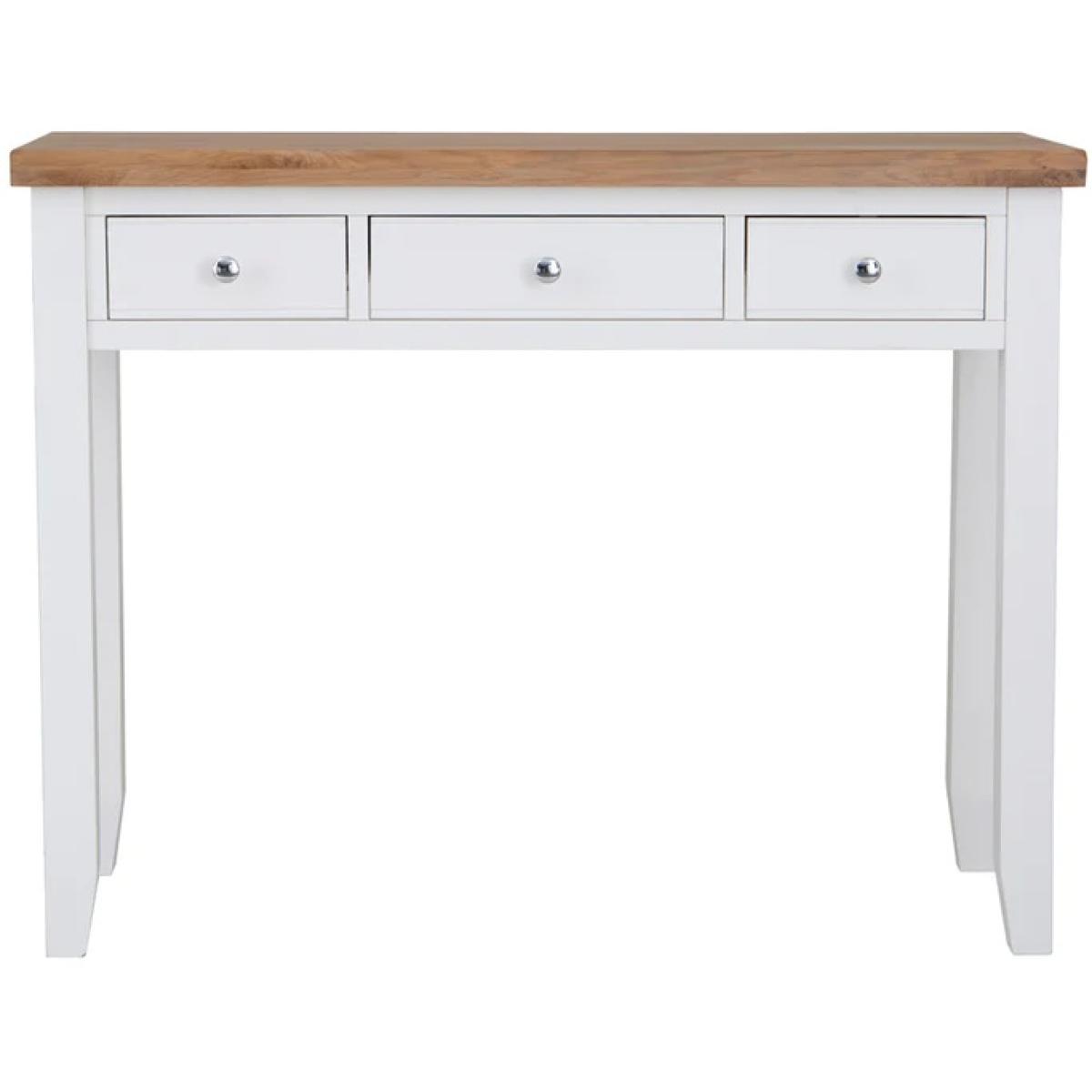 With washed oak tops and a beautifully painted finish and chrome elements, this bedroom collection seamlessly blends rustic warmth with contemporary design, adding a classic but stylish feel to any bedroom. The Easton Dressing Table in White features chrome cup handles. This range is also available in Grey. Features:. *Assembly Required *Chrome cup handles *Available in a White or Grey Finish. *Quality Oak Top for Durability *Modern Style Country Design *Made From Solid Oak, Pine Real Veneer Dimensions:. *Height: 85cm *Width: 110cm *Depth: 42cm All screens vary in colour reproduction and whilst every effort has been made to display the colour as accurately as possible it is for guidance only.