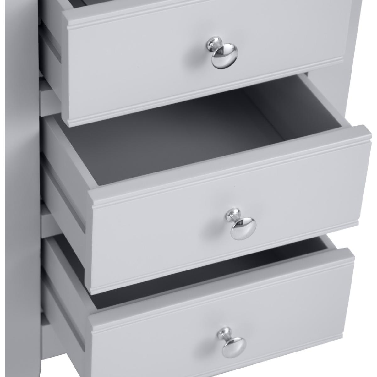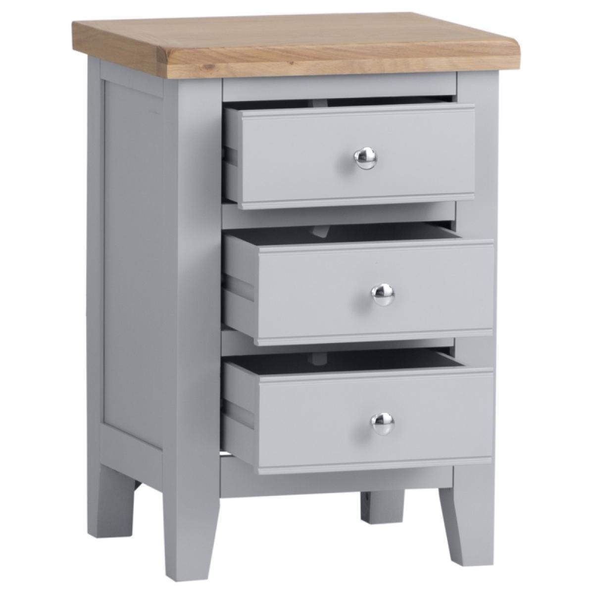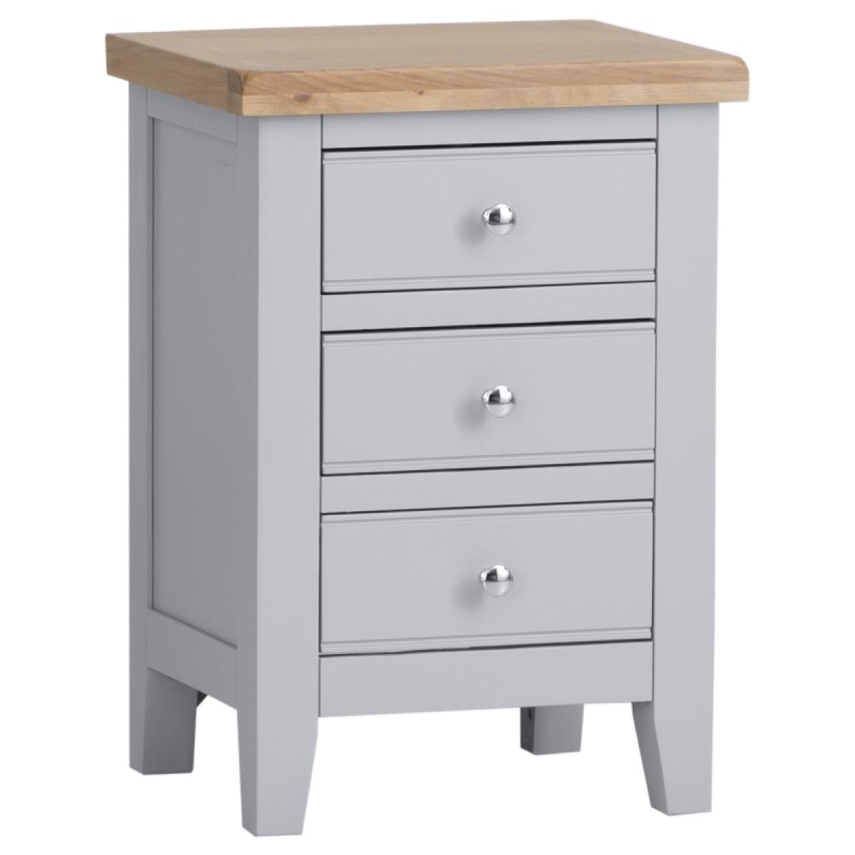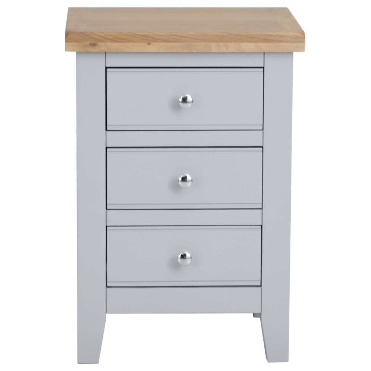 With washed oak tops and a beautifully painted finish and chrome elements, this bedroom collection seamlessly blends rustic warmth with contemporary design, adding a classic but stylish feel to any bedroom. The Easton Large Bedside Cabinet features chrome cup handles. This range is also available in White. Features:. *Fully Assembled *Chrome cup handles *Available in a White or Grey Finish. *Spacious Storage with 3 Drawers *Quality Oak Top for Durability *Modern Style Country Design *Made From Solid Oak, Pine Real Veneer. Dimensions:. *Height: 65cm *Width: 45cm *Depth: 38cm All screens vary in colour reproduction and whilst every effort has been made to display the colour as accurately as possible it is for guidance only.