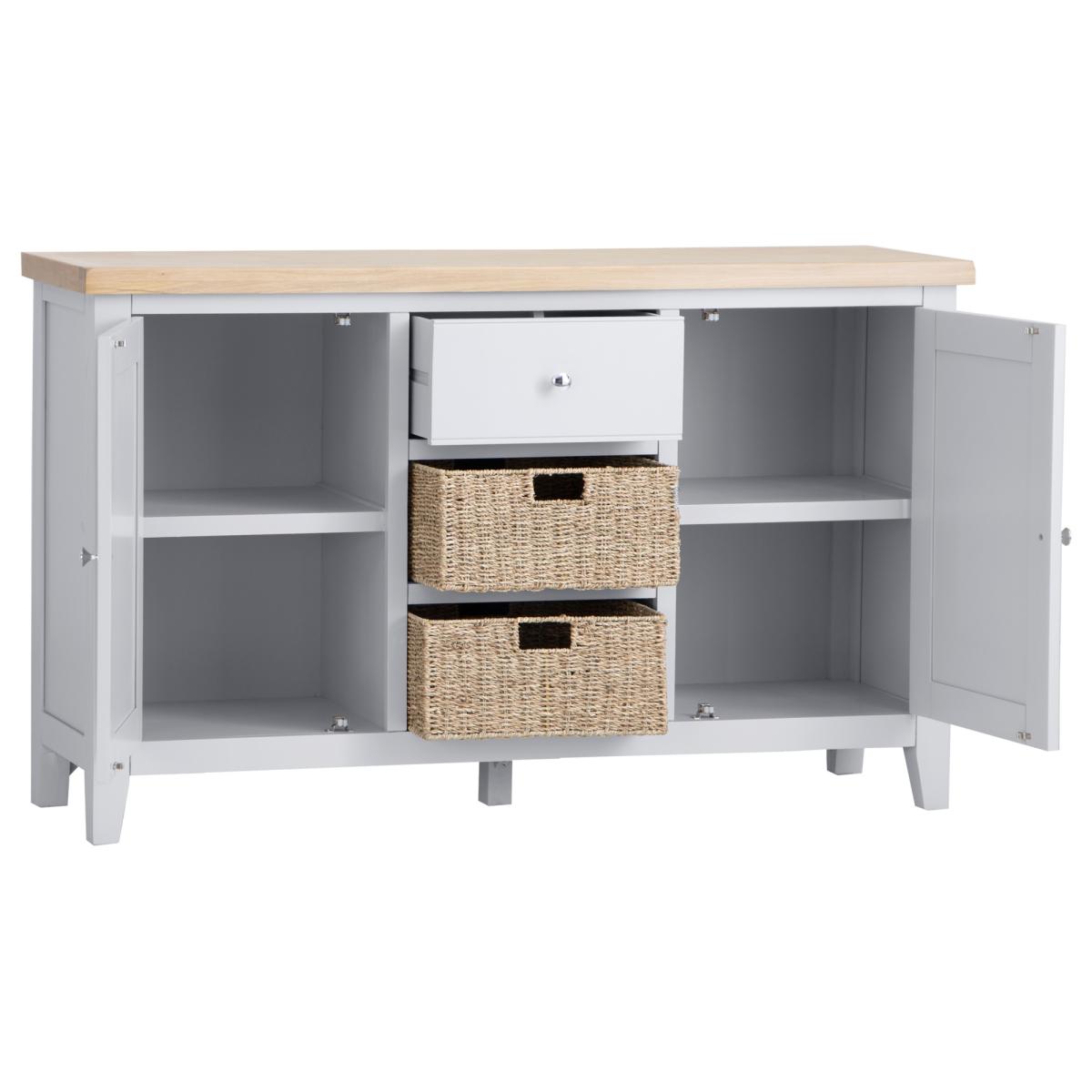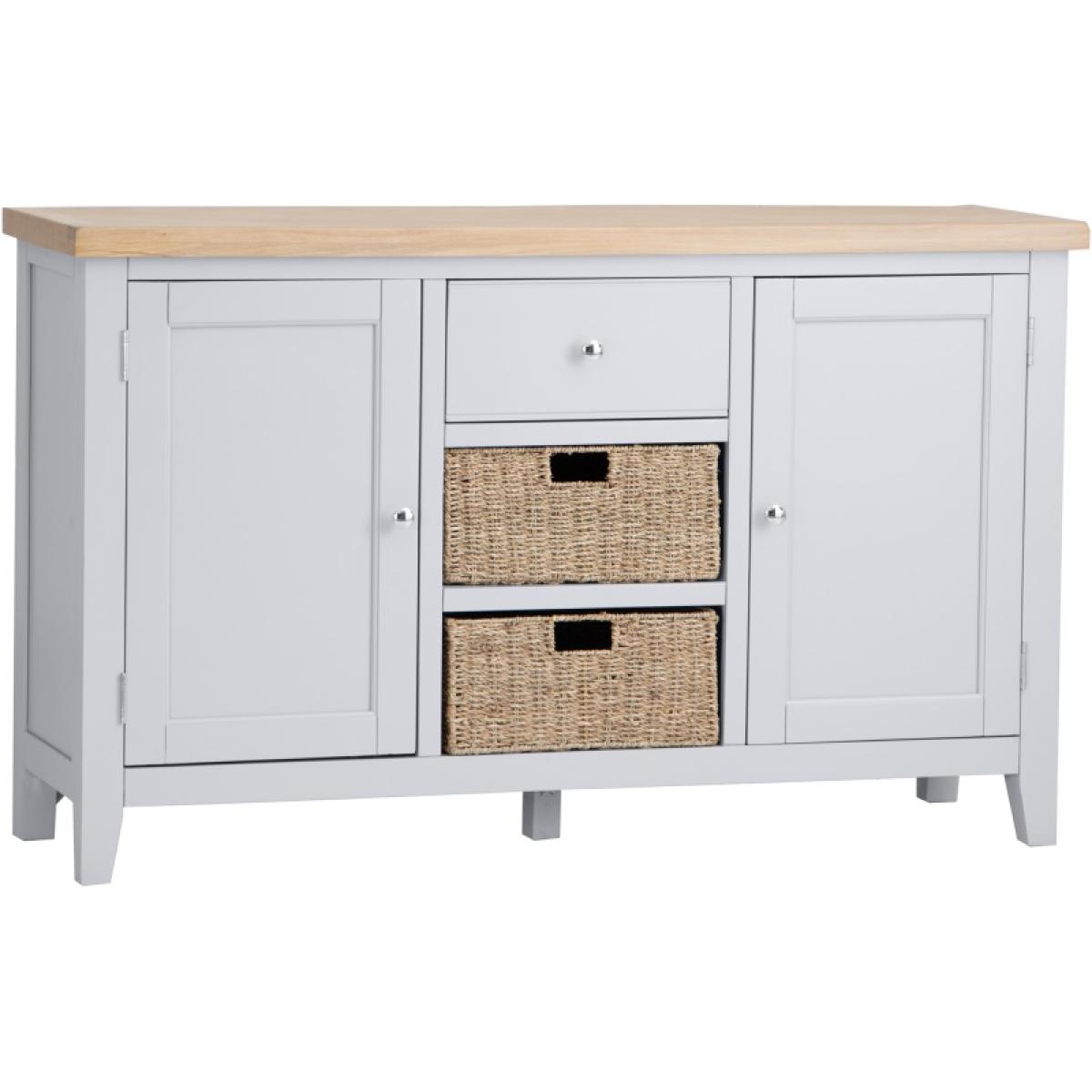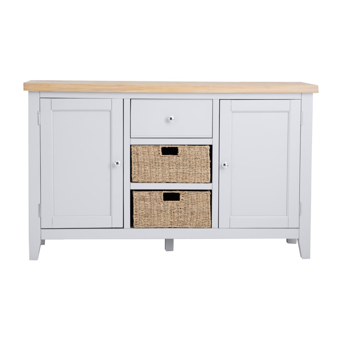 With washed oak tops and a beautifully painted finish and chrome elements, this dining collection seamlessly blends rustic warmth with contemporary design, adding a classic but stylish feel to any dining space. The Easton Large Sideboard in Grey features wicker baskets for storage and tapered legs. This range is also available in White Features: Fully Assembled Tapered Legs Wicker Baskets for Storage Available in a White or Grey Finish. Quality Oak Top for Durability Modern Style Country Design Made From Solid Oak, Pine & Real Veneer. Dimensions: Height: 85cm Width: 140cm Depth: 40cm All screens vary in colour reproduction and whilst every effort has been made to display the colour as accurately as possible it is for guidance only.