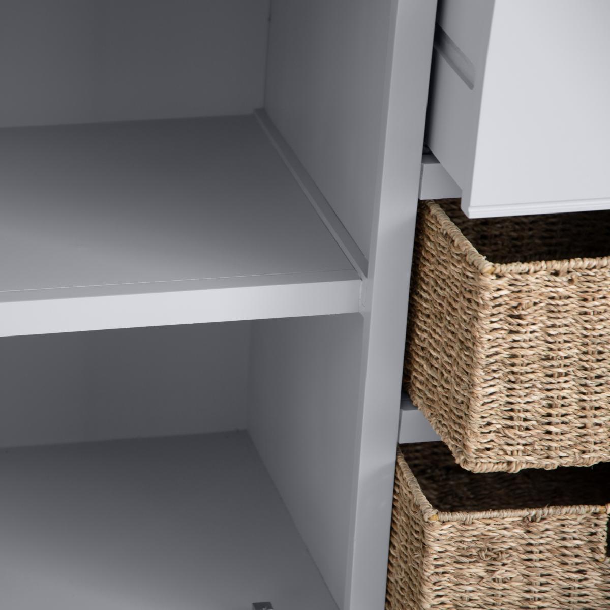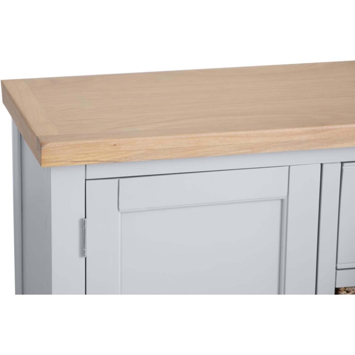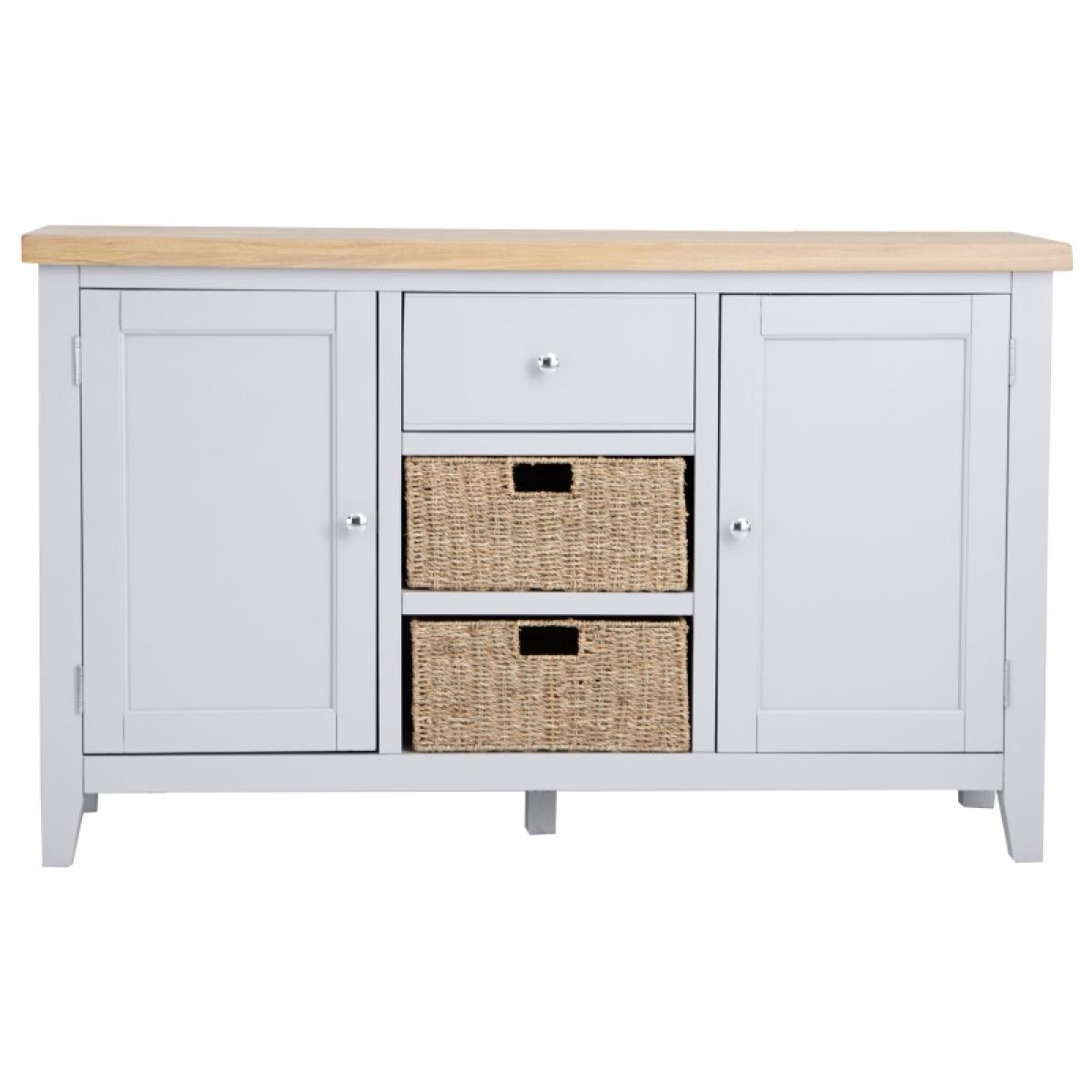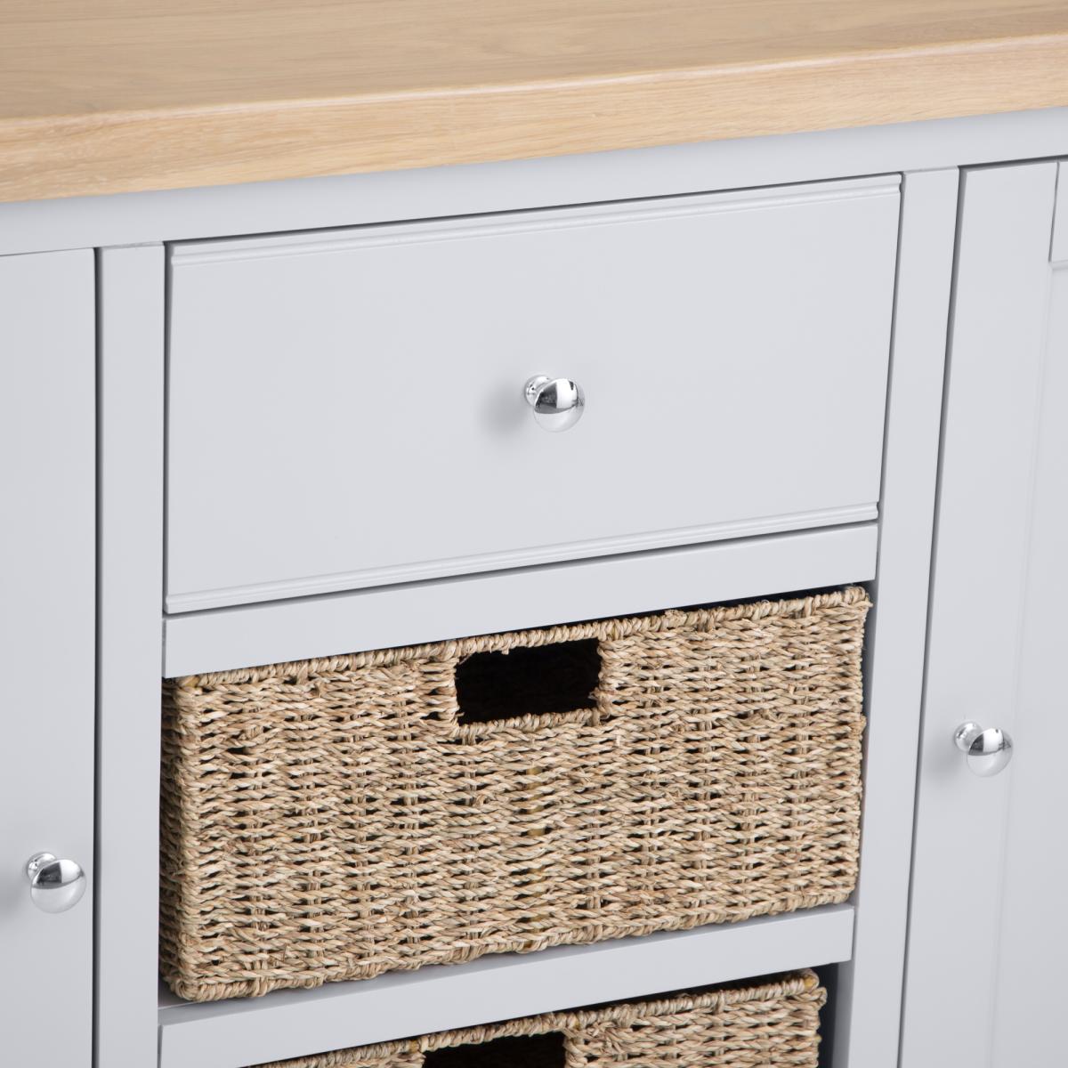 With washed oak tops and a beautifully painted finish and chrome elements, this dining collection seamlessly blends rustic warmth with contemporary design, adding a classic but stylish feel to any dining space. The Easton Large Sideboard in Grey features wicker baskets for storage and tapered legs. This range is also available in White Features: Fully Assembled Tapered Legs Wicker Baskets for Storage Available in a White or Grey Finish. Quality Oak Top for Durability Modern Style Country Design Made From Solid Oak, Pine & Real Veneer. Dimensions: Height: 85cm Width: 140cm Depth: 40cm All screens vary in colour reproduction and whilst every effort has been made to display the colour as accurately as possible it is for guidance only.