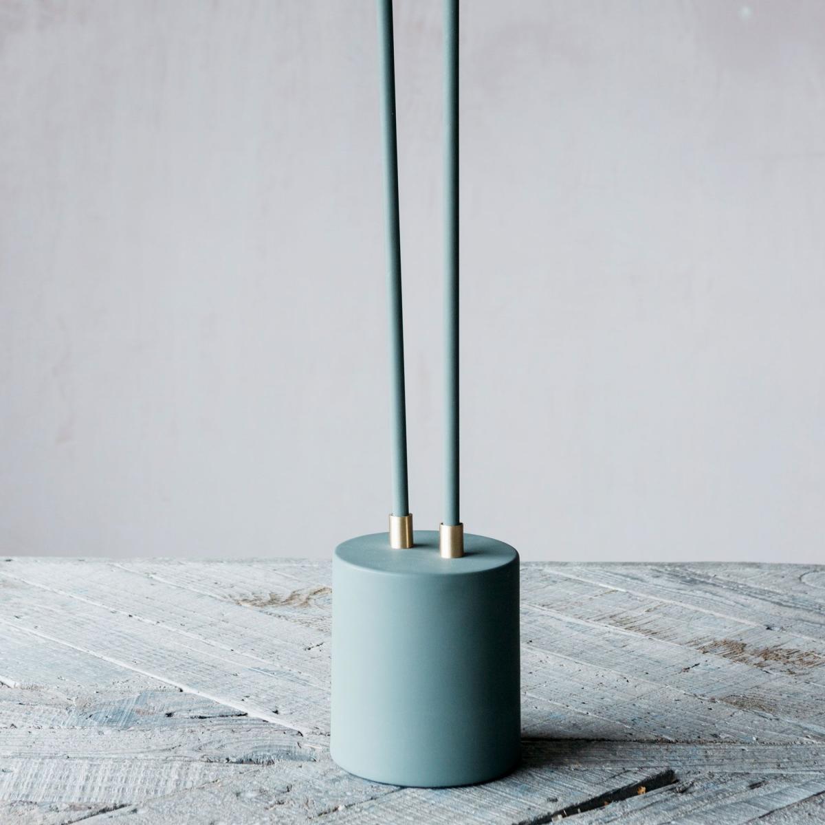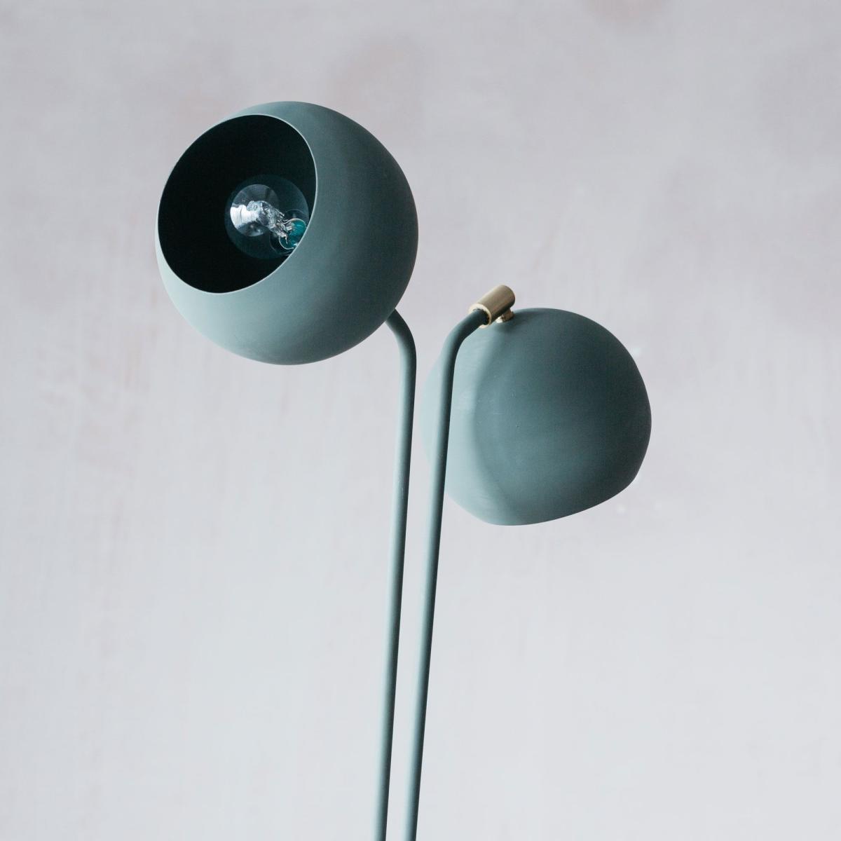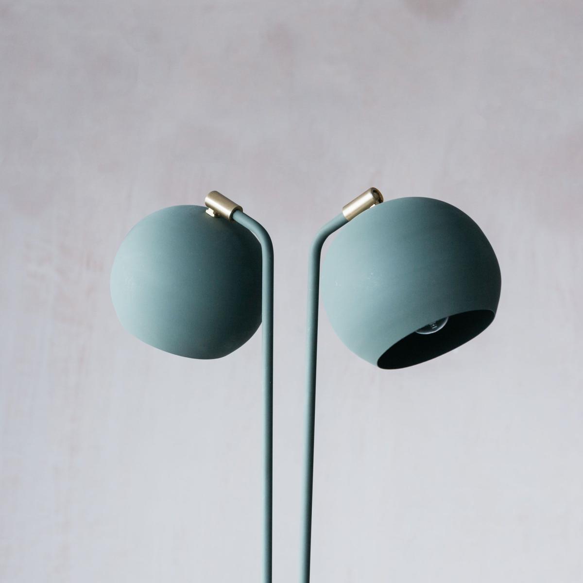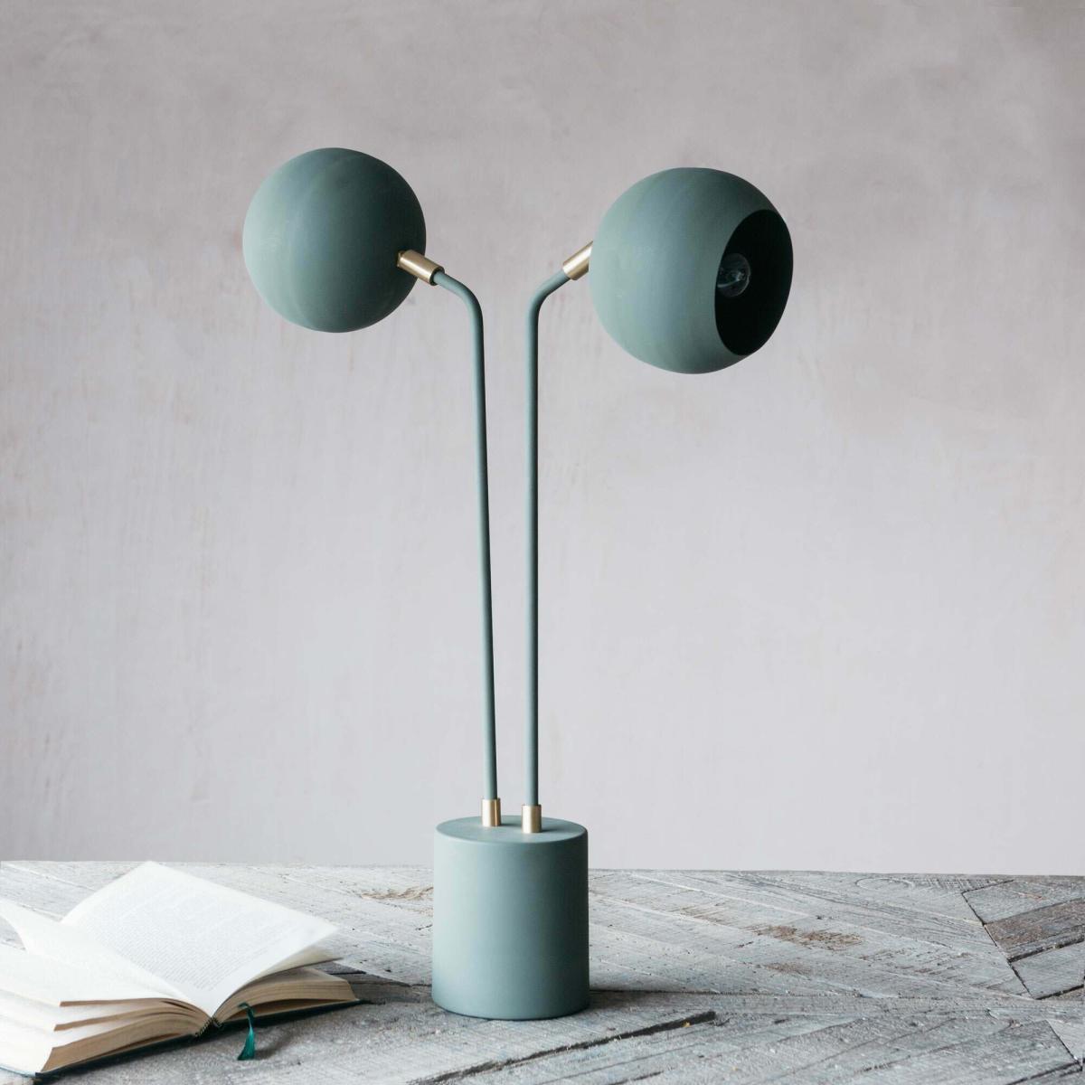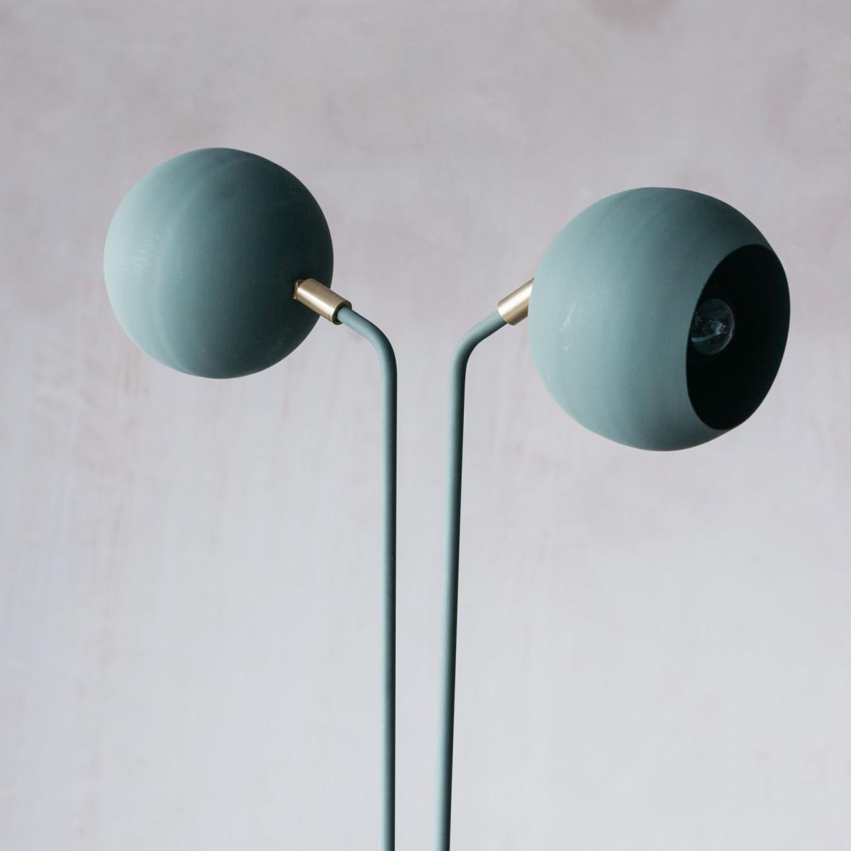 Two budding domed shades emerge from the lichen-green base of this table lamp, ideal for sharing soft ambient lighting in a home office or a bedroom. H56 x W13 x L44. Made of brass and iron with a powder coated finish. Requires 2 x E14 MAX 7W (not included). Diameter of base: 10. 5cm. Weight: 2. 5kg. Black fabric cord: 2. 5m (not adjustable). Switch located 40cm from base. Clean with a soft dry cloth.