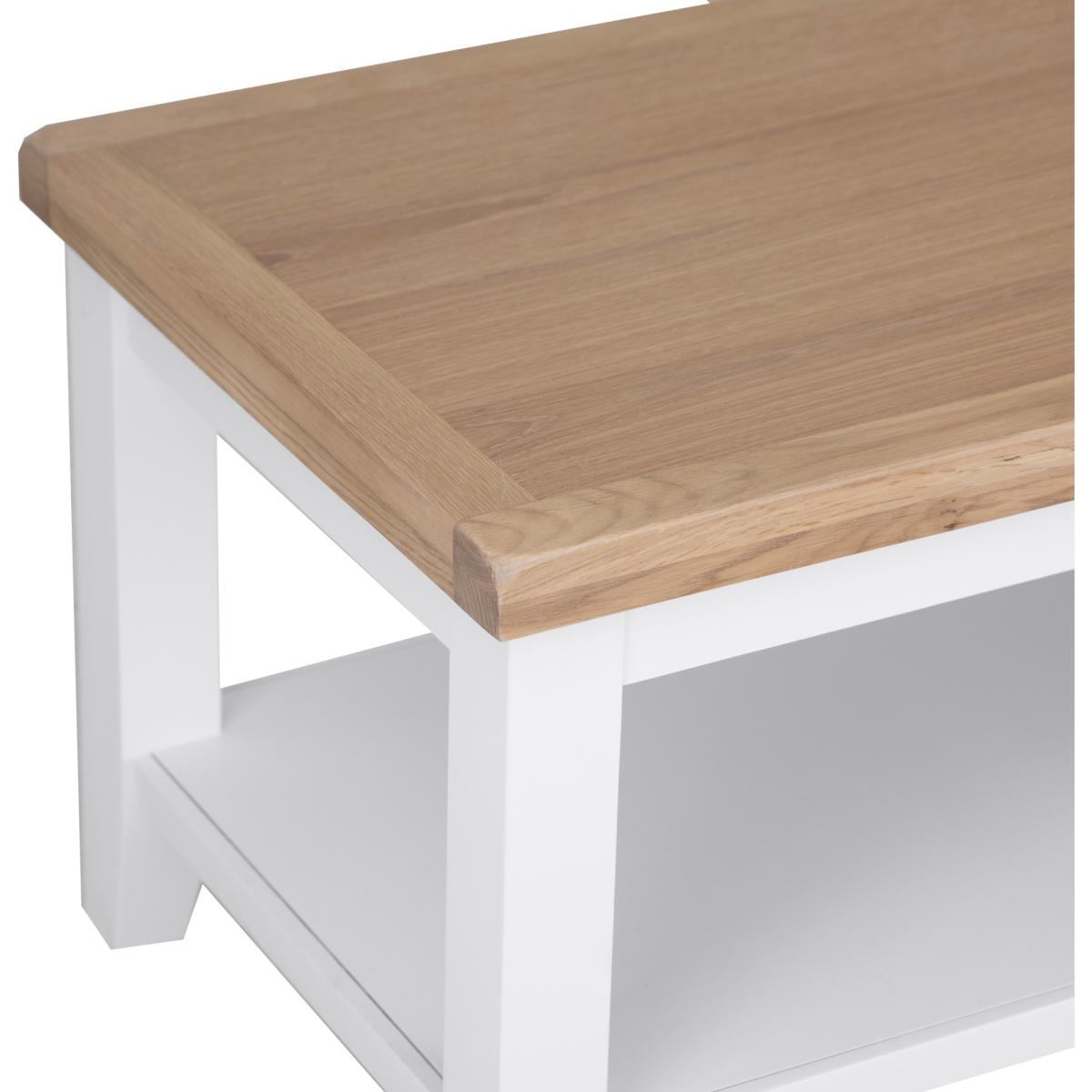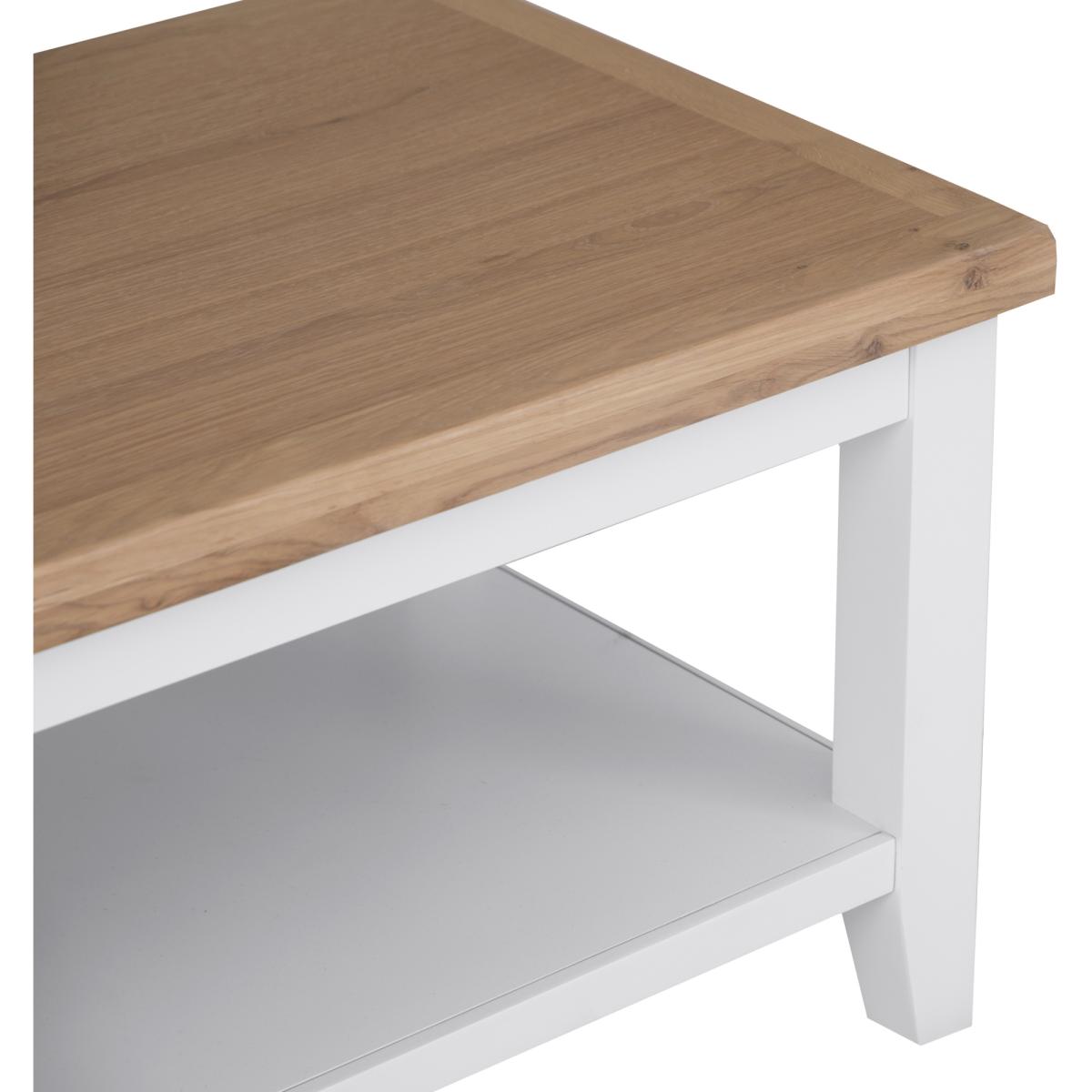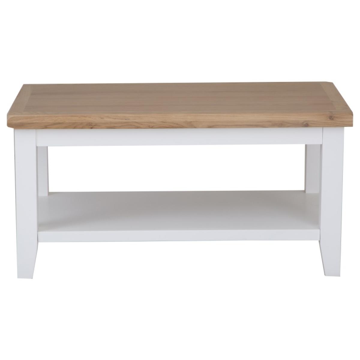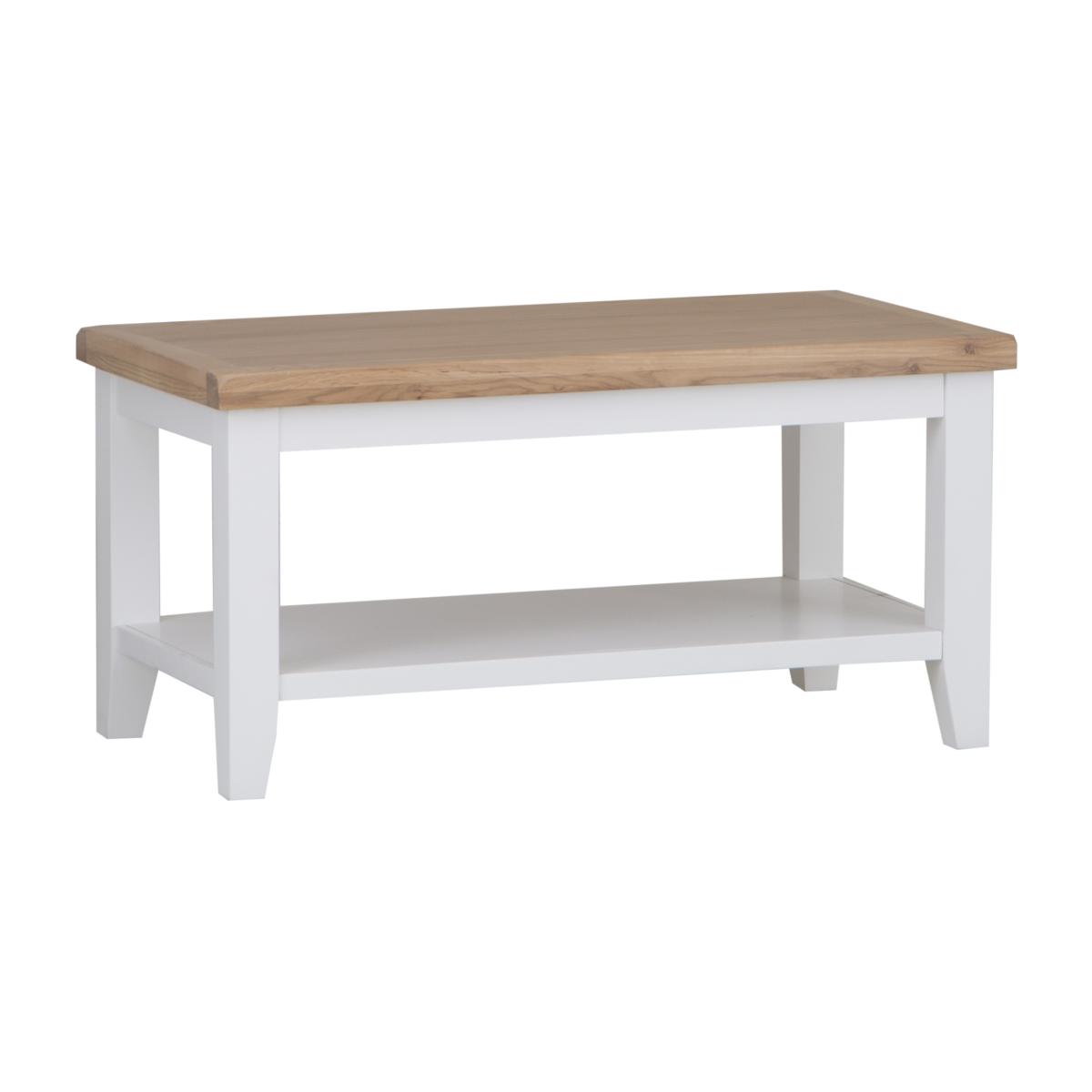 With washed oak tops and a beautifully painted finish and chrome elements, this collection seamlessly blends rustic warmth with contemporary design, adding a classic but stylish feel to any living space. The Easton Small Coffee Table in White features a low newspaper shelf for extra storage space. This range is also available in Grey. Features: Fully Assembled Low newspaper shelf for extra storage space Available in a White or Grey Finish Quality Oak Top for Durability Modern Style Country Design Made From Solid Oak, Pine & Real Veneer. Dimensions: Height: 45cm Width: 90cm Depth: 50cm All screens vary in colour reproduction and whilst every effort has been made to display the colour as accurately as possible it is for guidance only.