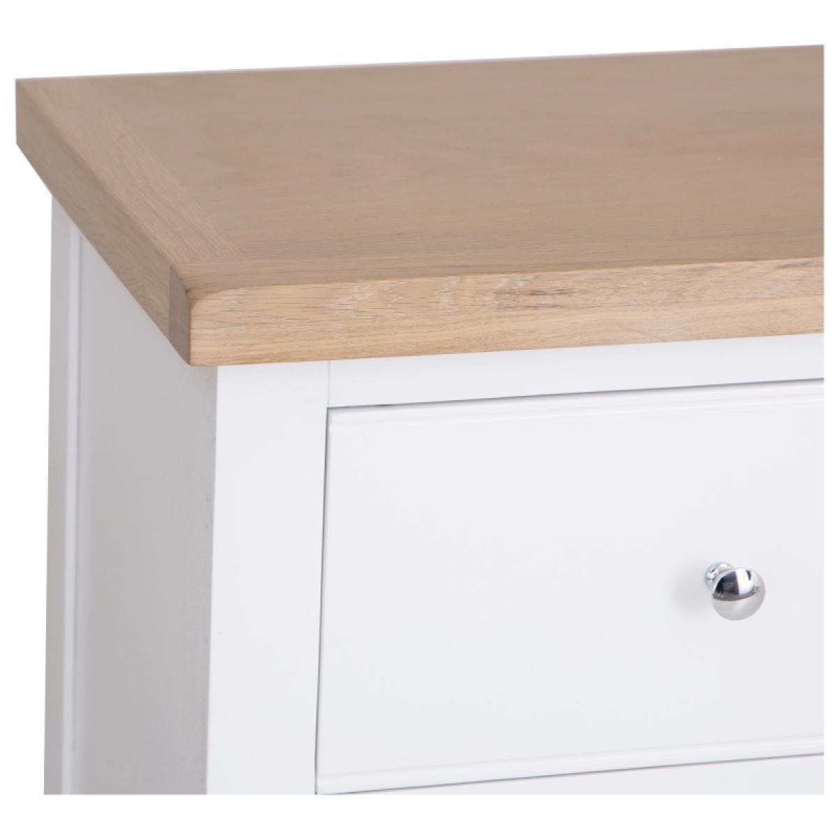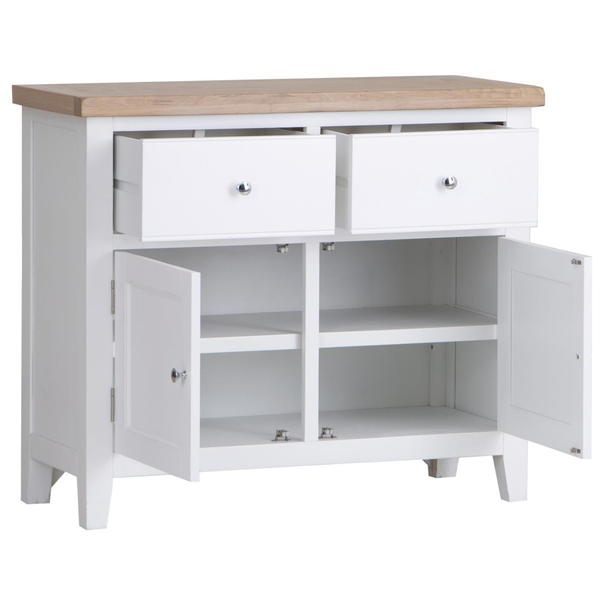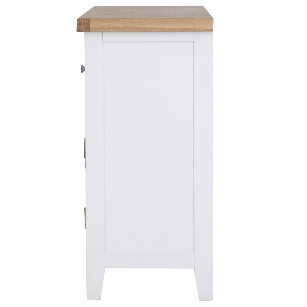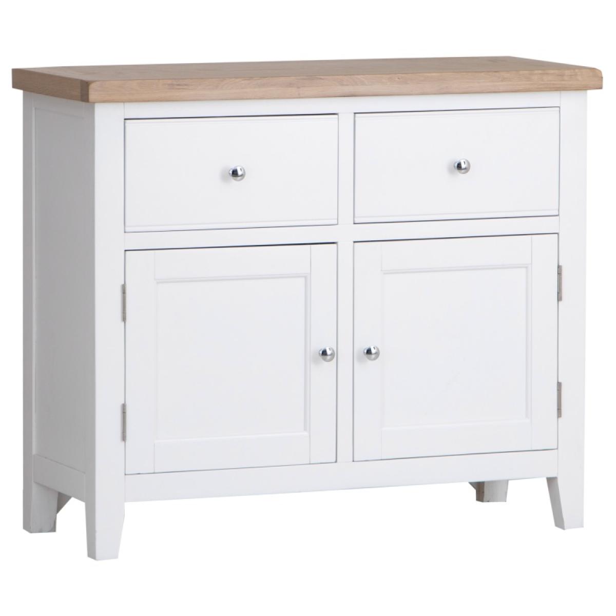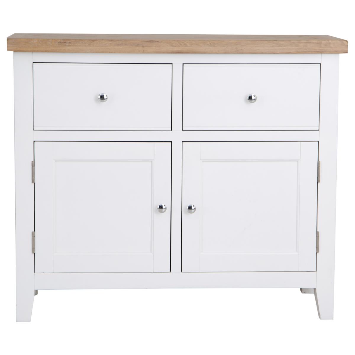 With washed oak tops and a beautifully painted finish and chrome elements, this dining collection seamlessly blends rustic warmth with contemporary design, adding a classic but stylish feel to any dining space. The Easton Standard Sideboard in White features chrome handles and 2 dovetailed drawers on wooden guides. This range is also available in Grey. Features: Fully Assembled 2 Dovetailed drawers on wooden guides Chrome Handles Available in a White or Grey Finish. Quality Oak Top for Durability Modern Style Country Design Made From Solid Oak, Pine & Real Veneer. Dimensions: Height: 85cm Width: 100cm Depth: 40cm All screens vary in colour reproduction and whilst every effort has been made to display the colour as accurately as possible it is for guidance only.