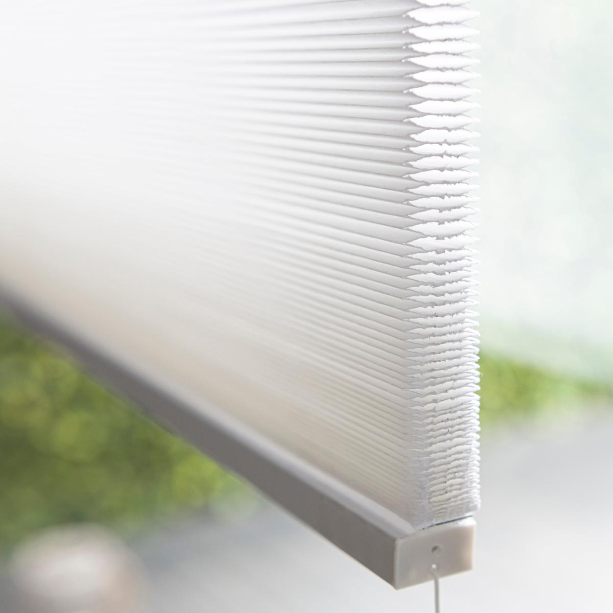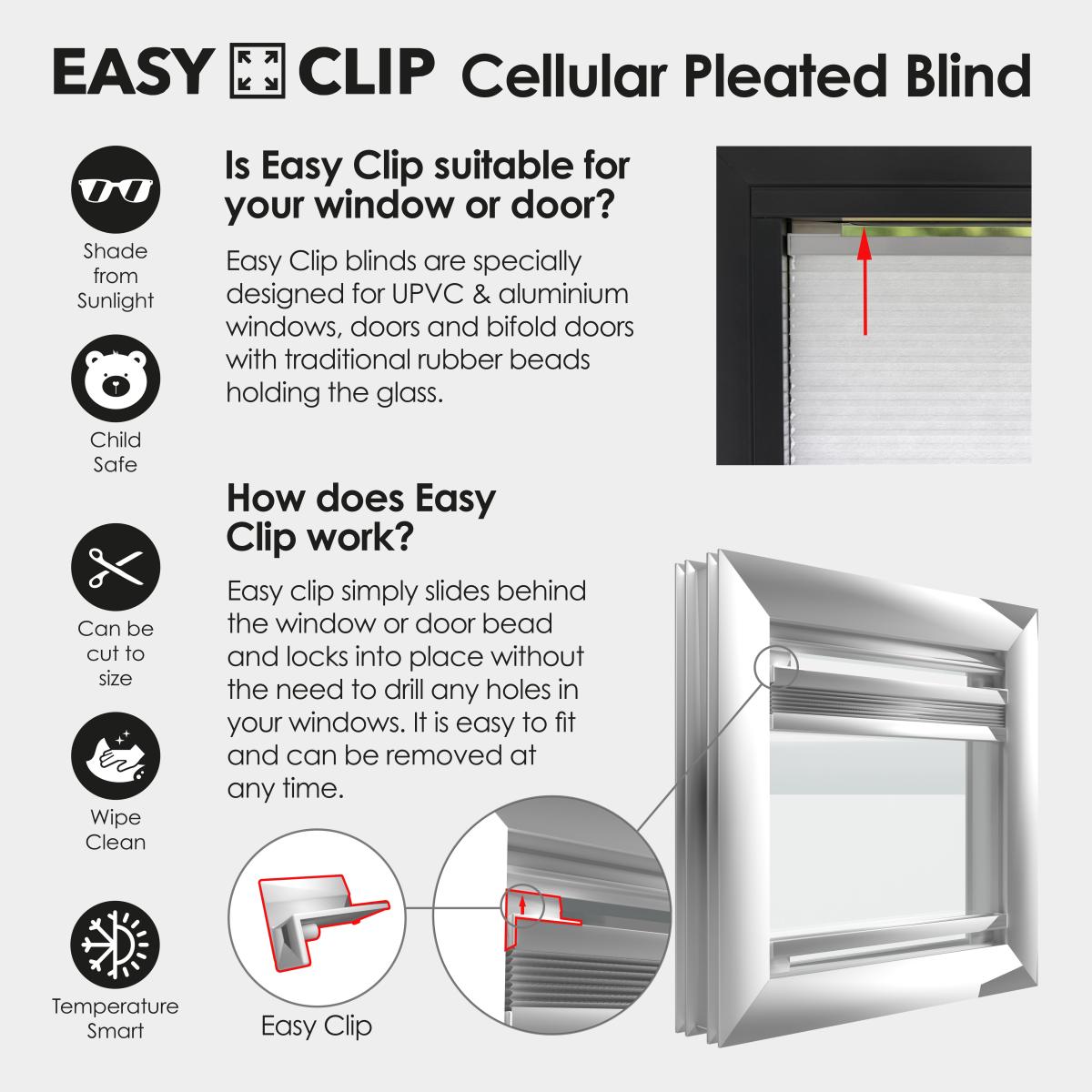 Available in a pure white, the Easy Clip Pleated Blind perfectly complements any interior décor with the pleated fabric allowing natural light into your home while reducing unwanted glare. The cellular fabric traps air in its hollow pleats helping to insulate your home by retaining the heat of the room in the winter and keeping you cool in summer. Quick and simple to fit, this innovative design clips directly into your PVC window or patio door with all fittings included. The blind comes in a range of sizes and can also be cut to size in a few simple steps to get a perfect seamless fit to your window pane whatever the size. No drilling, screwing or damage to your walls as the clip-in brackets are fitted directly to your window frame bead. Child safe by design.