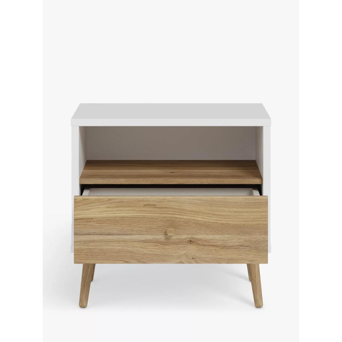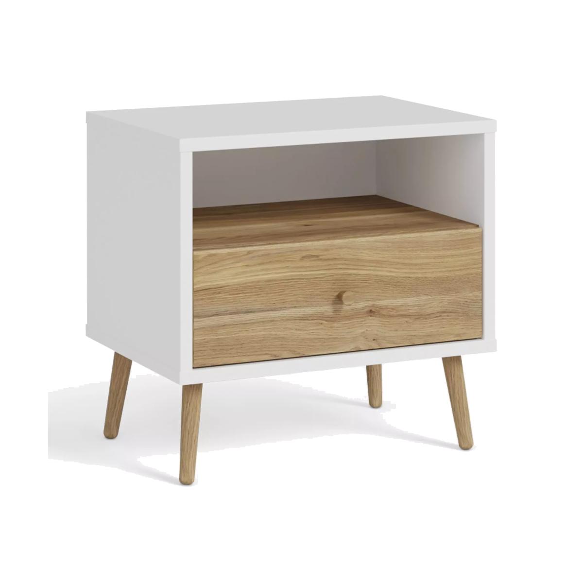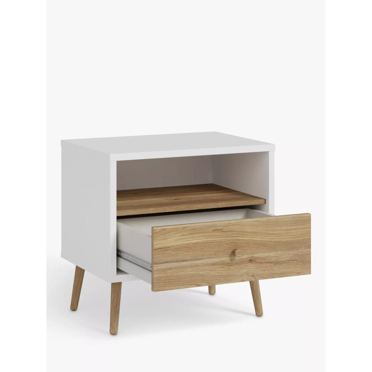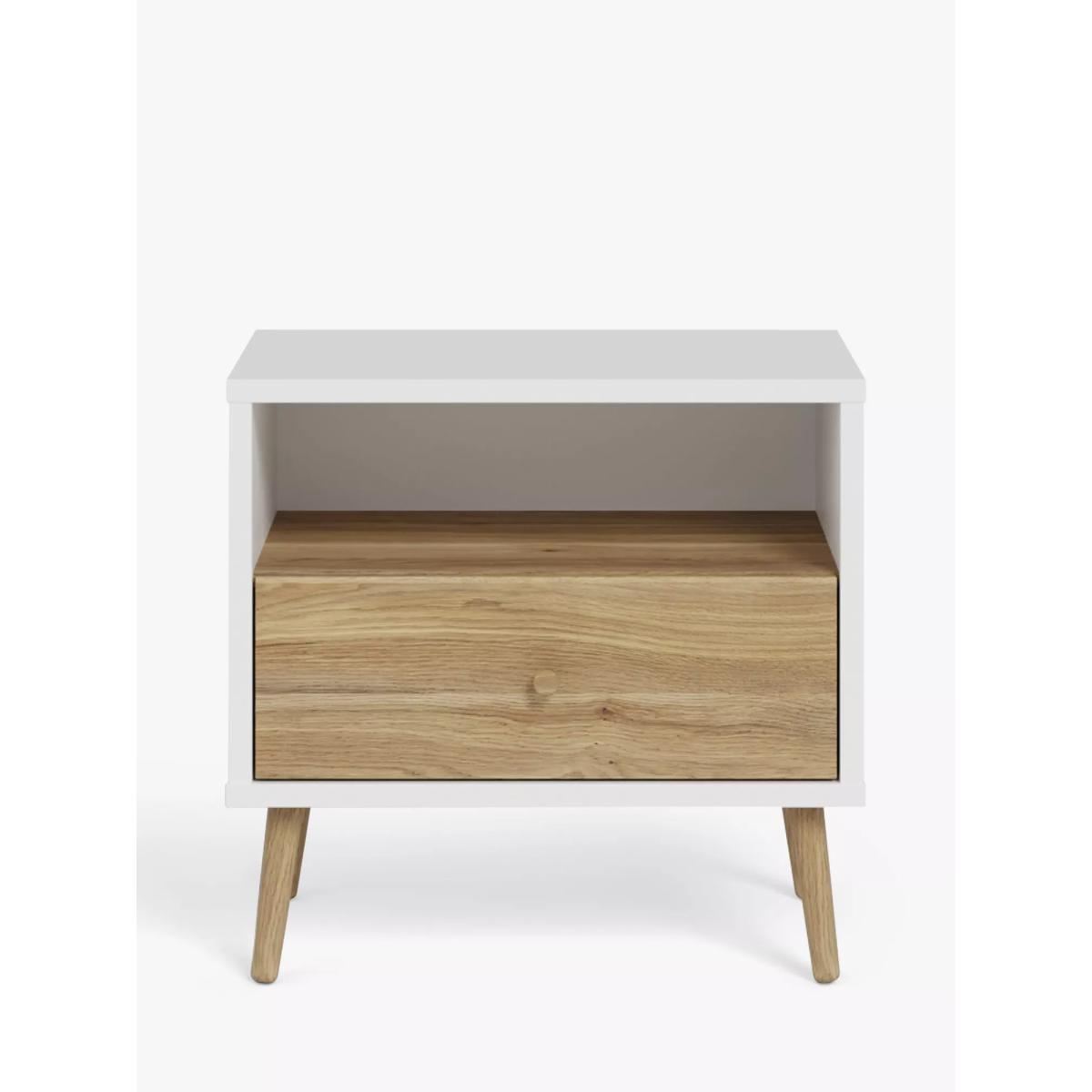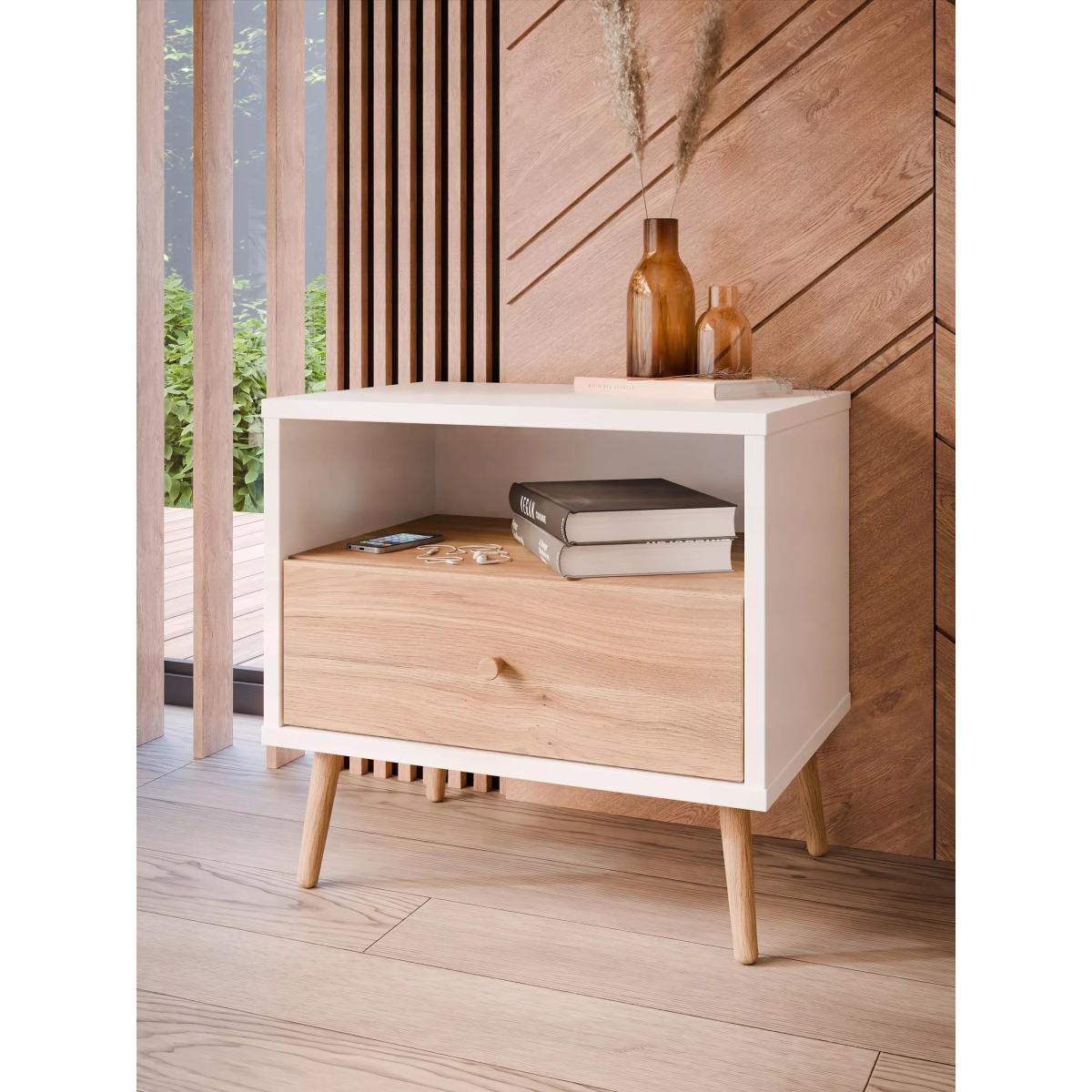 The Harllson Bedside Table is not just a practical base for a clock and a bedside lamp, but is also a fashionable piece of furniture for your home. The open space under the countertop facilitates storing your latest book, while the drawer is suitable for storing medicines, cosmetics, or other small items. It has been mounted on full-extension slides, ensuring exceptional access and comfort when using the furniture. Several important features distinguish the Harllson collection from most pieces of furniture. Firstly, the assembly method stands out. Putting furniture together has never been so easy and straightforward. Assembly is up to 10 times quicker than the traditional self-assembly method, and it hardly requires the use of tools because most elements connect with a click. This is made possible by Easy. Klix, an innovative system based on Threespine ID® technology, which also allows you to disassemble and rebuild the furniture multiple times so no need to worry about damaging your furniture if you want to move it. The design is contemporary, yet evoking the best of mid-century design. Designed in an oak effect and subtle in form and colour, the furniture combines beauty and functionality. All models have solid wood, tall, slightly angled and tapered legs. Delicate wooden knobs emphasise the collection's style and are perfectly matched to the various colour options. The furniture will be a wonderful foundation for arranging a comfortable living room or bedroom in a Scandinavian, boho, or retro spirit. Want to see it first? You may want to see and get a feel for the furniture in one of our shops before ordering. We'll be able to tell you where the range you'd like to view is on display.