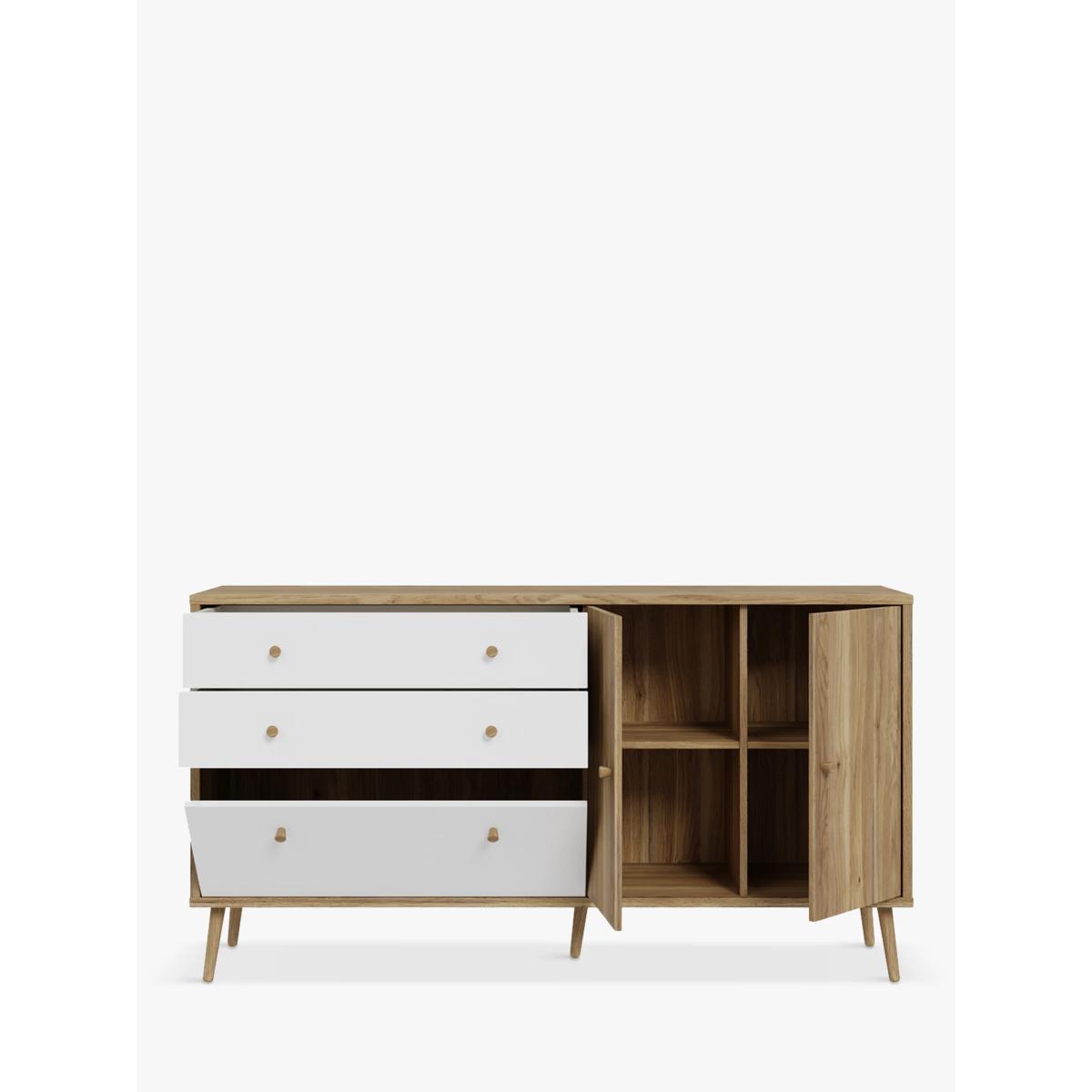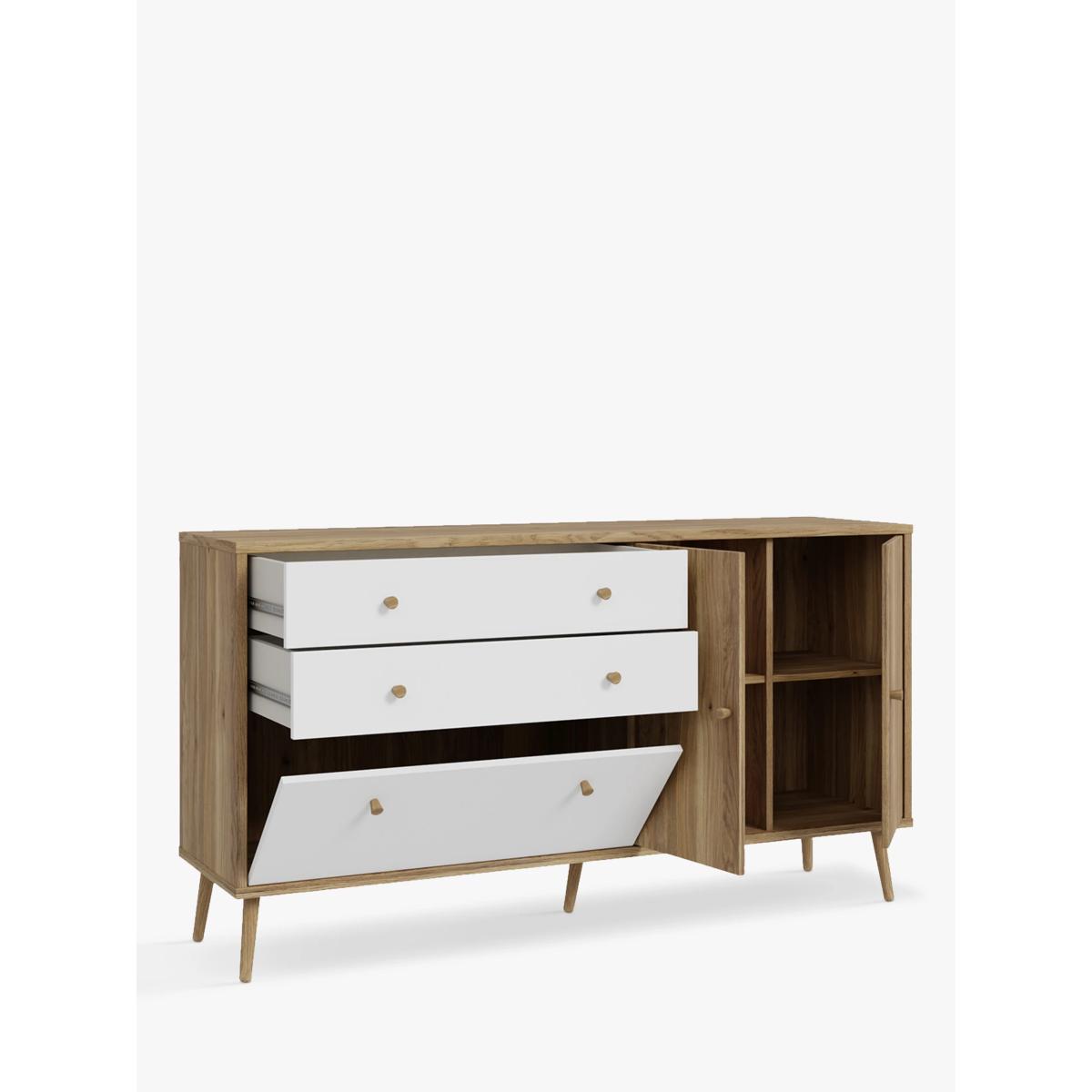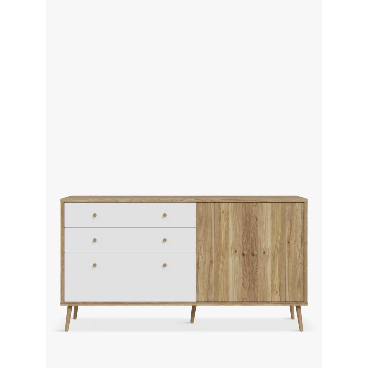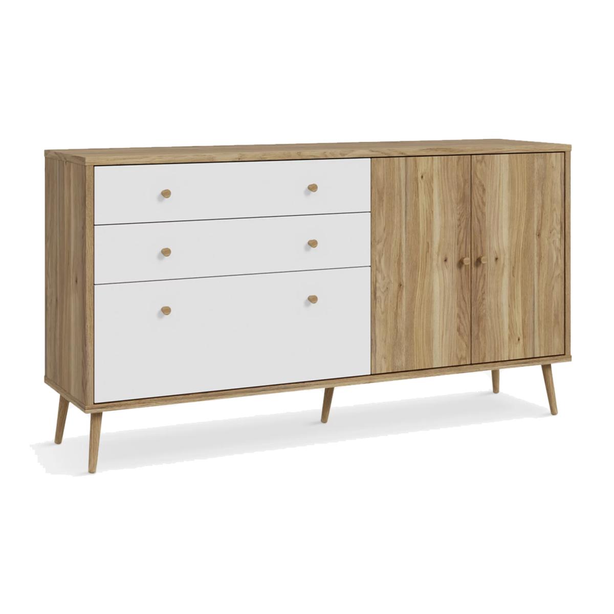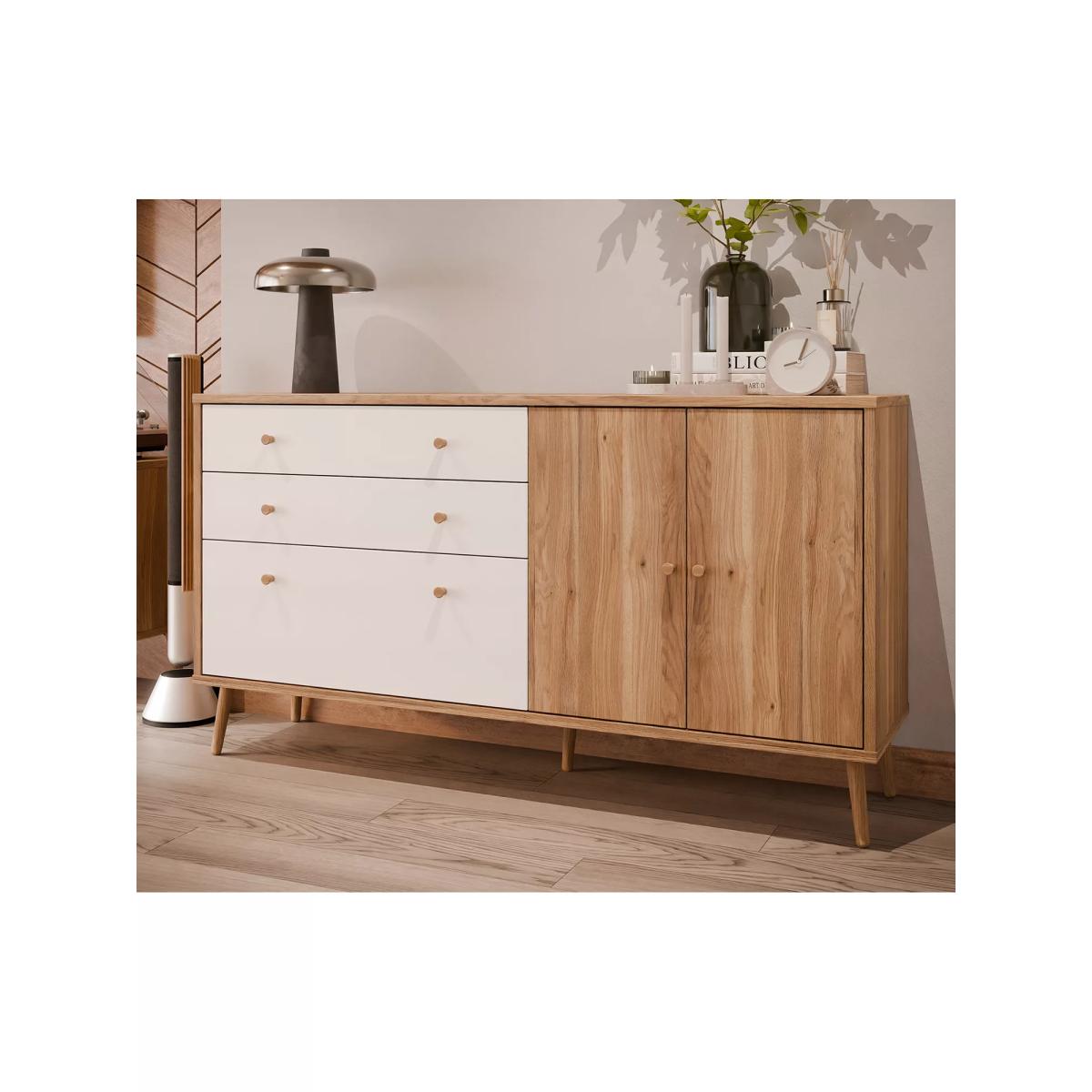 With Harllson flat pack furniture, assembly is up to 10 times quicker than the traditional self-assembly method and hardly requires the use of tools as most elements connect with a "click". This is made possible by "Easy Klix", an innovative system based on Threespine ID® technology, which also allows you to disassemble and rebuild the furniture multiple times, so there's no need to worry about damaging your furniture if you want to move it. Putting furniture together has never been so easy and straightforward! Crafted in contemporary style, yet evoking the best of mid-century design, Harllson combines both beauty and functionality and is subtle in form and colour. All pieces have solid wood, tall, slightly angled and tapered legs, making them visually light so they won’t overwhelm the room. Delicate wooden knobs emphasize the collection's style and are perfectly matched to the various colour options. The furniture will be a wonderful foundation for arranging a comfortable living room or bedroom in a Scandinavian, boho, or retro spirit. The Harllson sideboard, in an impressive combination of white and mauvella oak, will fit well into many rooms in your home. It provides ample storage space as well as a place to display favourite decorations or photos. It's equipped with 2 drawers for small items and 2 cabinets (one disguised by a drawer front) where you can store larger objects. Thanks to the soft-close system, the doors open and close gently and silently. Want to see it first? You may want to see and get a feel for the furniture in one of our shops before ordering. We'll be able to tell you where the range you'd like to view is on display.