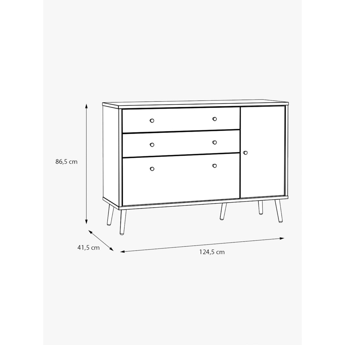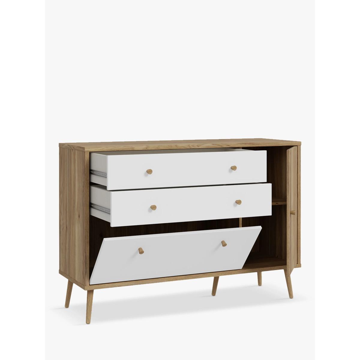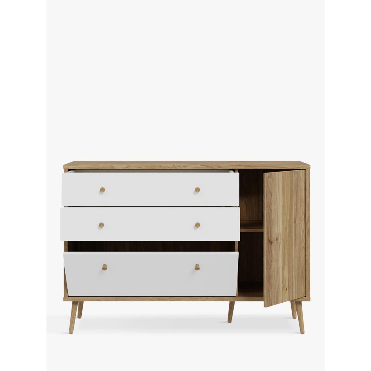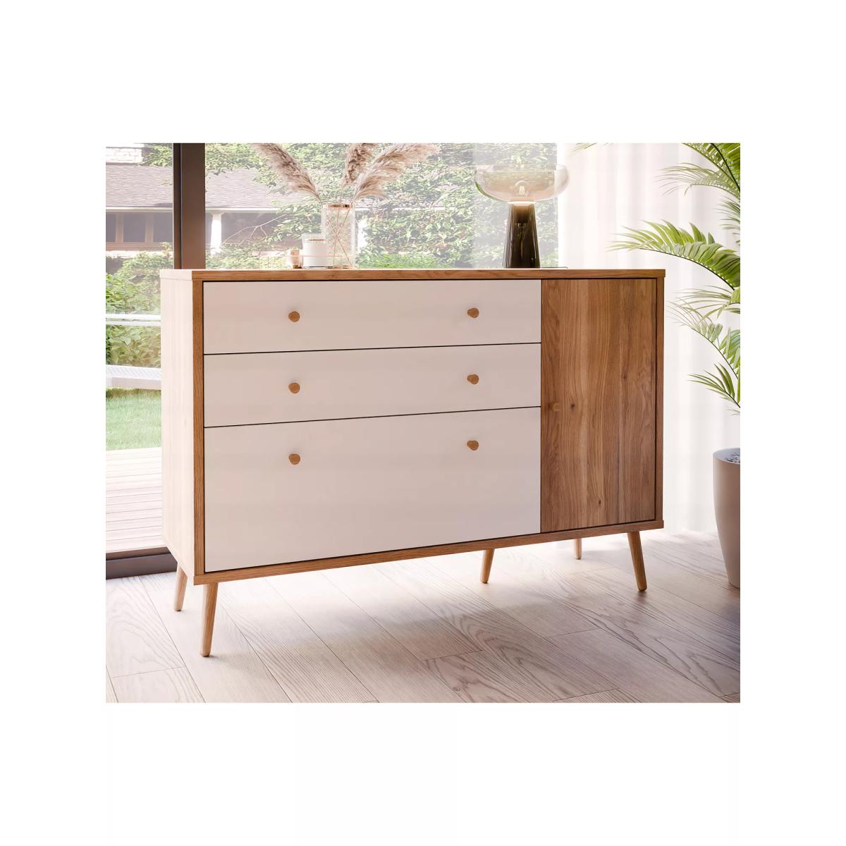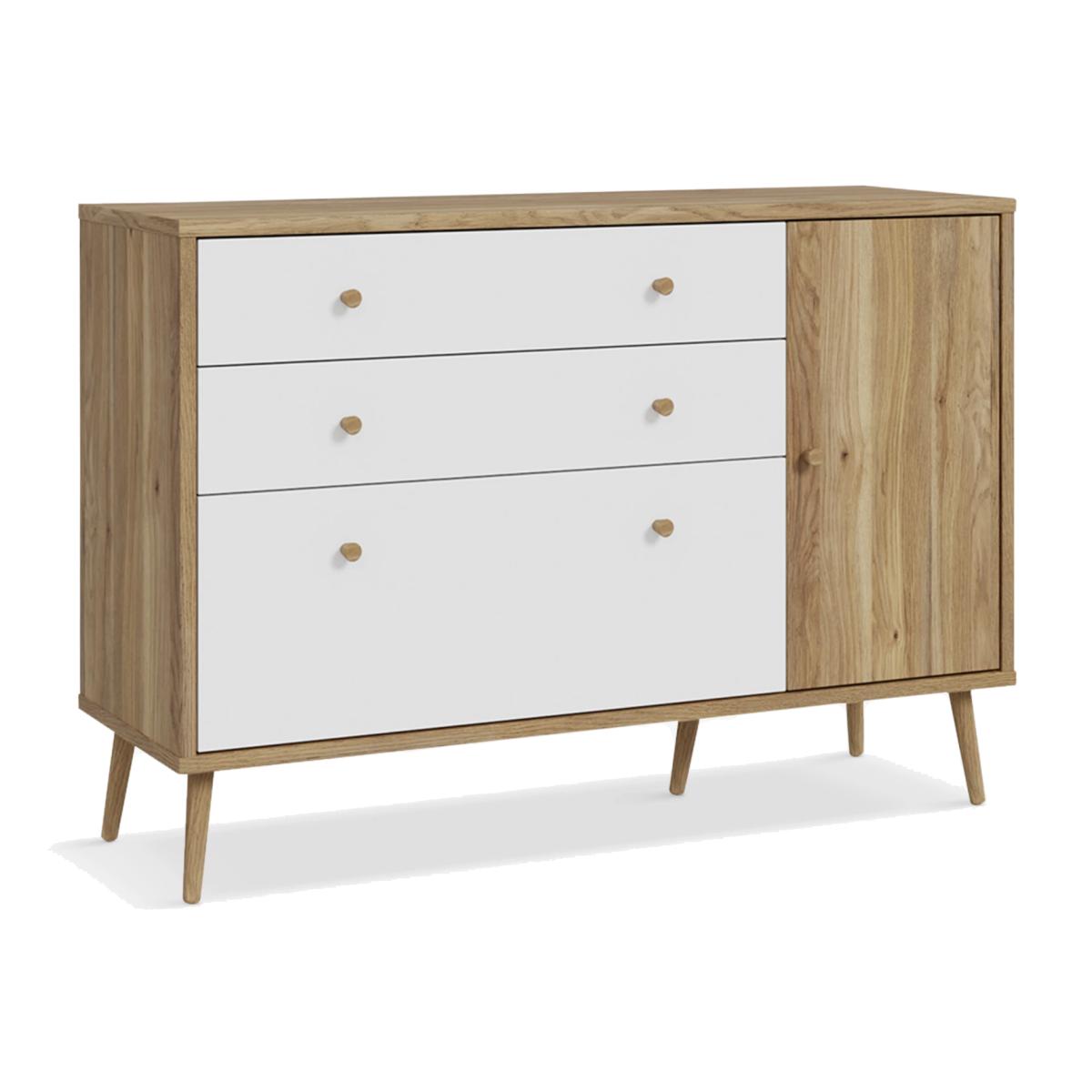 With Harllson flat pack furniture, assembly is up to 10 times quicker than the traditional self-assembly method and hardly requires the use of tools as most elements connect with a "click". This is made possible by "Easy Klix", an innovative system based on Threespine ID® technology, which also allows you to disassemble and rebuild the furniture multiple times, so there's no need to worry about damaging your furniture if you want to move it. Putting furniture together has never been so easy and straightforward! Crafted in contemporary style, yet evoking the best of mid-century design, Harllson combines both beauty and functionality and is subtle in form and colour. All pieces have solid wood, tall, slightly angled and tapered legs, making them visually light so they won’t overwhelm the room. Delicate wooden knobs emphasize the collection's style and are perfectly matched to the various colour options. The furniture will be a wonderful foundation for arranging a comfortable living room or bedroom in a Scandinavian, boho, or retro spirit. The Harllson sideboard, in an impressive combination of white and mauvella oak, will fit well into many rooms in your home. It provides ample storage space as well as a place to display favourite decorations or photos. It's equipped with 2 drawers for small items and 2 cabinets (one disguised by a drawer front) where you can store larger objects. Thanks to the soft-close system, the doors open and close gently and silently. Want to see it first? You may want to see and get a feel for the furniture in one of our shops before ordering. We'll be able to tell you where the range you'd like to view is on display.