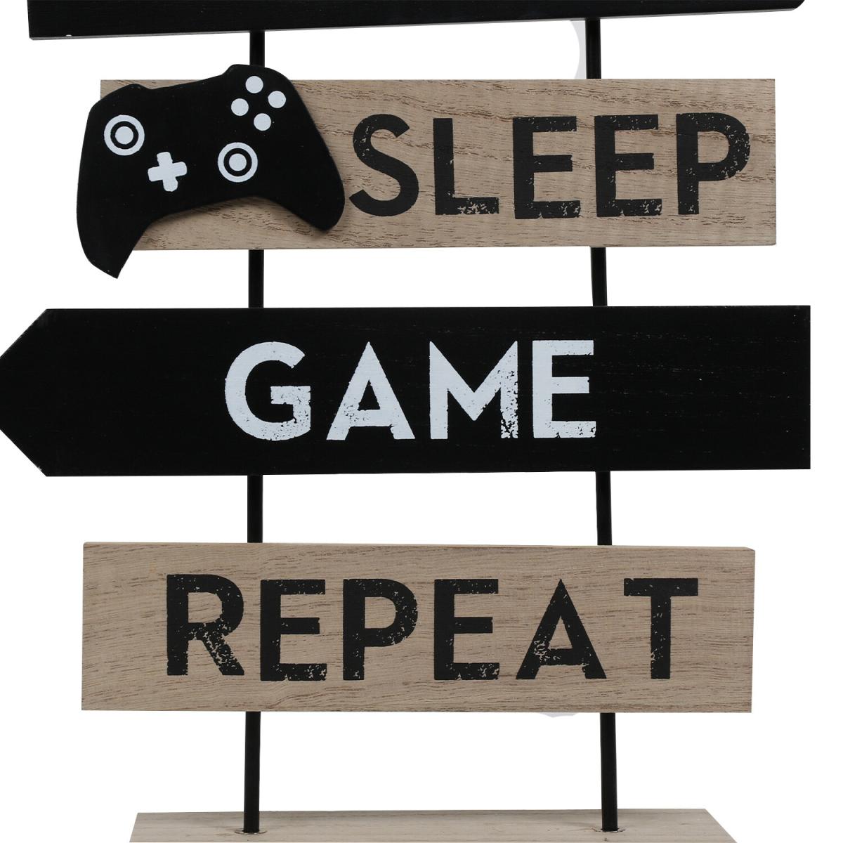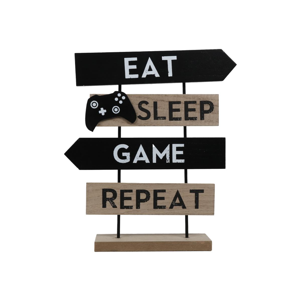 The Eat Sleep Game Repeat Standing Sign is the perfect accessory for any gamer's space. The sign reads 'Eat, sleep, game, repeat' and is finished with a remote control. Crafted with natural wood tones and black elements, this sign will look excellent standing on accent tables and shelves in bedrooms, hobby dens, and more. It's a great way to add humour to any space.