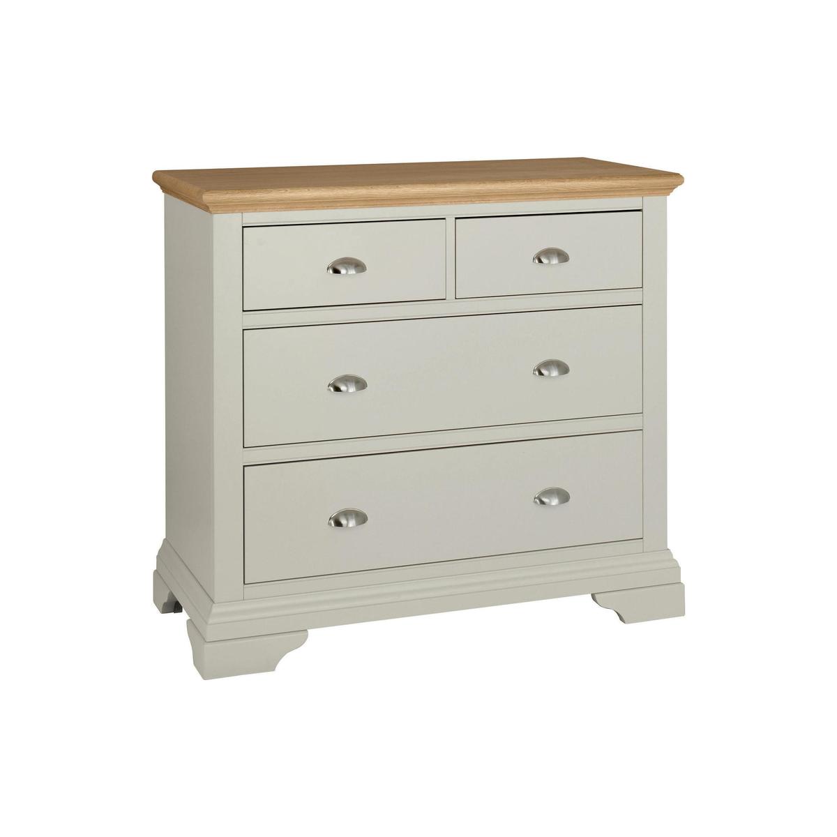Fashioned with two large and two small drawers, this chest of drawers is crafted with oak and finished in soft grey with cupped chrome handles.