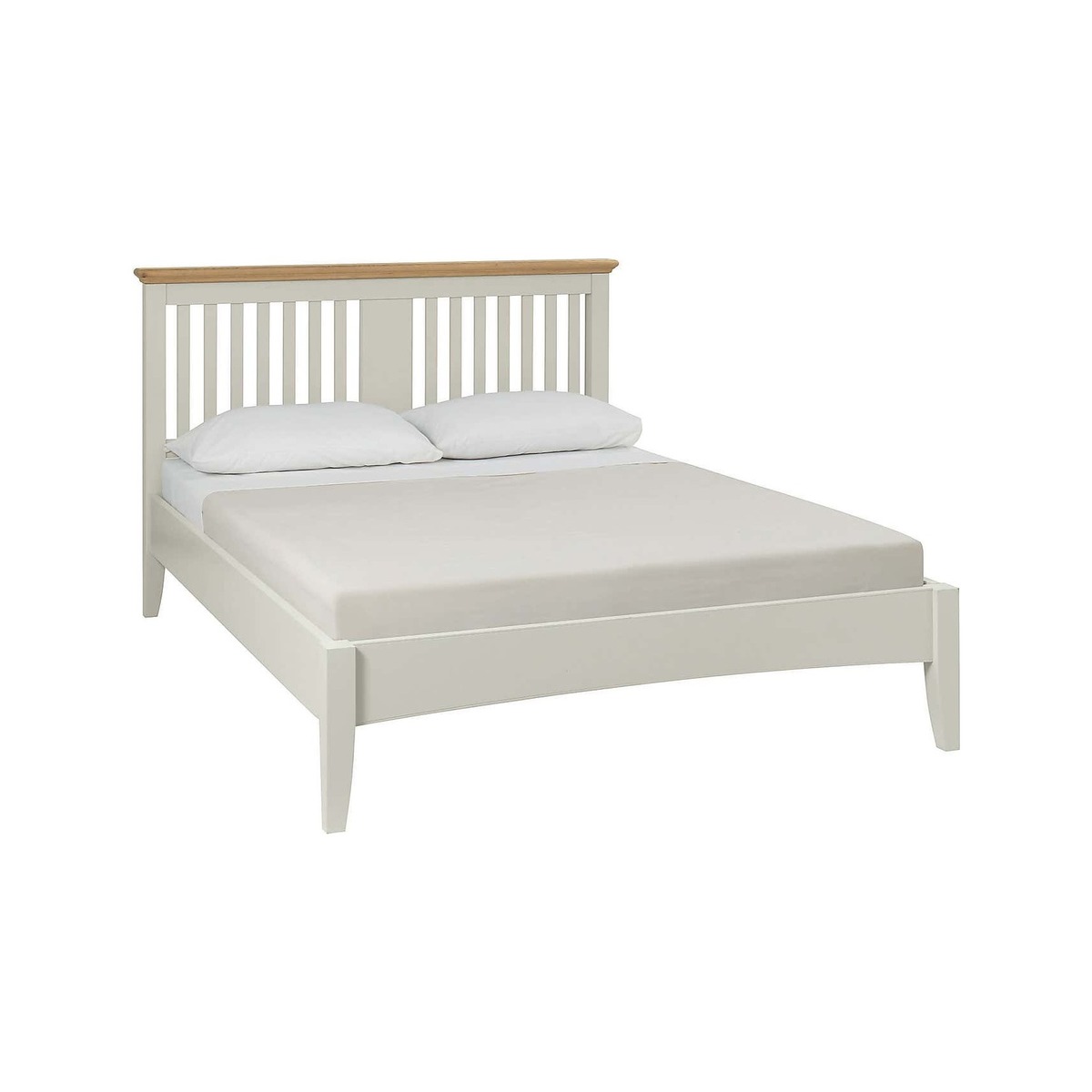 Featuring a slatted headboard design and a contrasting oak top, this bedstead is finished in soft grey and is available in a choice of sizes.