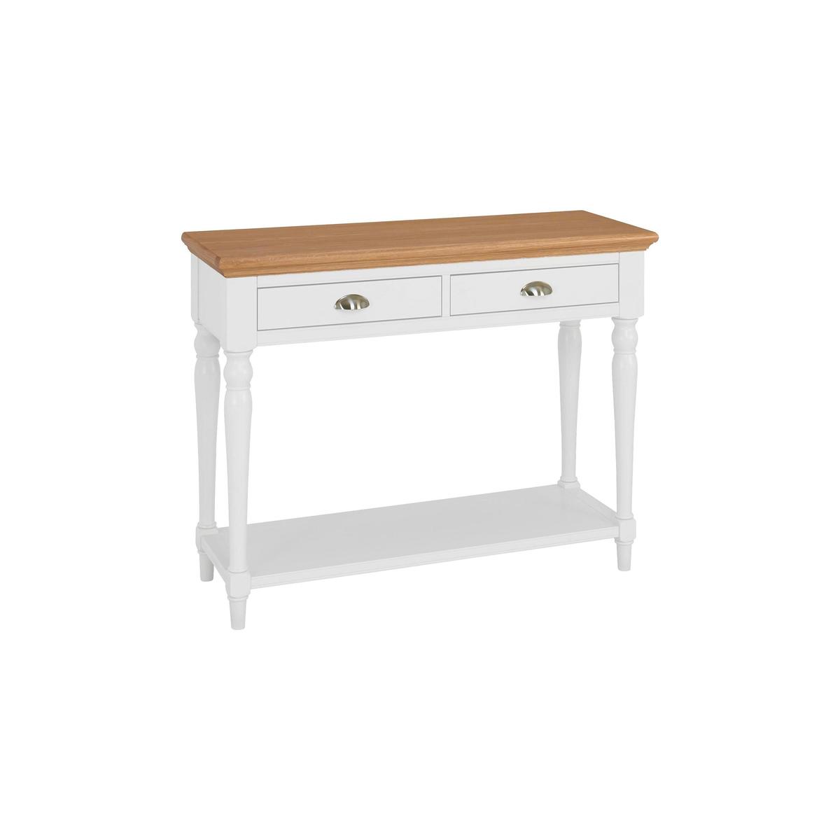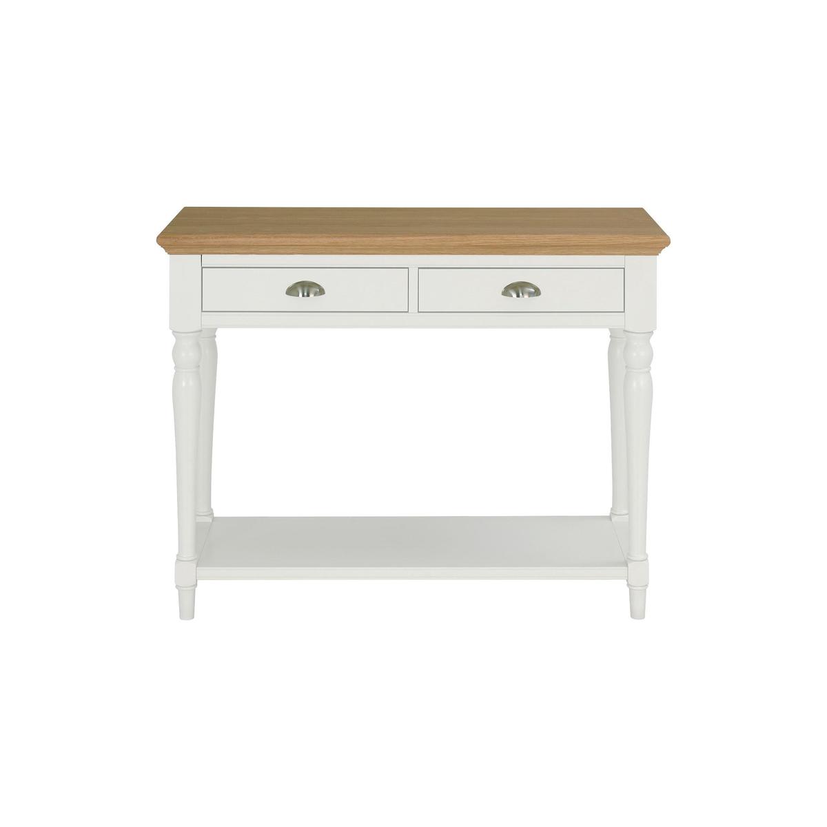 Crafted with a contrasting oak top and ivory painted turned legs, this console table features two drawers with cupped satin chrome handles.