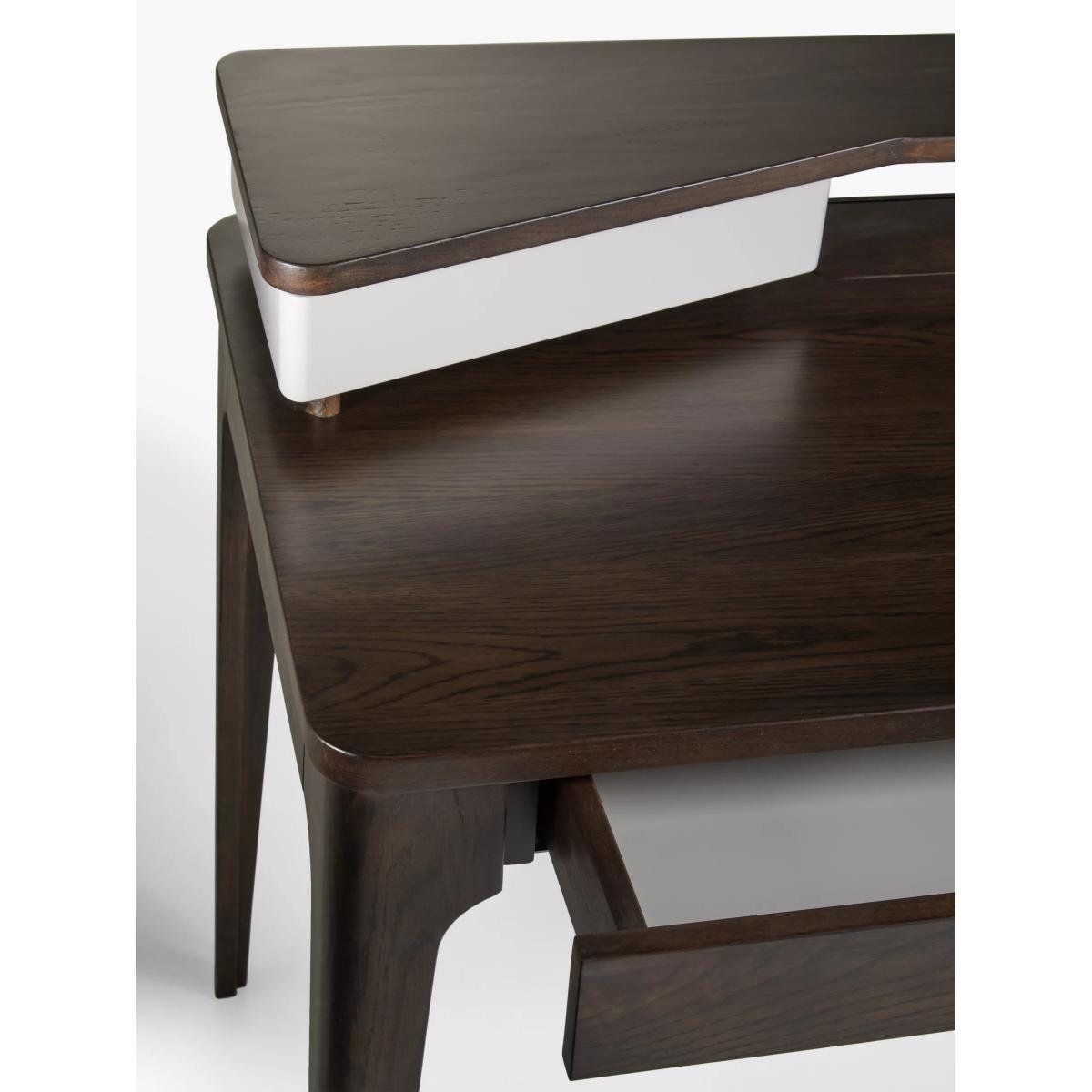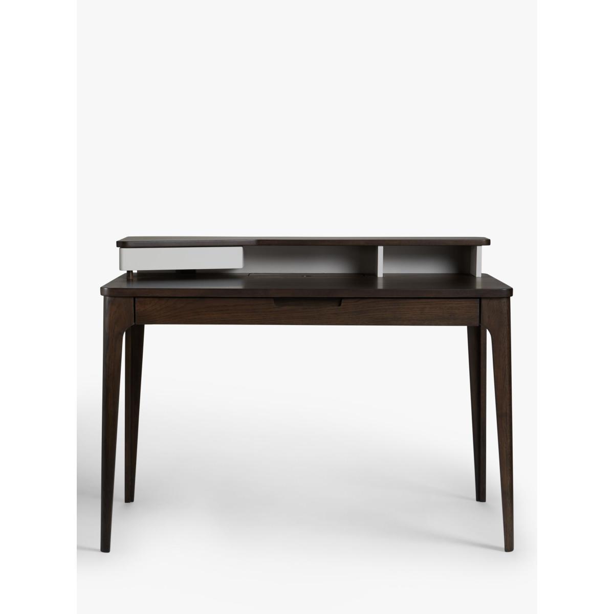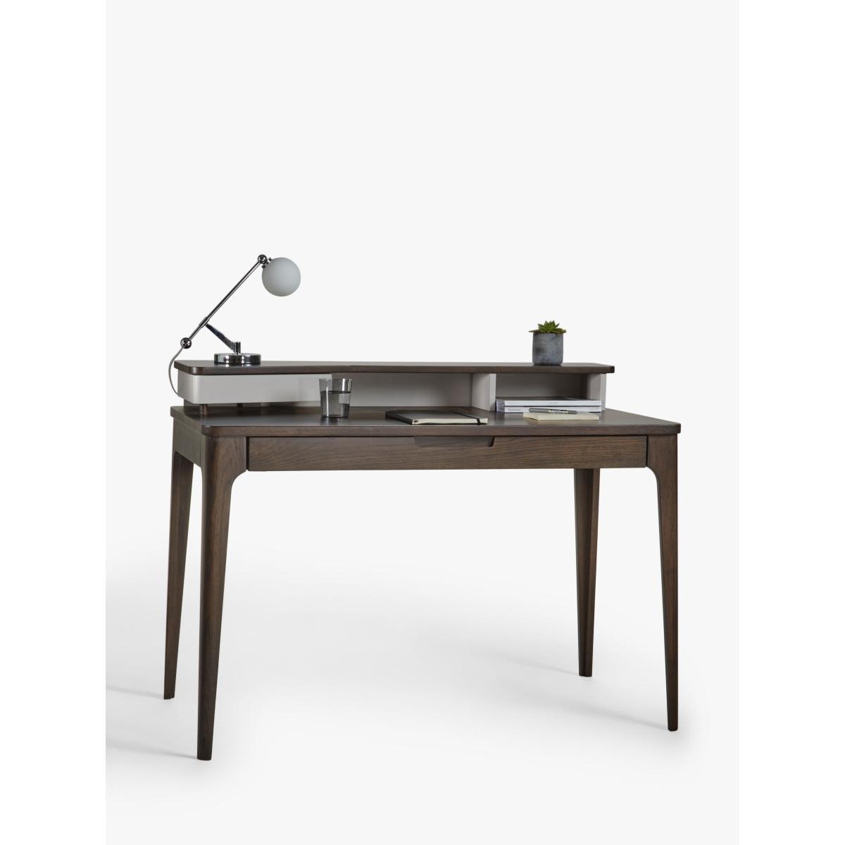 A practical desk for your home office, made from high-quality solid oak and veneers. It's reassuringly sturdy and its Scandi-inspired shape will bring a softer look to your space thanks to rounded edges and tapered legs. There's plenty of storage space for stationery and work documents and the two-tier design allows you to carefully position lighting or additional screens. Want to see it first? You may want to see and get a feel for the furniture in one of our shops before ordering. We'll be able to tell you where the range you'd like to view is on display.