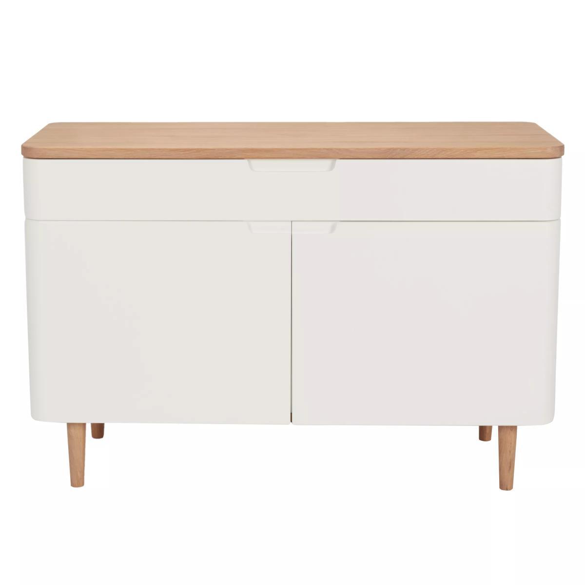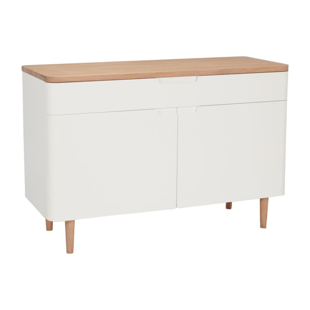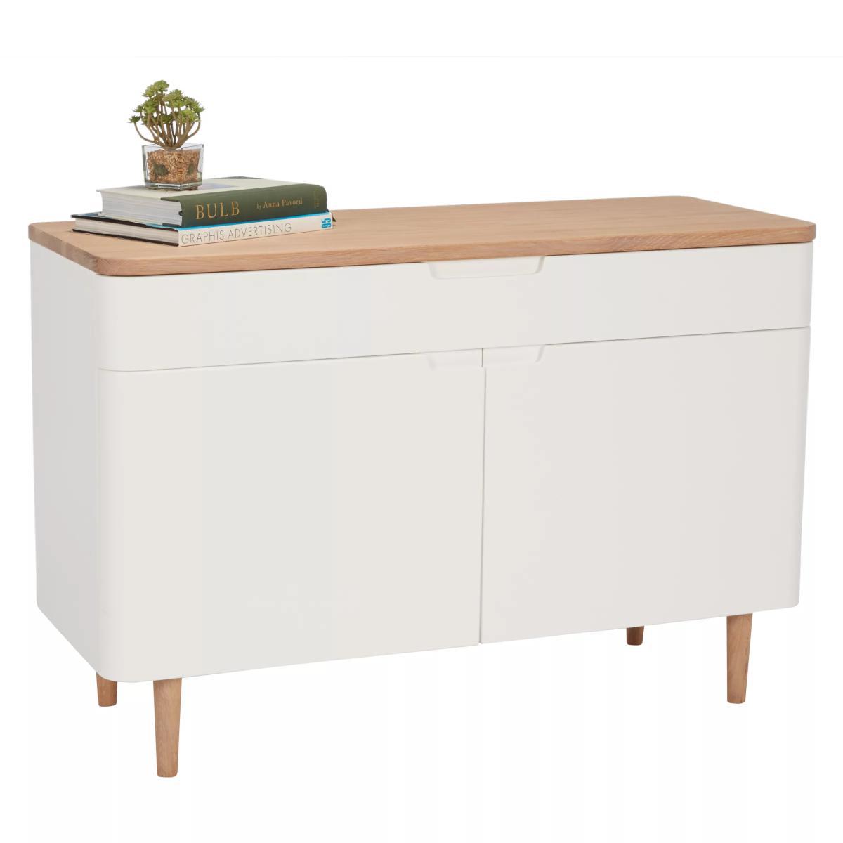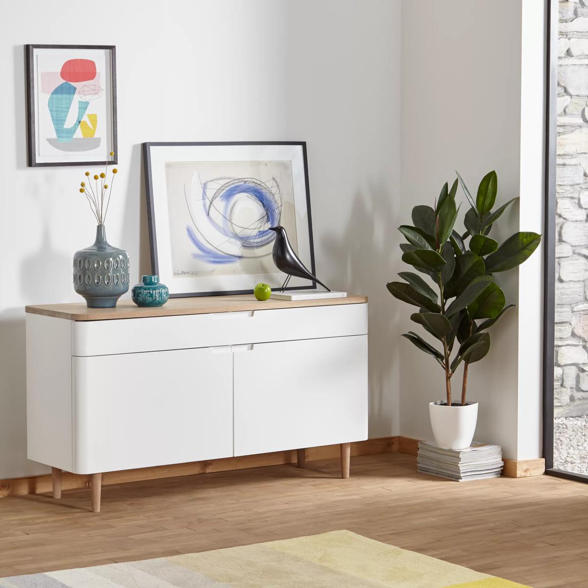 With a simple design that blends both Mid-Century and Scandi-inspired styles, this sideboard will draw the eye in smaller spaces. It's made from hard-wearing solid oak with the addition of MDF and oak veneers and there's plenty of storage space thanks to a divided draw and cupboard section. We like the sleek, tapered legs and rounded edges as it gives the frame a softer look. Plus, the painted front adds a modern contrast. Want to see it first? You may want to see and get a feel for the furniture in one of our shops before ordering. We'll be able to tell you where the range you'd like to view is on display.