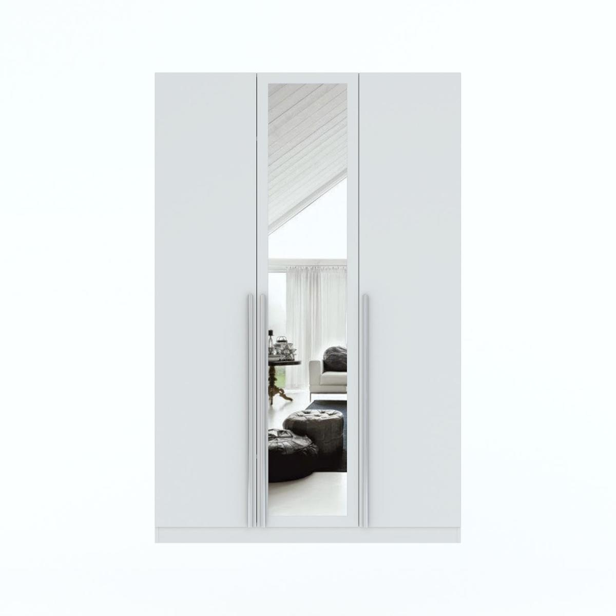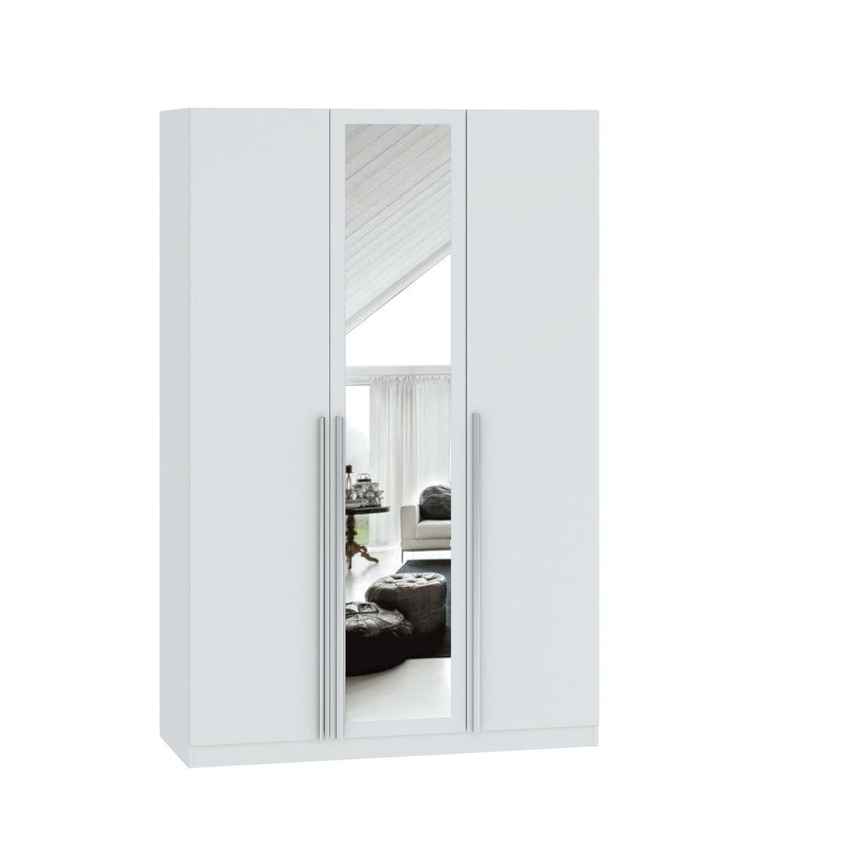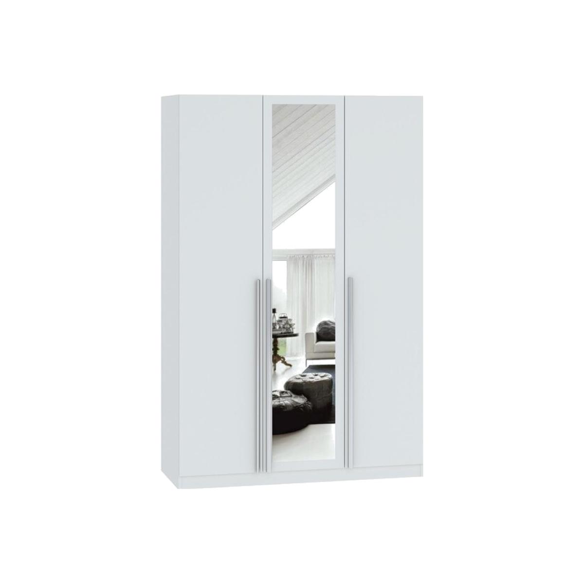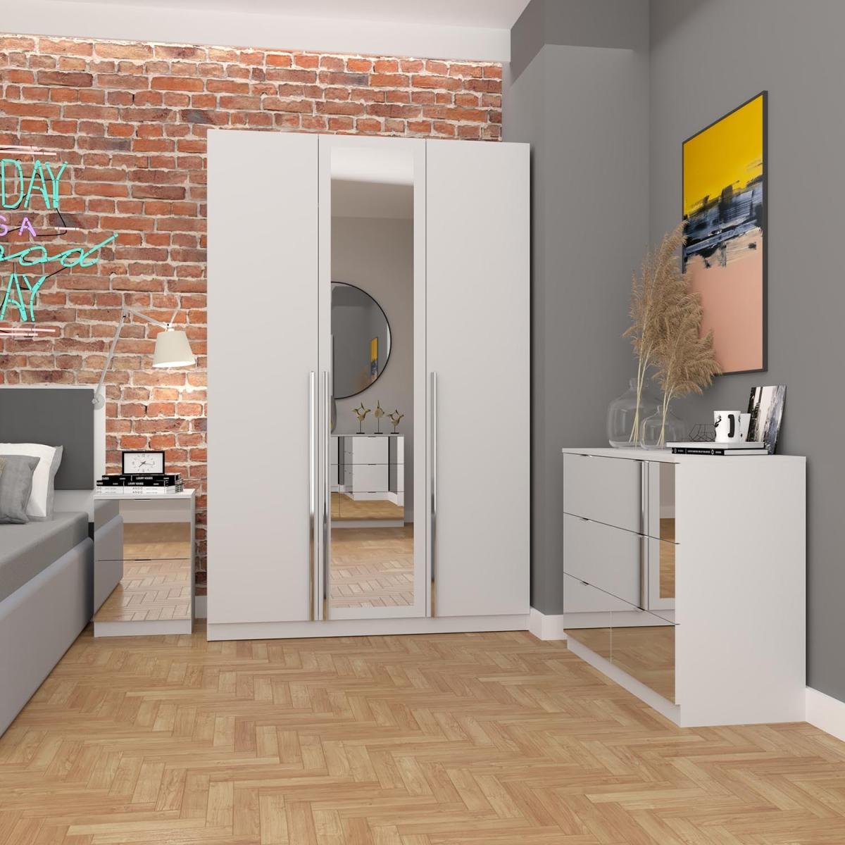 A beautiful addition to any bedroom, this Echo 3 Door Mirrored Wardrobe is the perfect place to store clothing. Made with a three-door design, this wardrobe features a matte white colour with a mirror fronted door and long sleek handles. Inside, you'll find a double hanging section with a large shelf and a hang rail. Sleek, modern, and stylish, this wardrobe can be coordinated in any space and is an easy way to keep your home looking neat and tidy.
