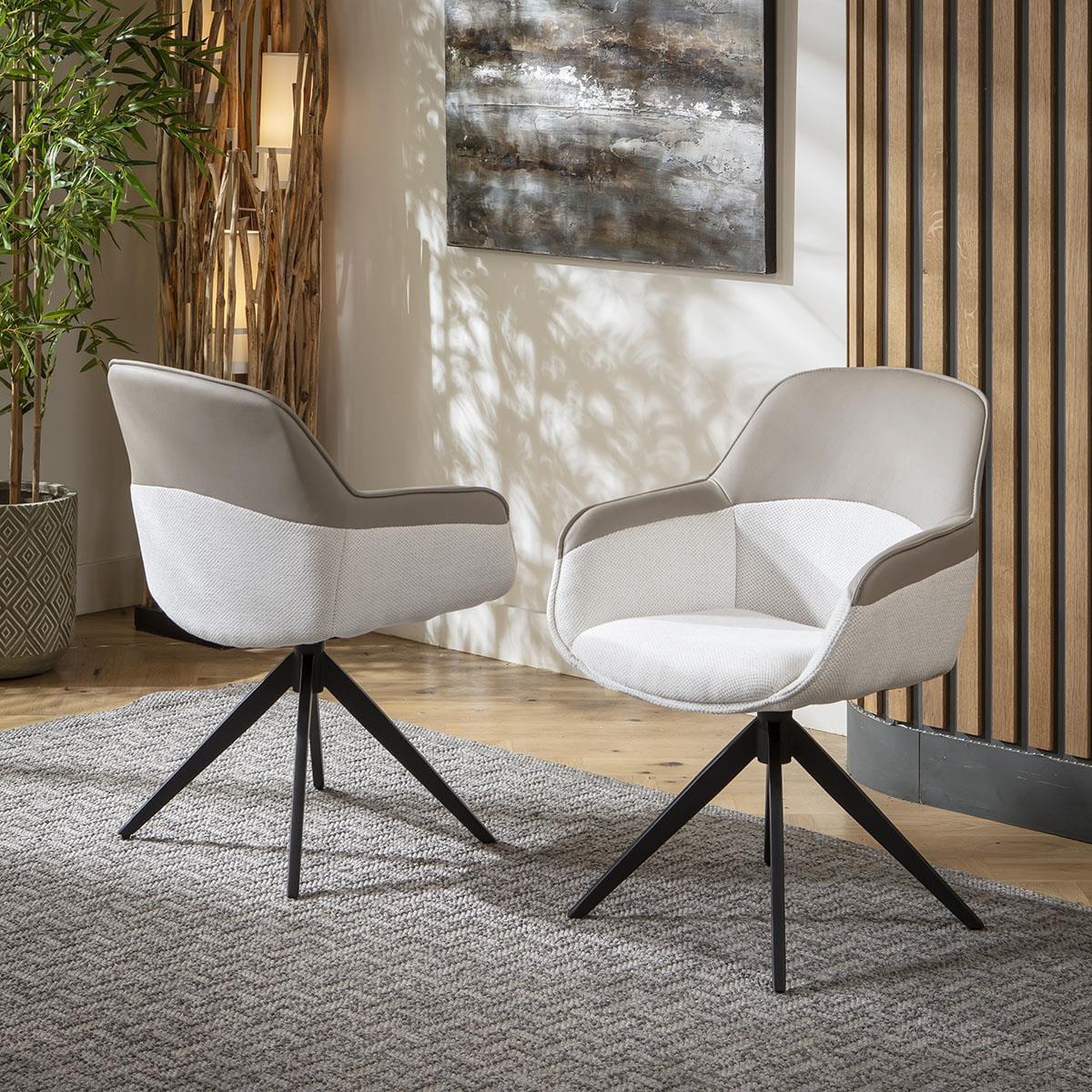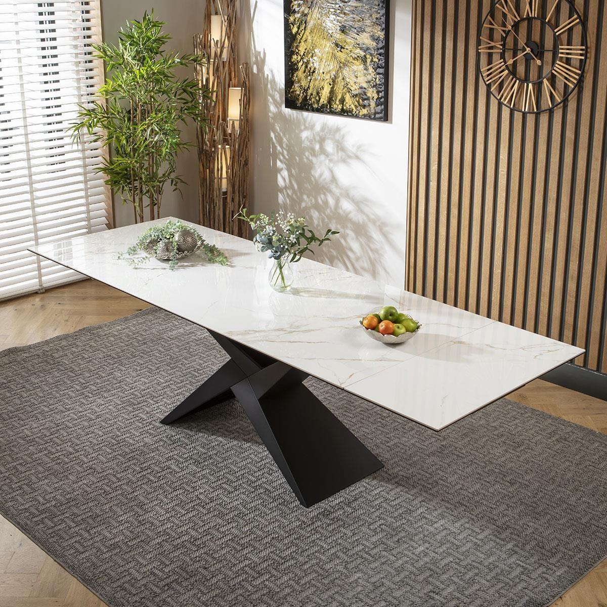 This 8 seater dining table and chairs set includes leather dining chairs with a rotating base, upholstered in light grey faux leather and white fabric, with an extendable dining table measuring 180cm up to 260cm, featuring a marble-effect ceramic tabletop. This modern dining set is crafted for durability and comfort. The modern extendable dining table features extension leaves at both sides, avoiding a middle gap. Measuring 180cm and extending to 260cm, it seats up to 8 people. With its white gold marble-effect ceramic tabletop and unique, ultra-modern base, this premium quality table is perfect for contemporary kitchens and dining areas. Elevate your dining experience with 8 of our Echo carver dining chairs with arms. This premium leather dining chair features a 360-degree rotating base. Upholstered in light grey faux leather and white premium fabric, this modern kitchen chair offers style and comfort, while being easy to keep clean for busy homes. This 8 seater dining set combines modern Echo chairs with the stunning Emperor table. Whether you love the Echo chairs and would like to purchase them individually, or you think the Emperor table would complete your dining room decor better with another chair, you can easily mix and match our modern dining tables and chairs to curate something truly unique. Table Size W180-260cm D90cm H76cm Chair Size W63cm D63cm H86cm Modern Dining Table And Chairs Set For 8