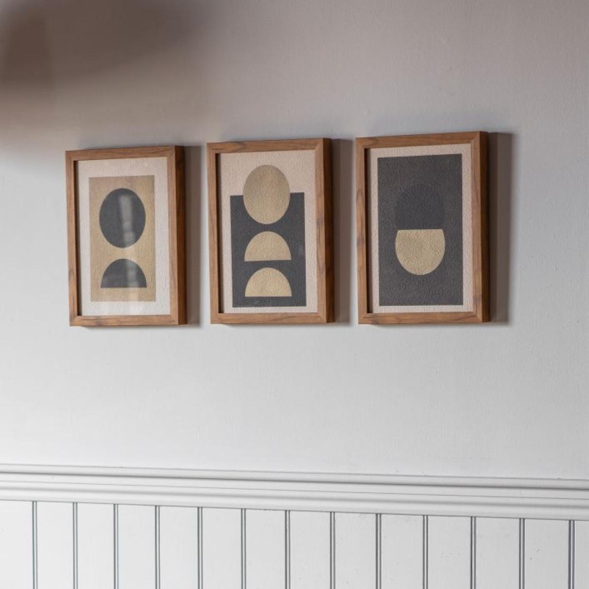This unique set of 3 framed art pieces feature a neutral colour palette with bold shapes in wood effect frame, the ideal piece to add some contrast into your interior. Orientation: Portrait. Fixing Type: Sawtooth. Framed:Yes. Colour: Natural.