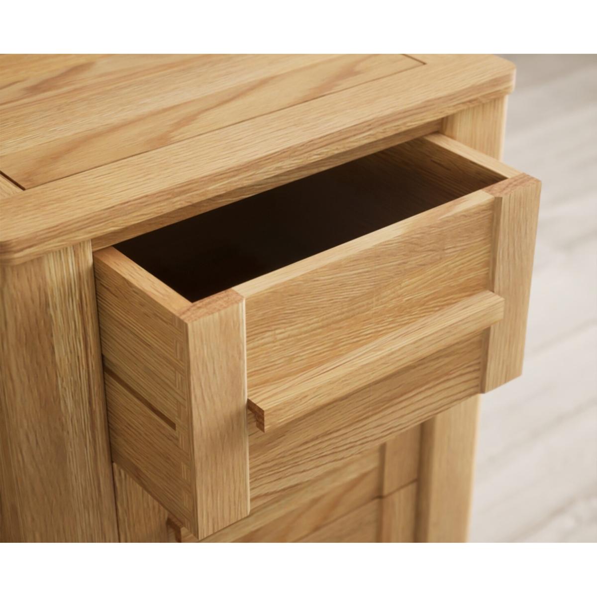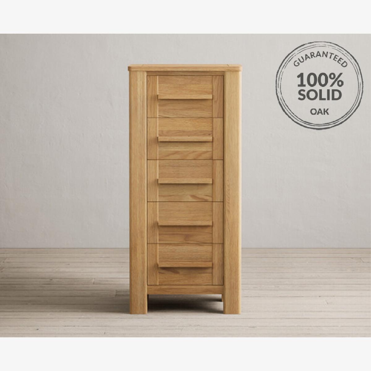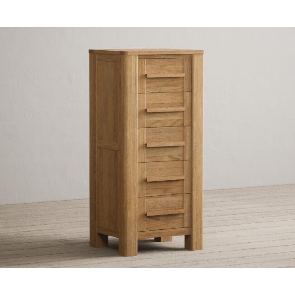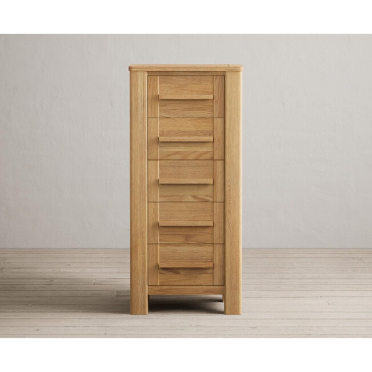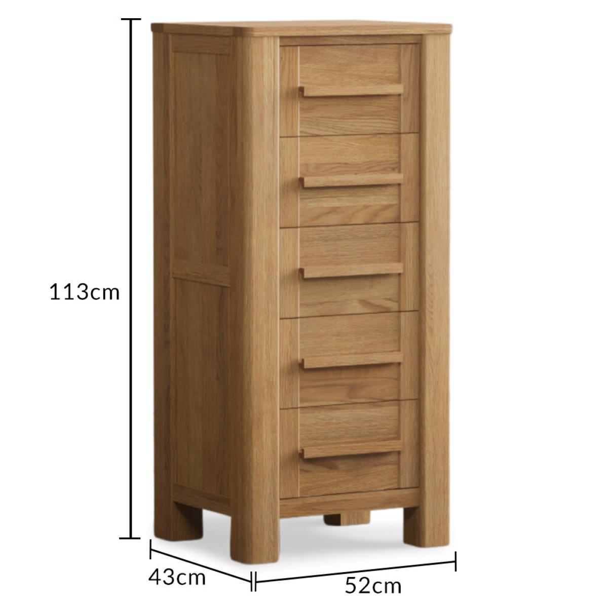 The Eclipse Oak 5 Drawer Tallboy features a clear finish, with five handy Dovetail drawers complete with inbuilt timber handles.