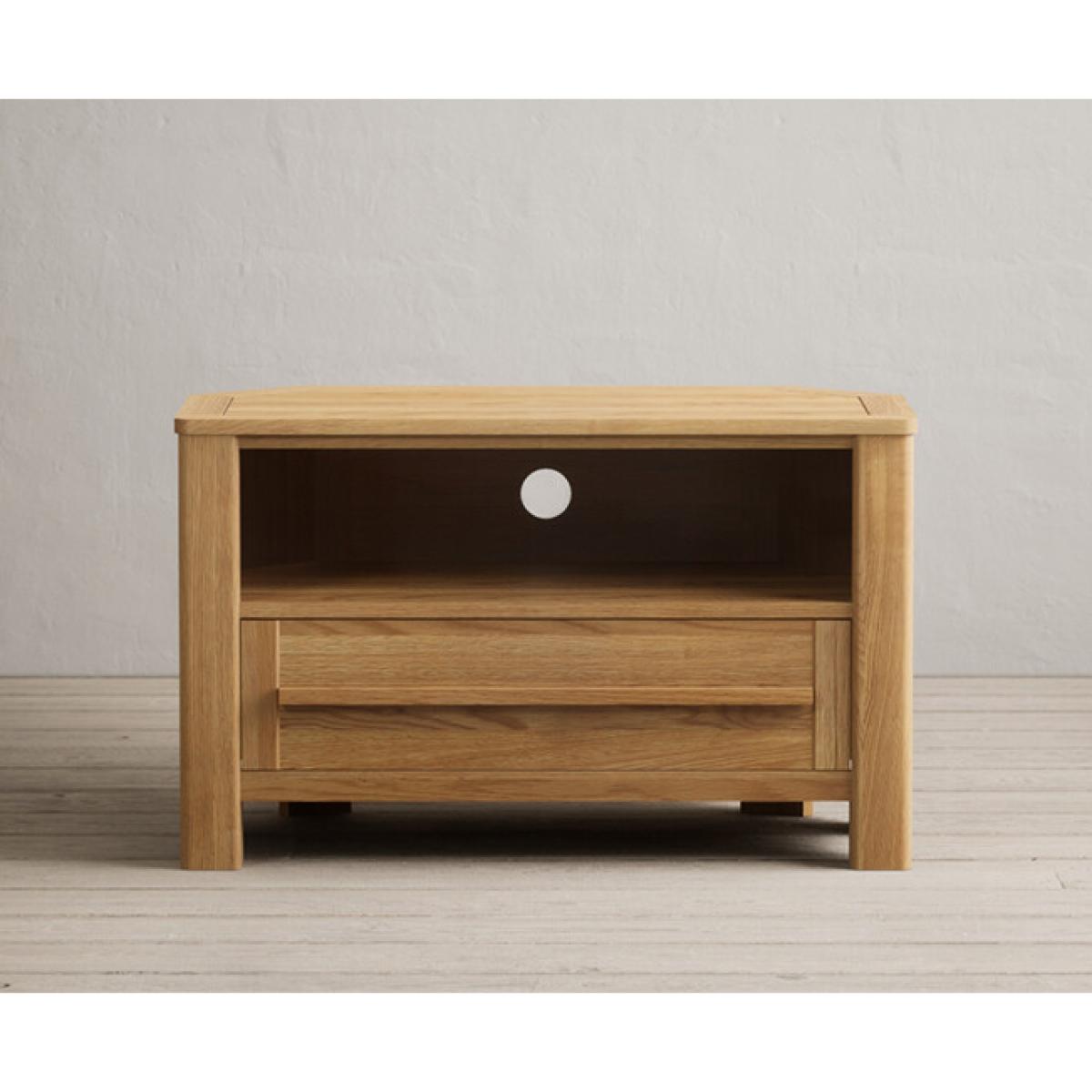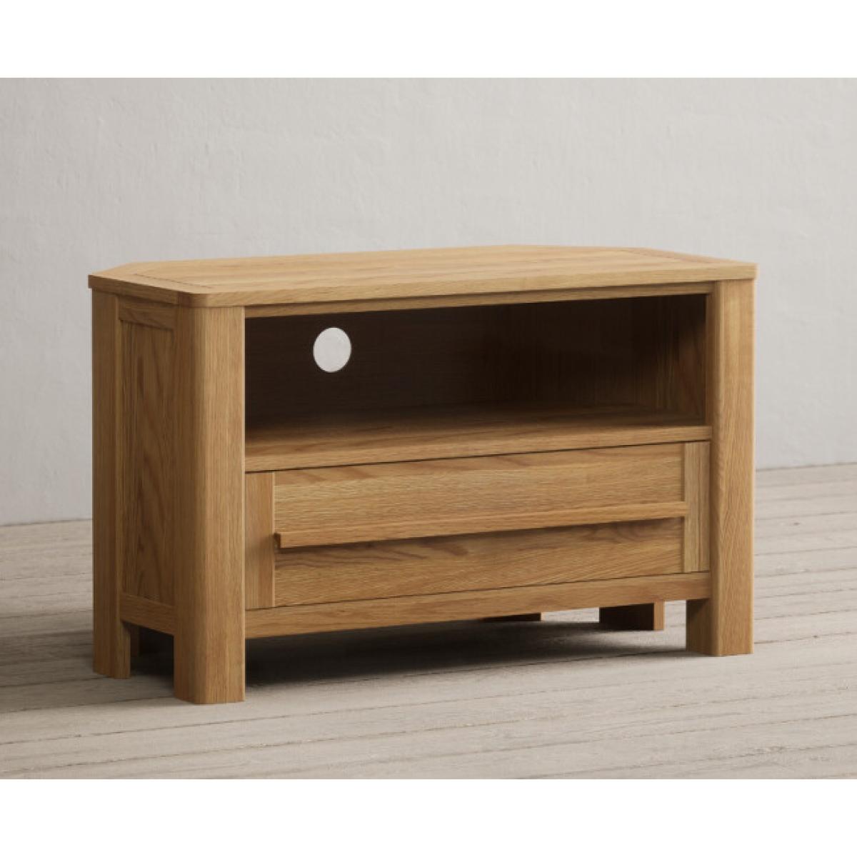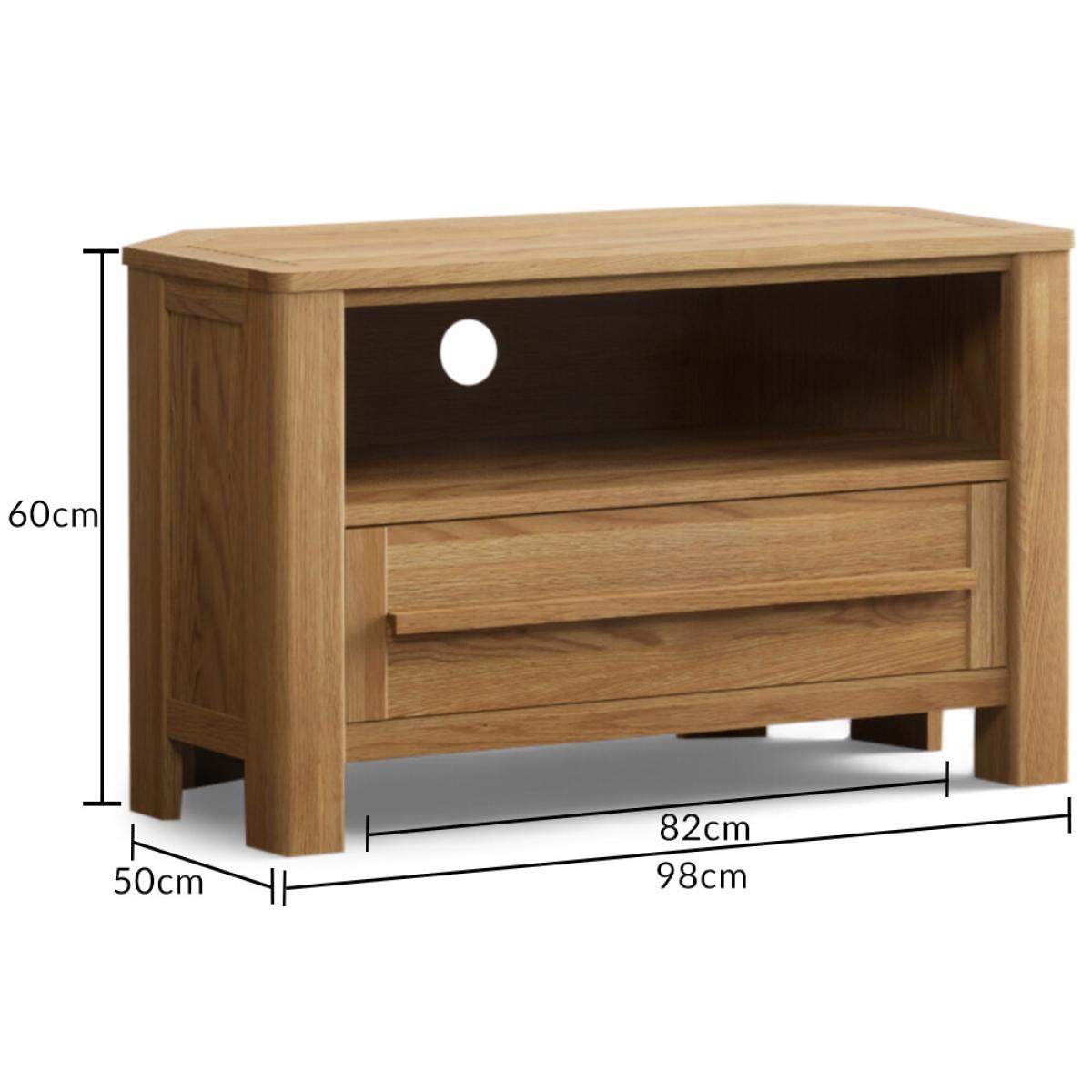 The Eclipse Solid Oak Corner TV Cabinet features a clear finish, with a cable management hole at the back and Dovetail drawer with inbuilt handle.