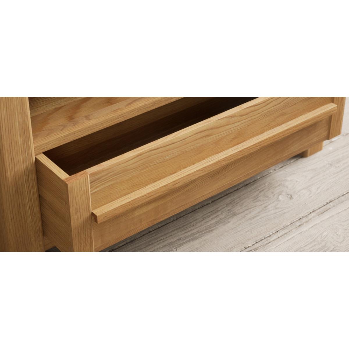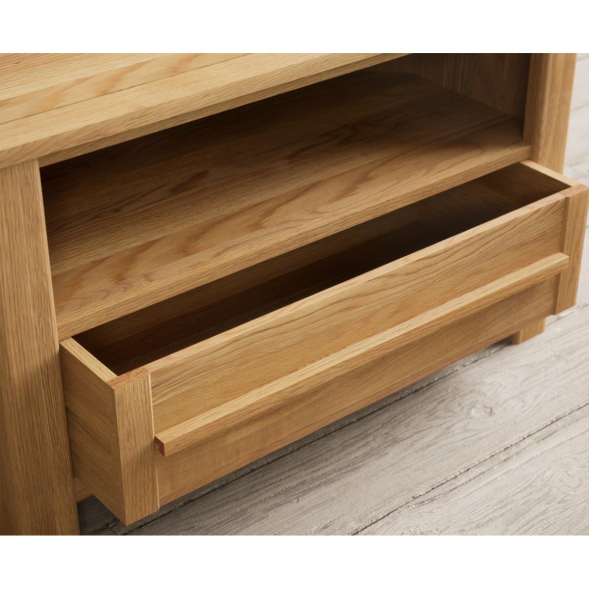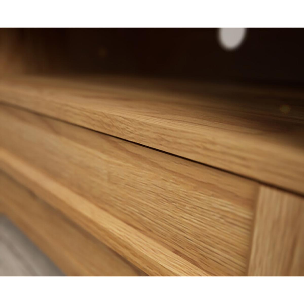 The Eclipse Solid Oak Corner TV Cabinet features a clear finish, with a cable management hole at the back and Dovetail drawer with inbuilt handle.