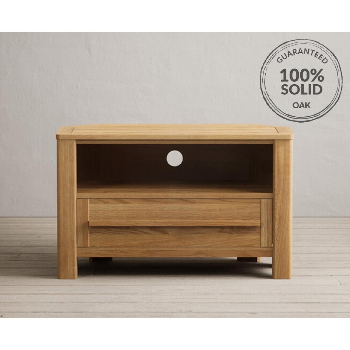 The Eclipse Solid Oak Corner TV Cabinet features a clear finish, with a cable management hole at the back and Dovetail drawer with inbuilt handle.
