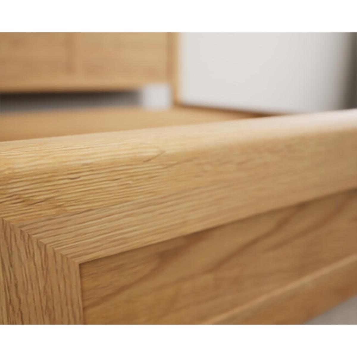 I really rate this solid oak bed for its clean lines and honest materials - it feels robust without looking bulky. The warm oak grain works brilliantly in Scandi, contemporary or country-style bedrooms and pairs easily with both muted palettes and stronger accent colours. For styling, keep bedding light and textured - think natural linen or cotton - then layer in a couple of plump cushions in slate grey or forest green. Add a simple bedside table in metal or matching wood, a woven rug to define the floor space and a couple of potted plants or sculptural lamps to bring life and balance to the scheme.