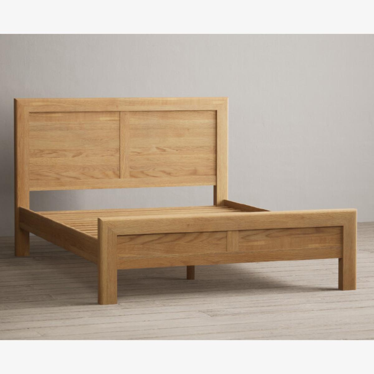 The Eclipse Solid Oak Double Bed is modern and minimalist, with a natural finish, sturdy timber slats and a chic panelled design on the headboard and footboard.