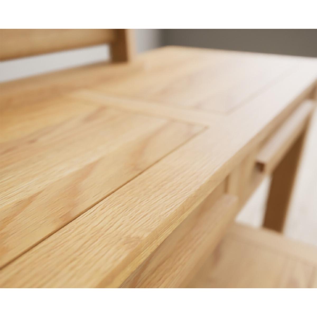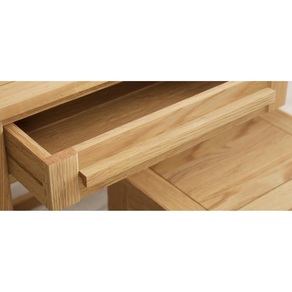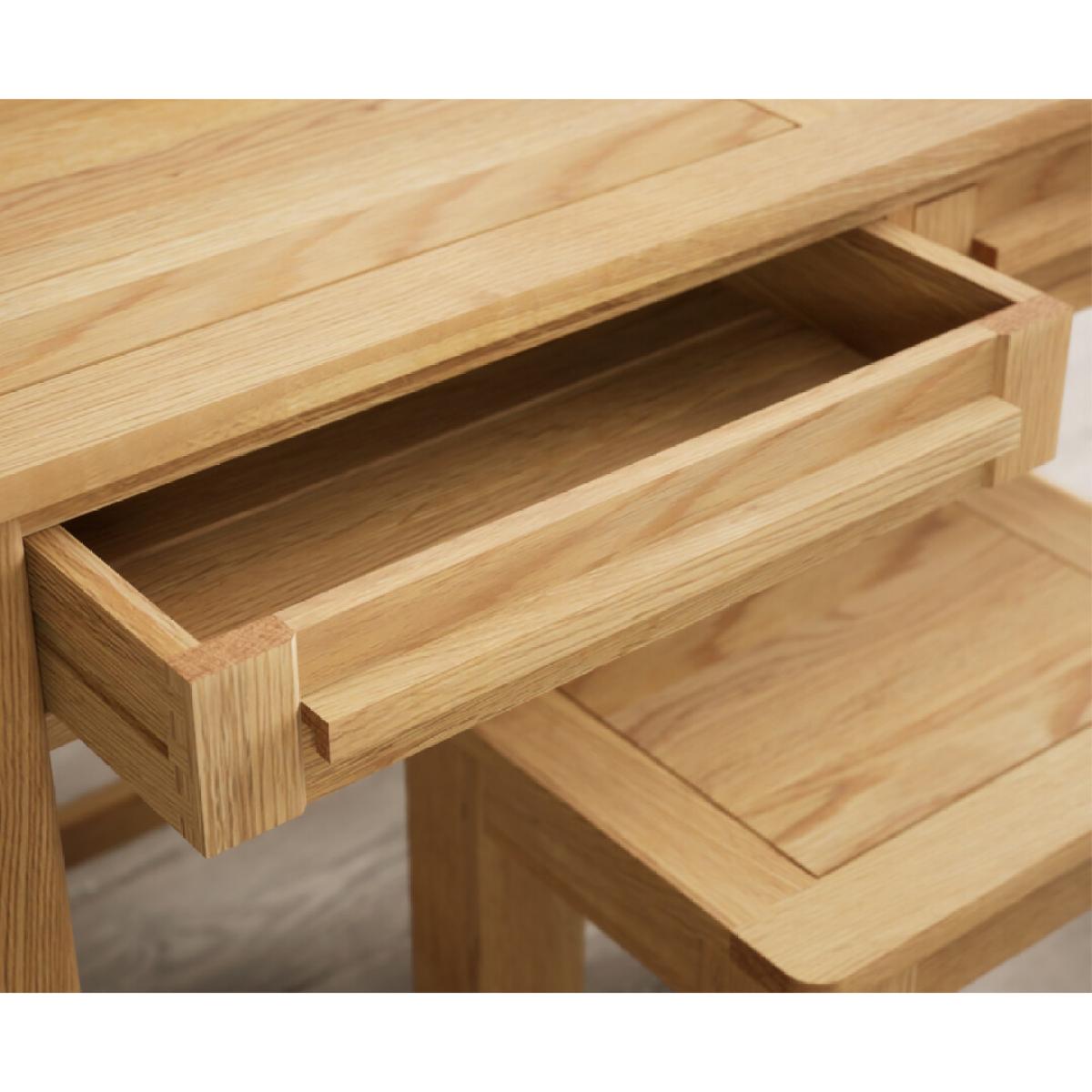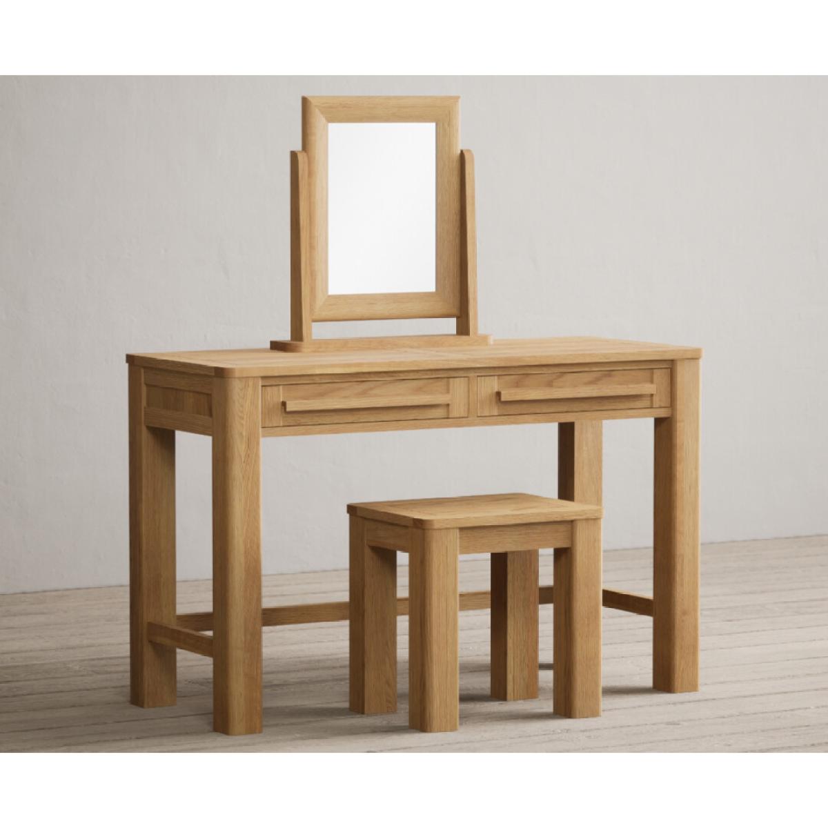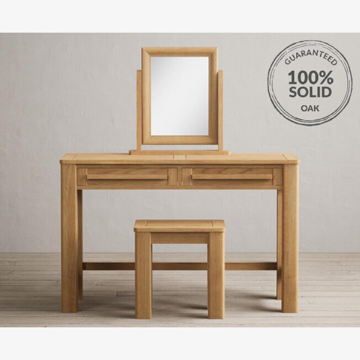 The Eclipse Solid Oak Dressing Table features a clear finish, with two Dovetail drawers with inbuilt handles, matched with a solid oak stool and adjustable mirror.