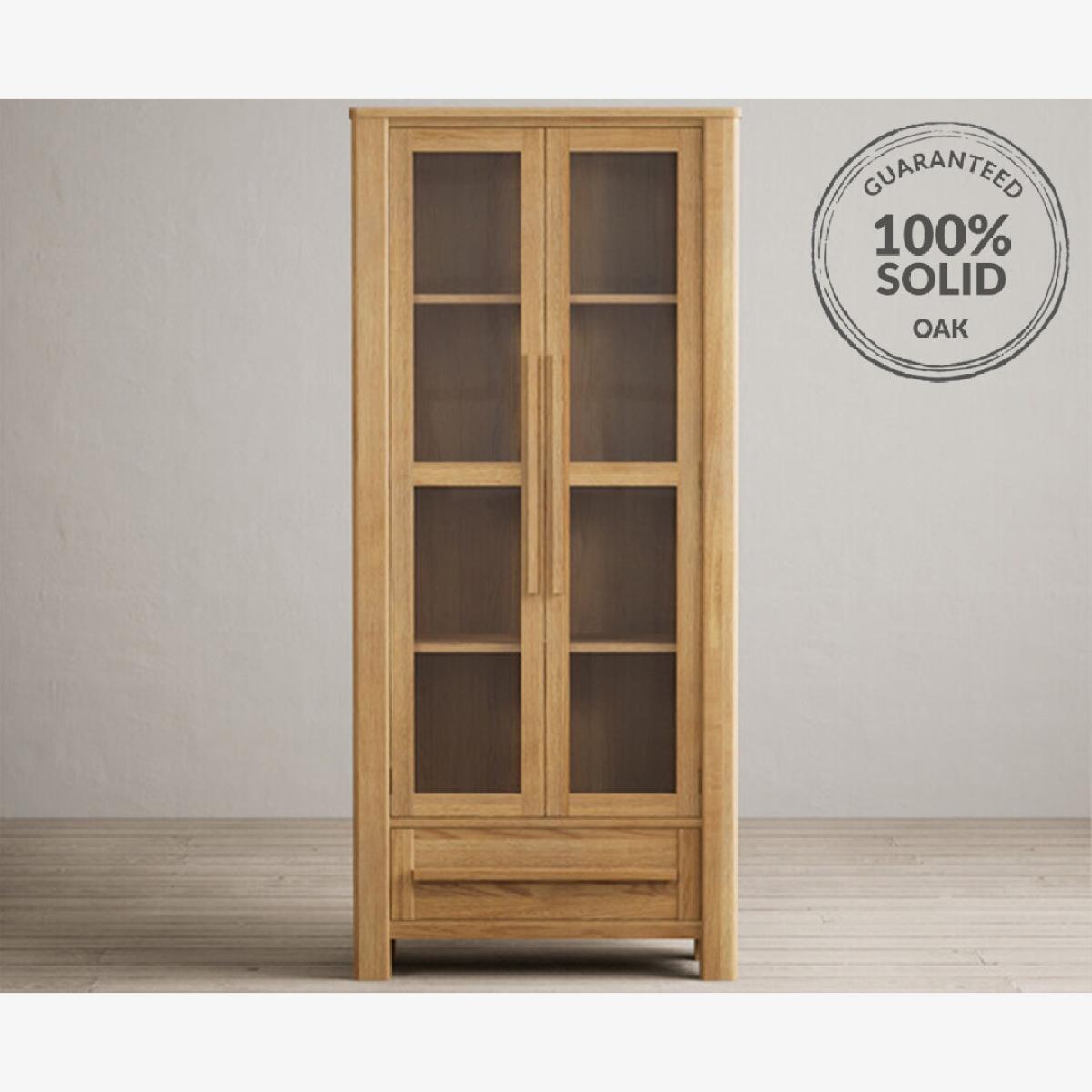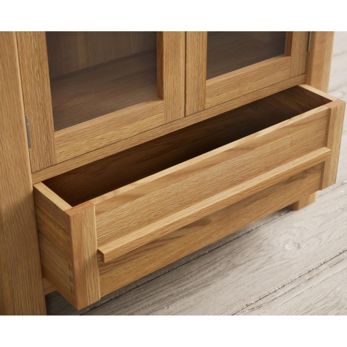 The Eclipse Solid Oak Glazed Display Cabinet features a clear finish, with sturdy shelves and inbuilt handles, glazed cupboard doors and Dovetail drawer.