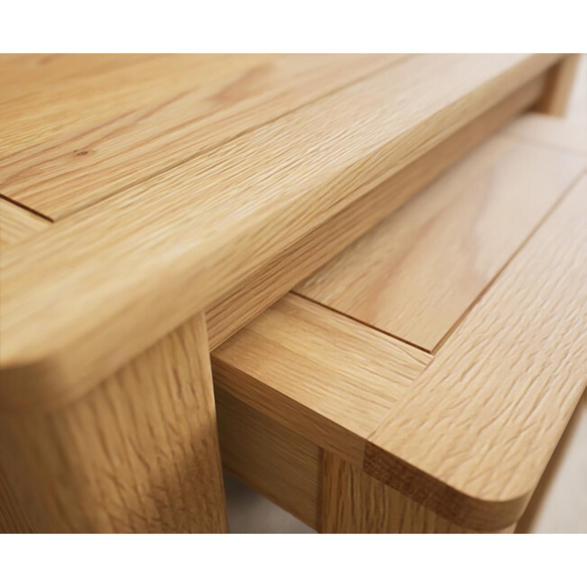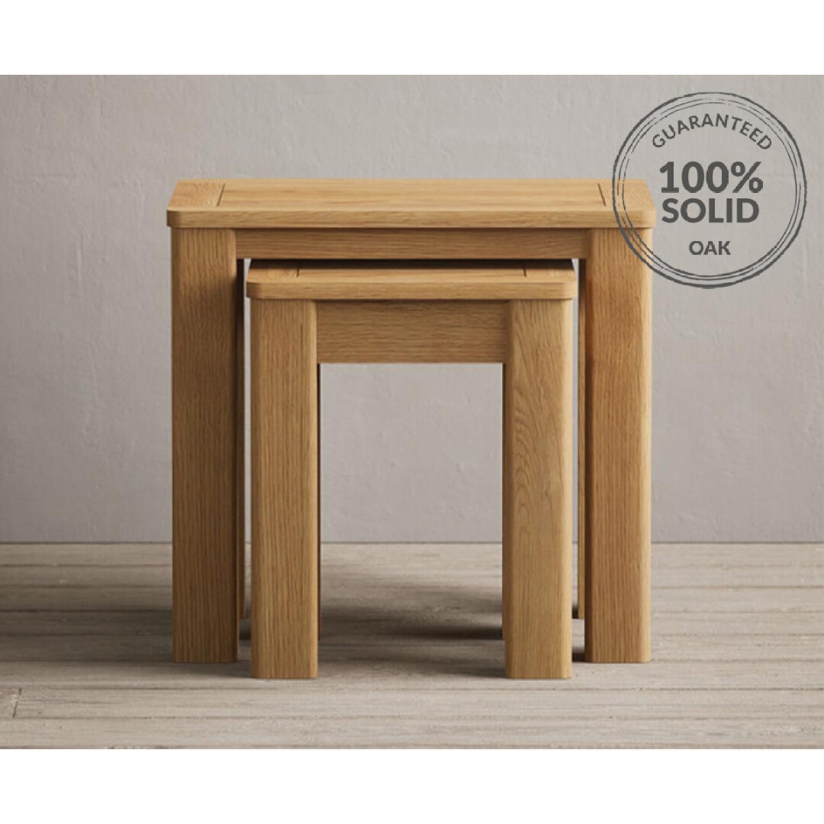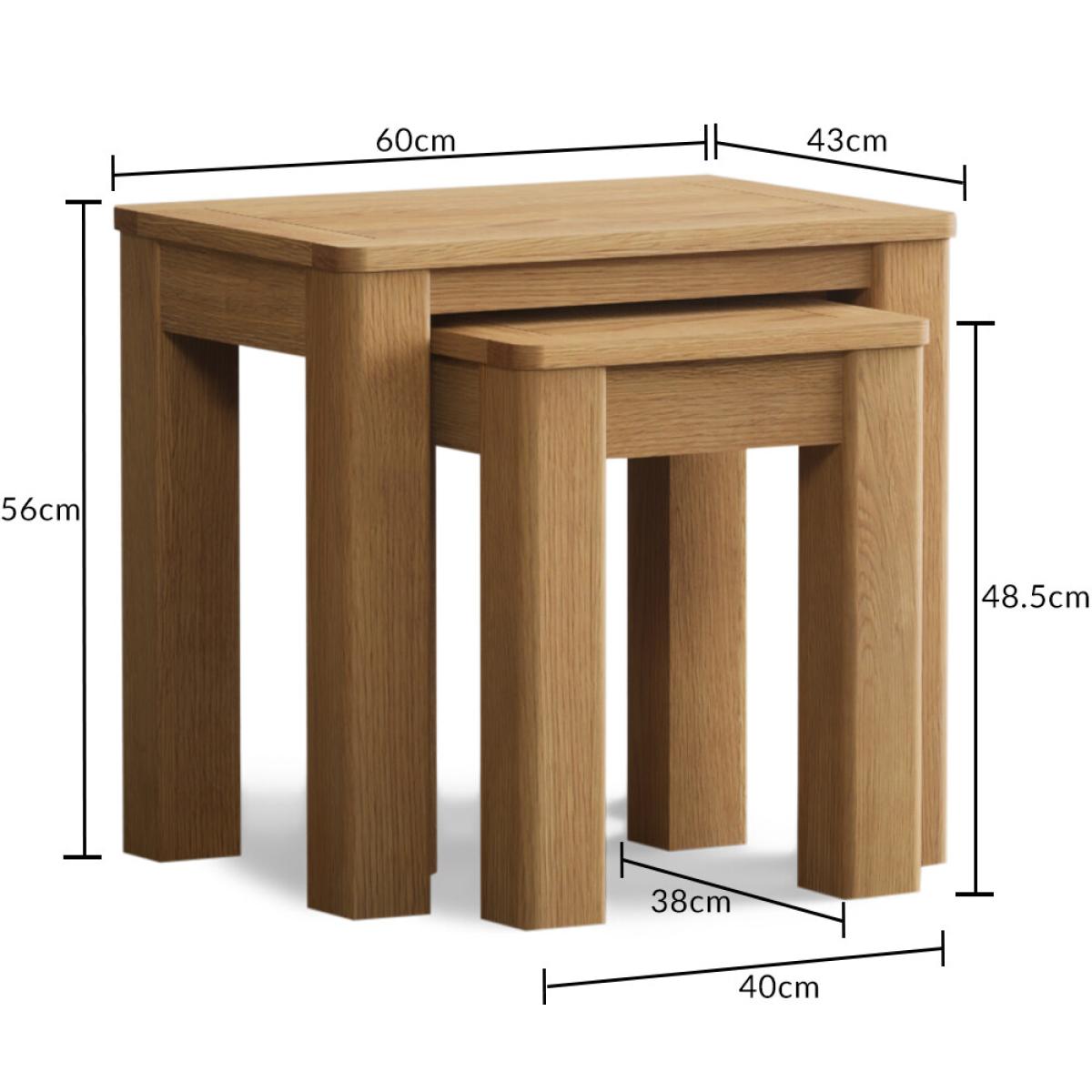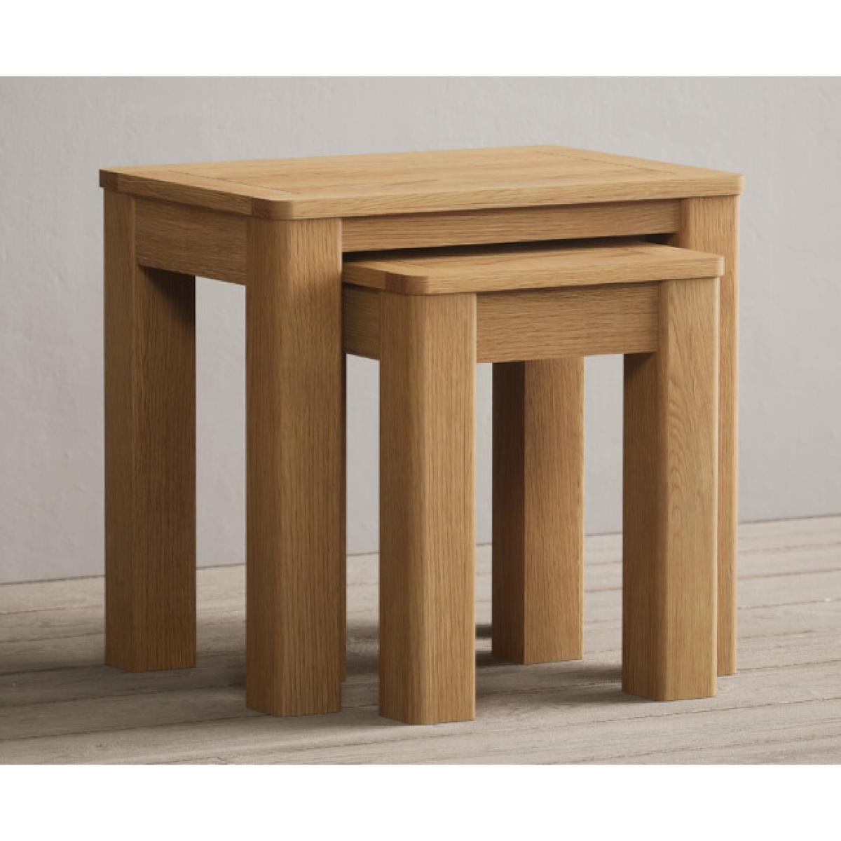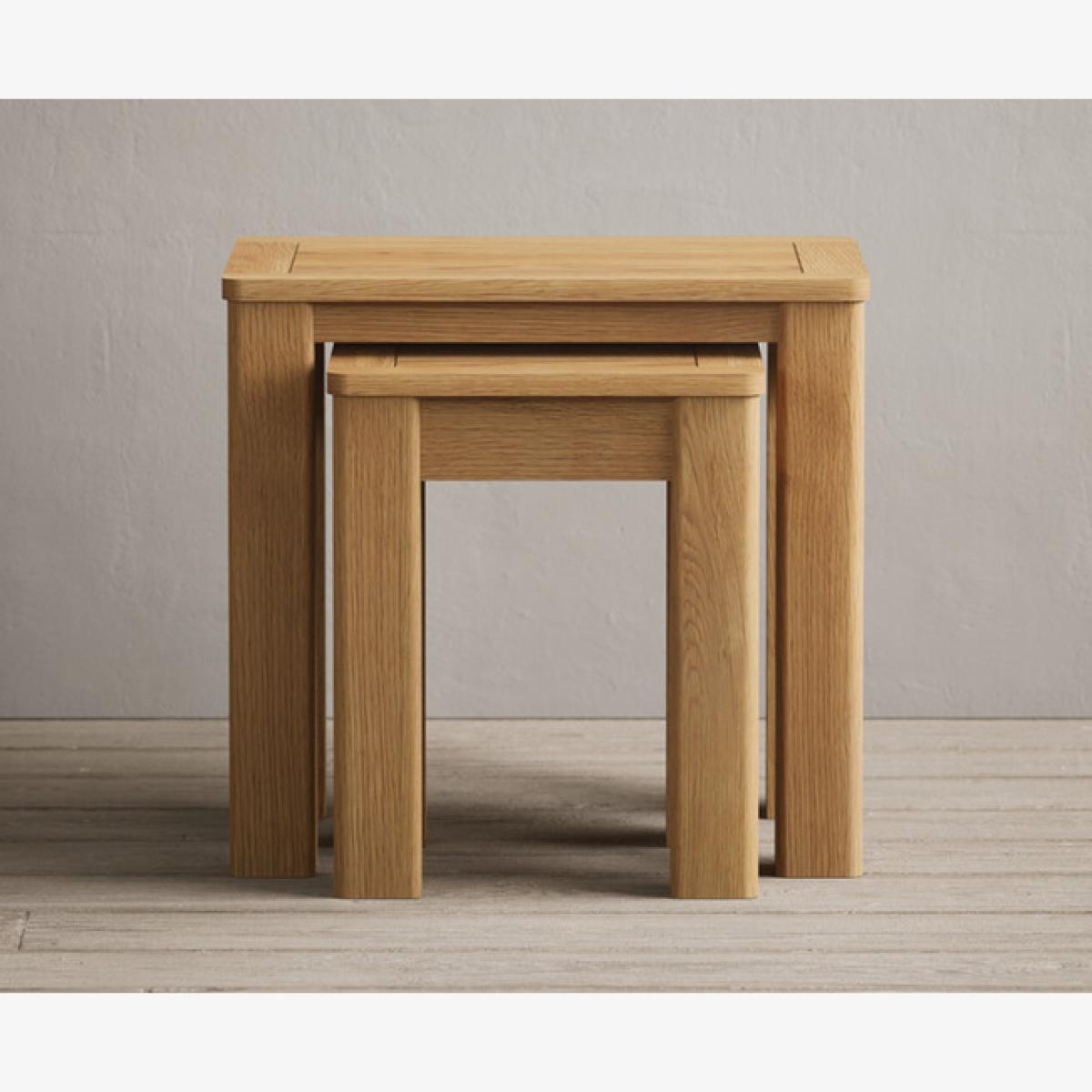 The Eclipse Solid Oak Nest of Tables is a set of two solid oak tables with a clear protective finish and minimalist panelled design that stack together when not in use.