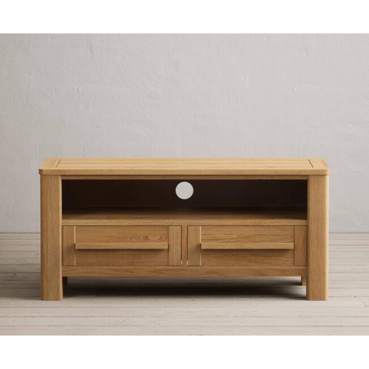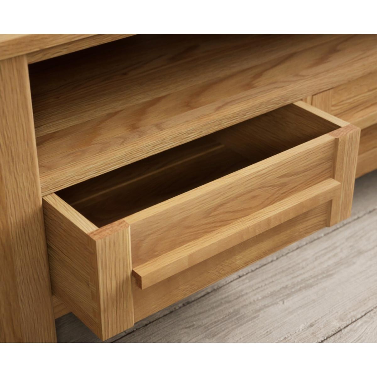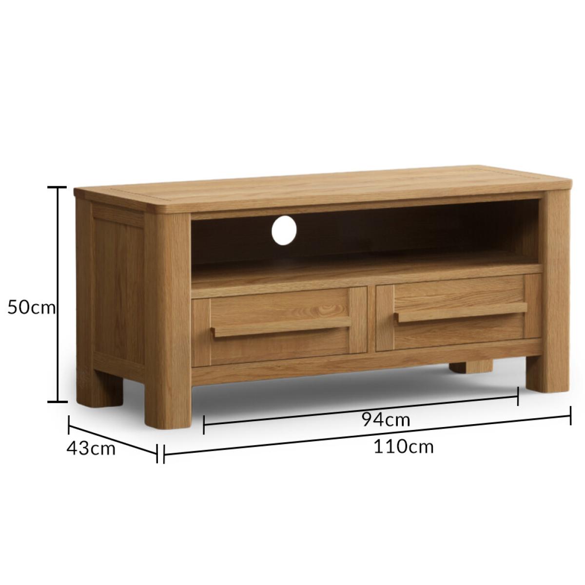 The Eclipse Solid Oak Small TV Cabinet features two Dovetail drawers with inbuilt handles and a hole at the back for cable management.