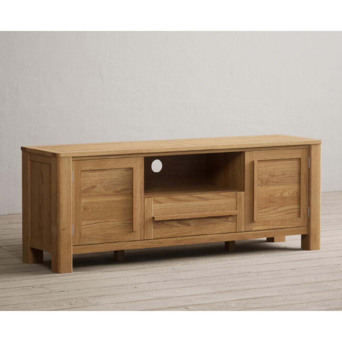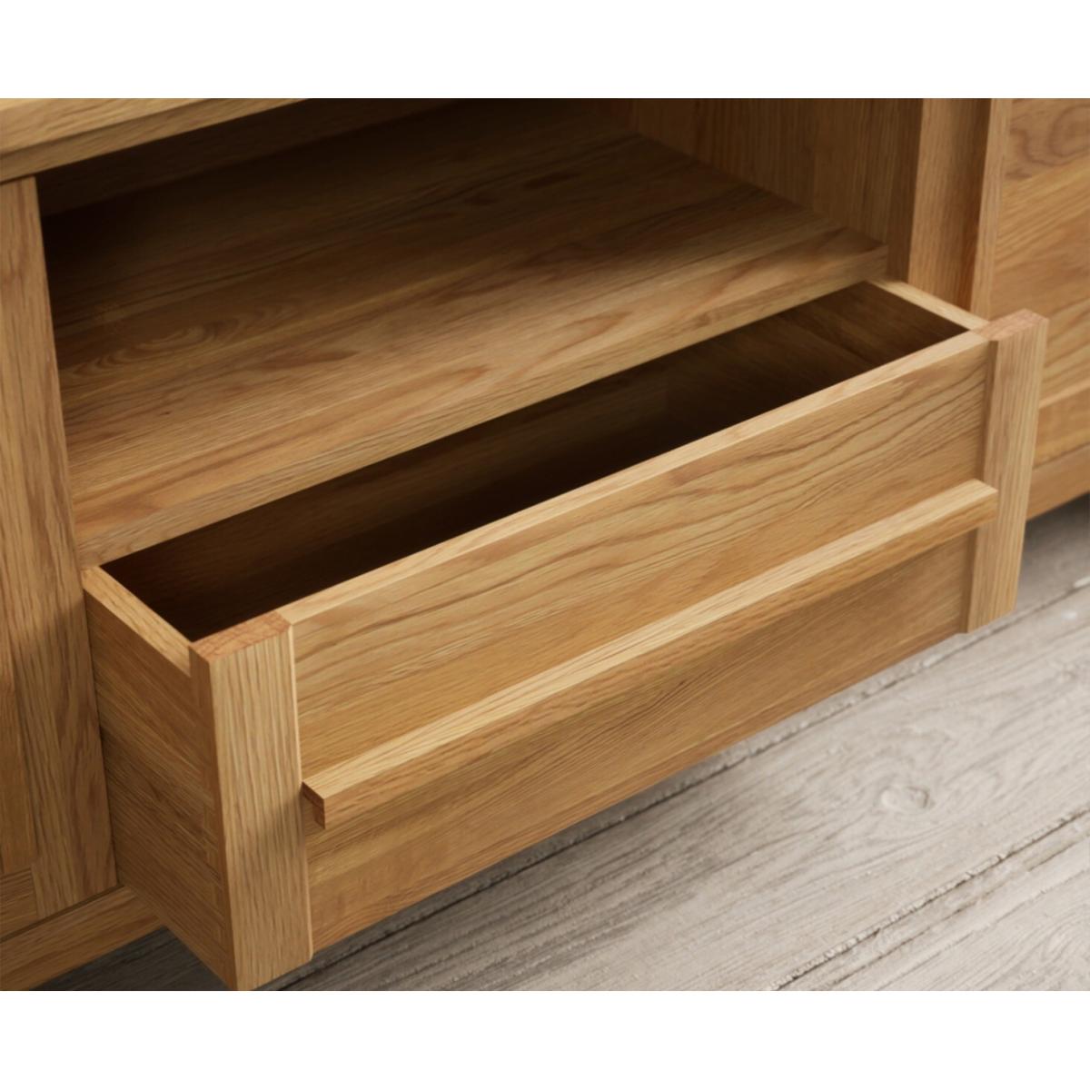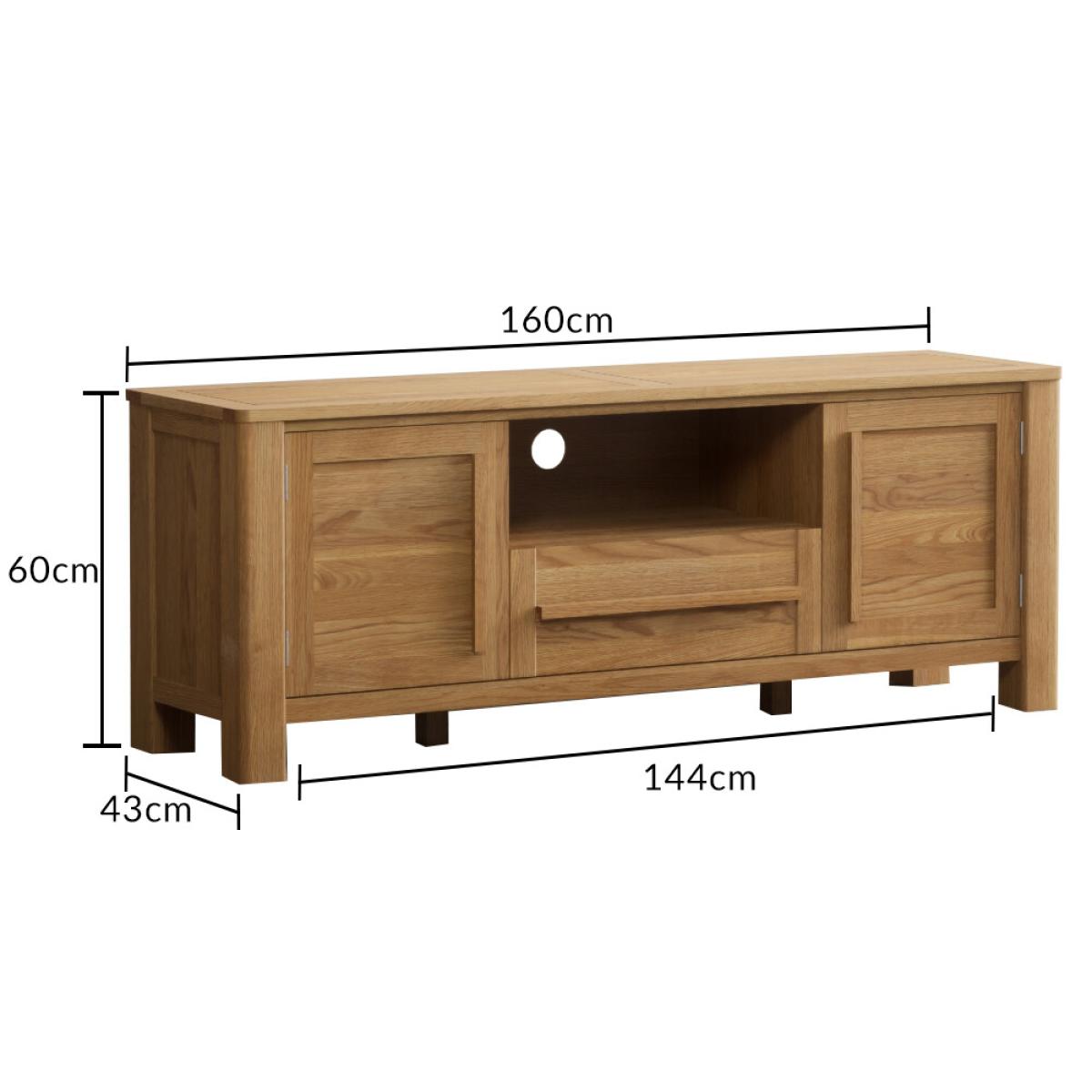 The Eclipse Solid Oak Super Wide TV Cabinet features two cupboards and a Dovetail drawer with inbuilt handles, complete with a cable management hole.