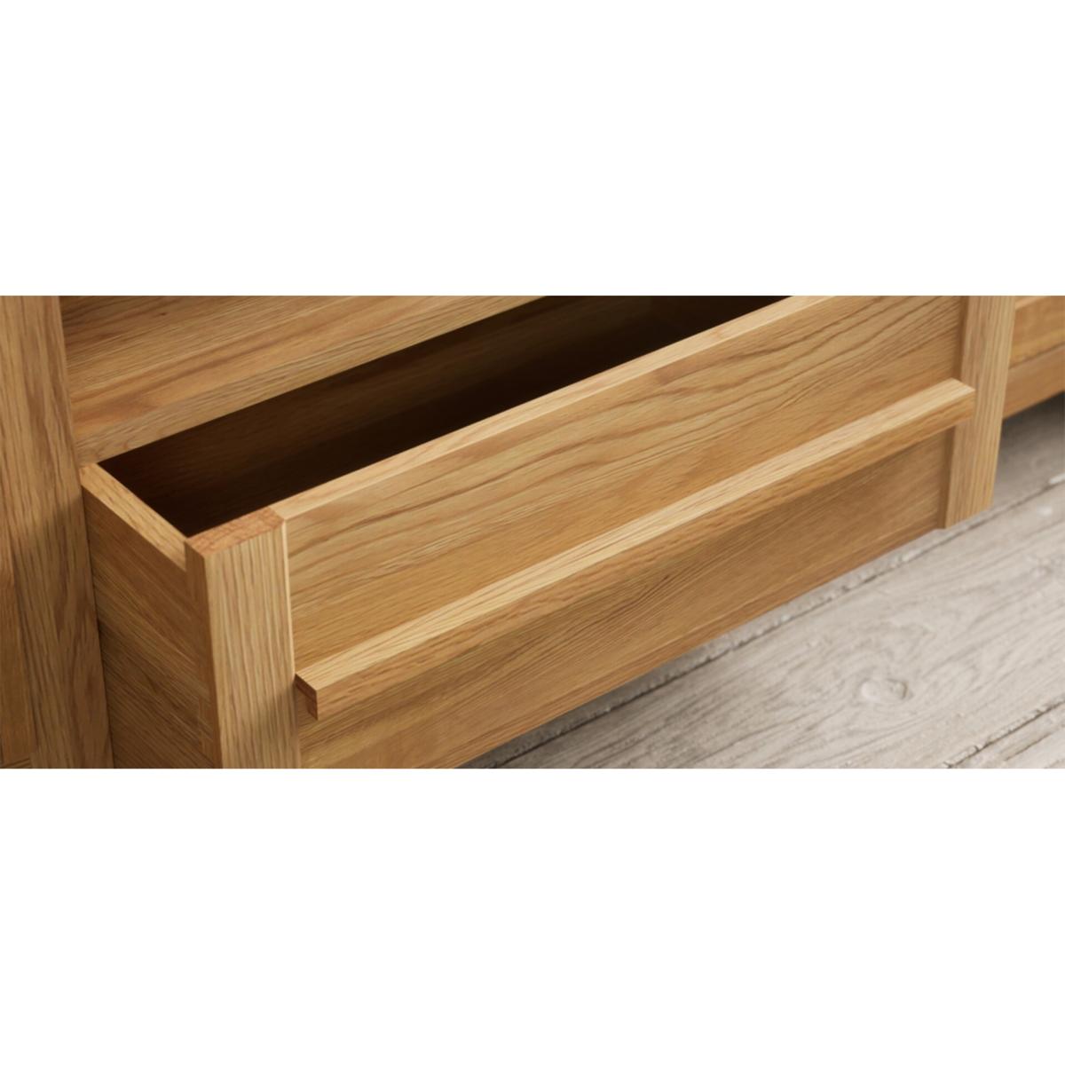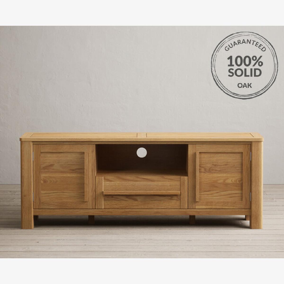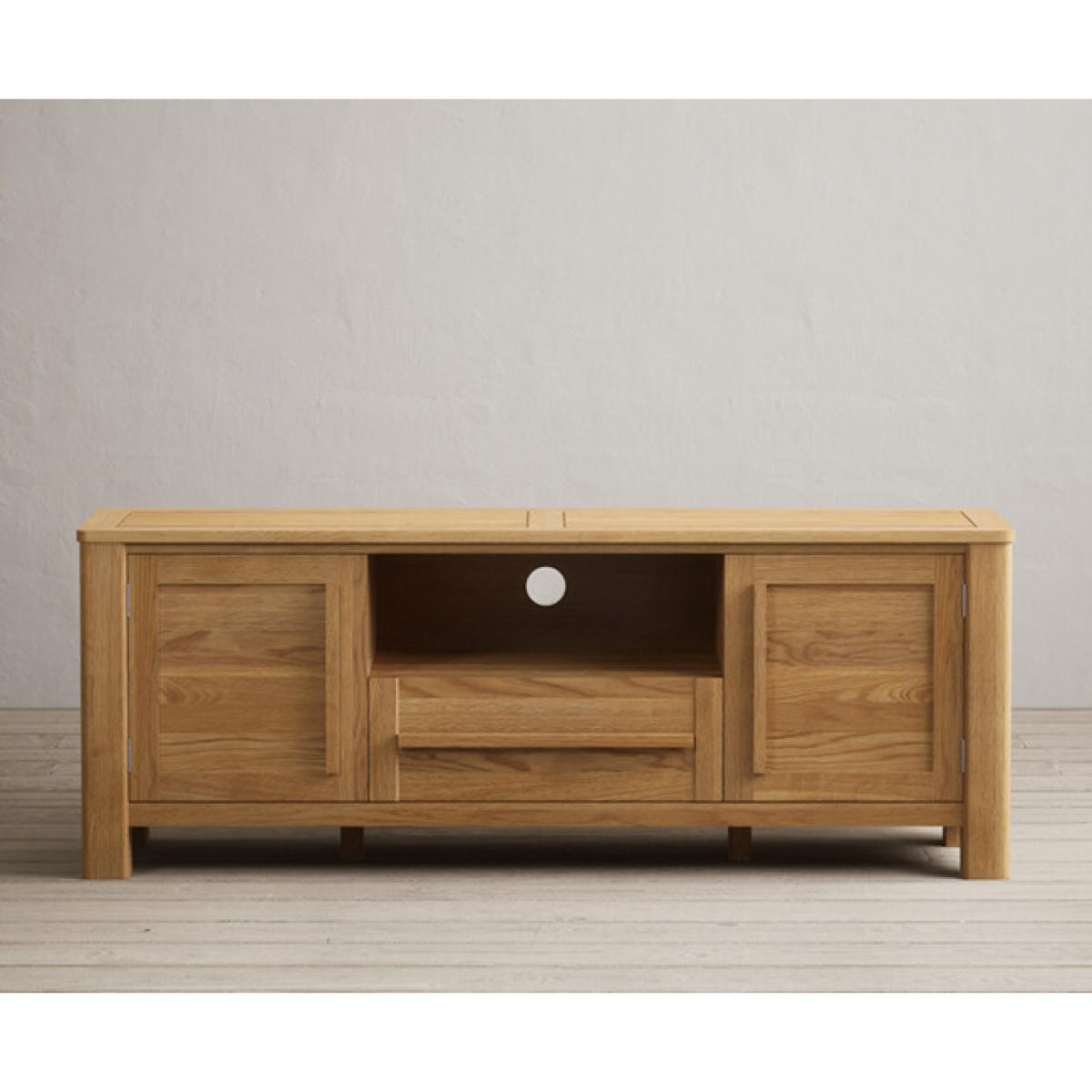 The Eclipse Solid Oak Super Wide TV Cabinet features two cupboards and a Dovetail drawer with inbuilt handles, complete with a cable management hole.