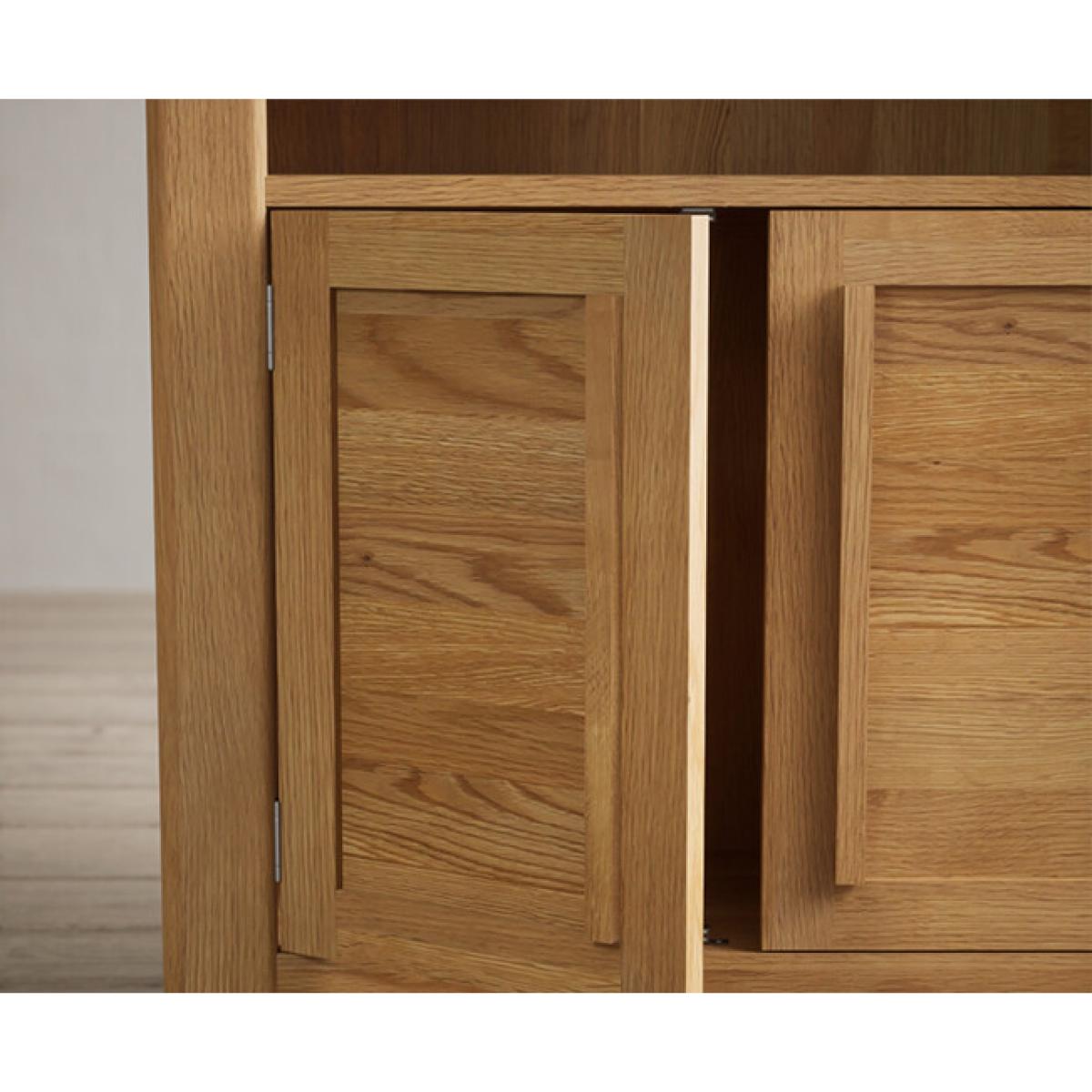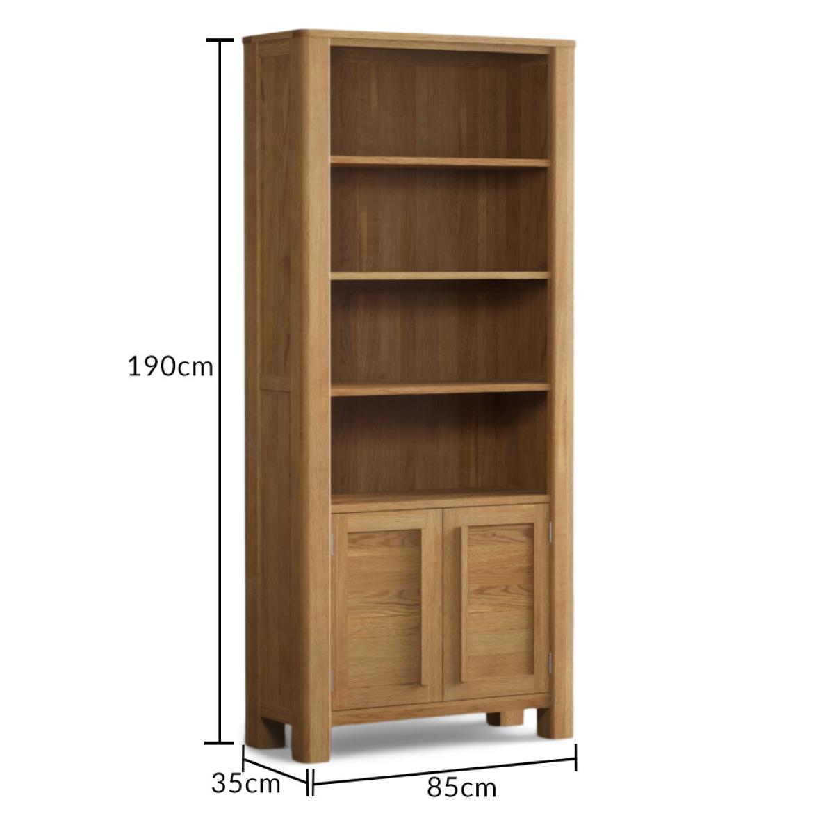 The Eclipse Solid Oak Tall Bookcase features a clear finish, with three shelves and a two door cupboard with inbuilt handles.