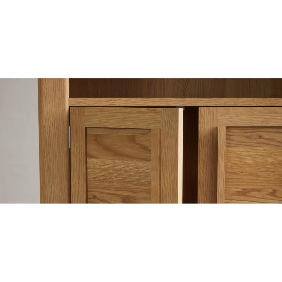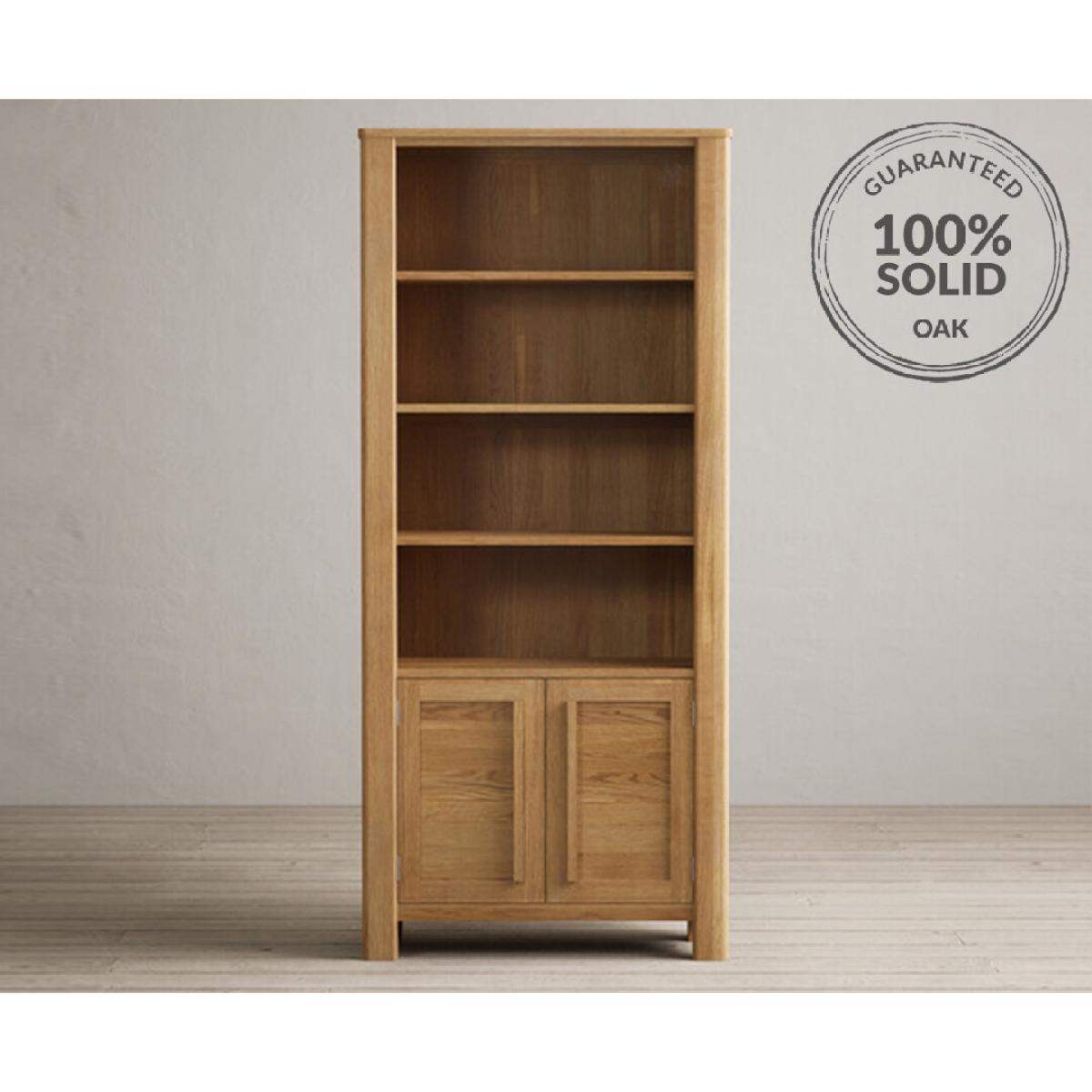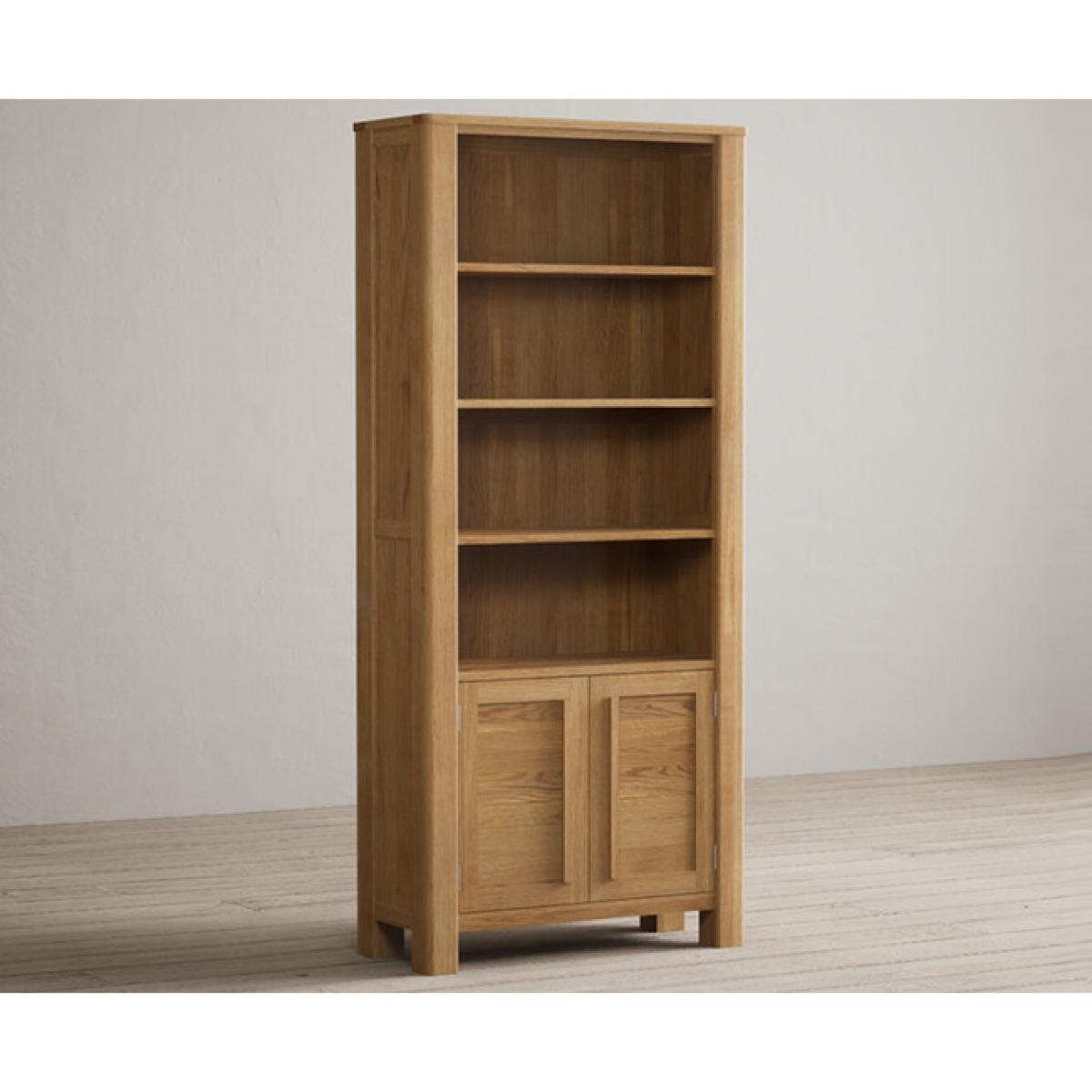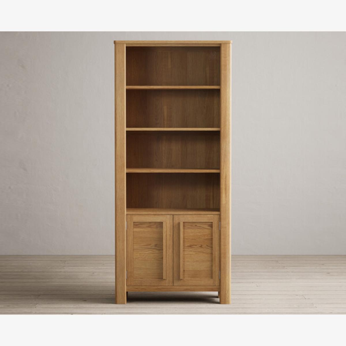 The Eclipse Solid Oak Tall Bookcase features a clear finish, with three shelves and a two door cupboard with inbuilt handles.