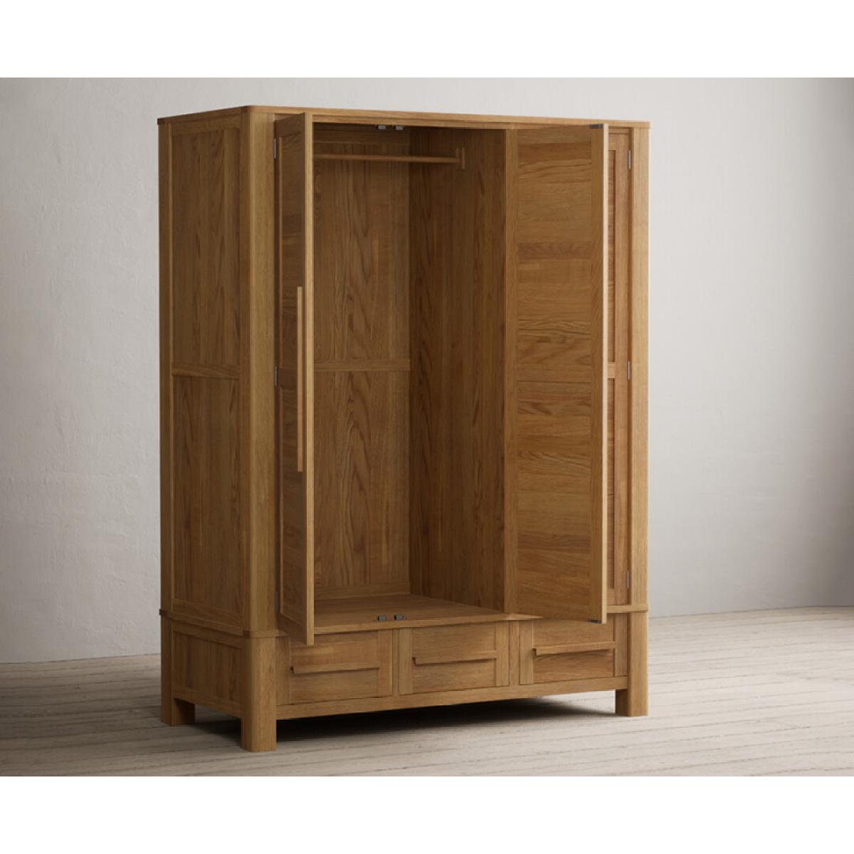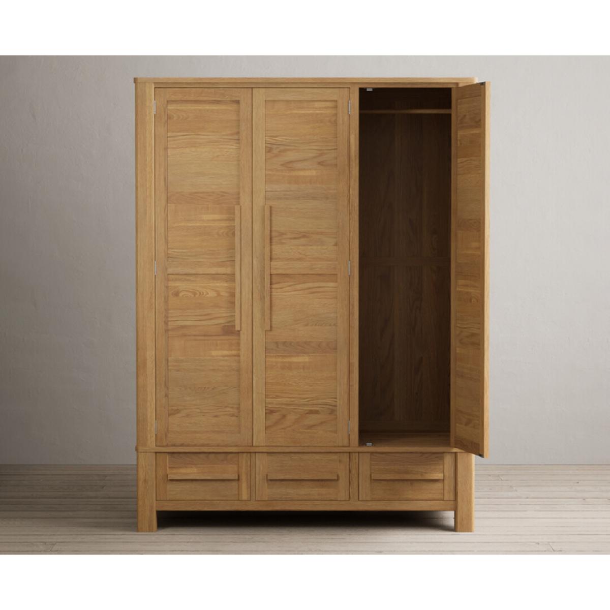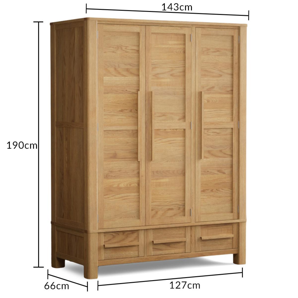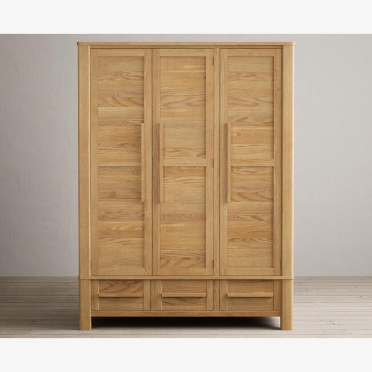 The Eclipse Solid Oak Triple Wardrobe features a natural finish and minimalist panelled design, complete with Dovetail drawers and inbuilt handles.