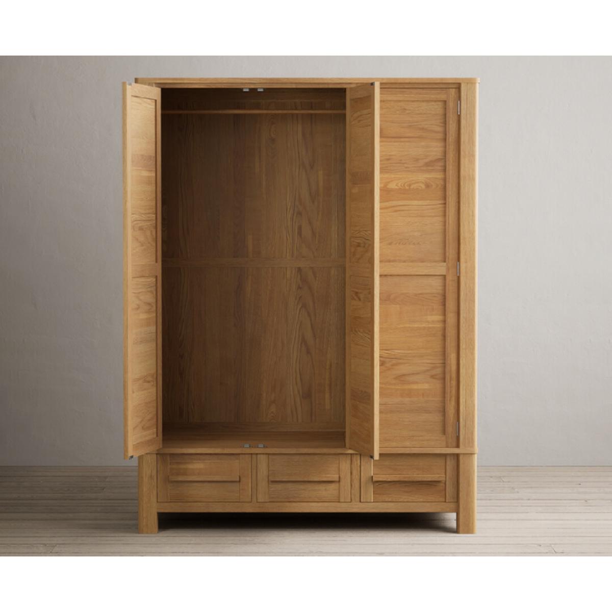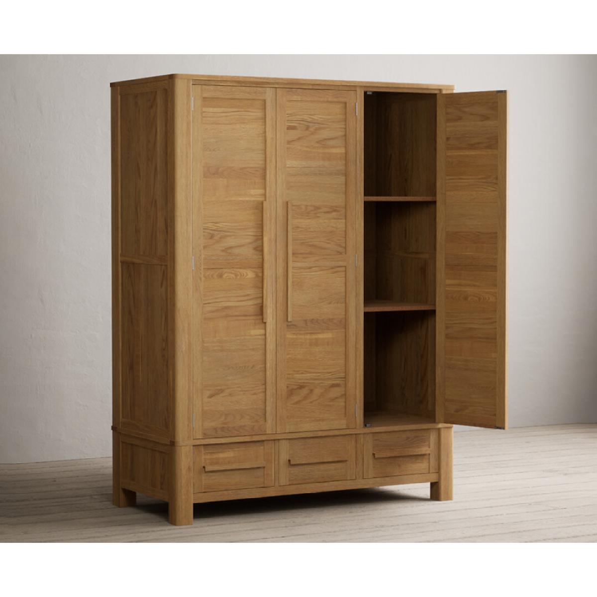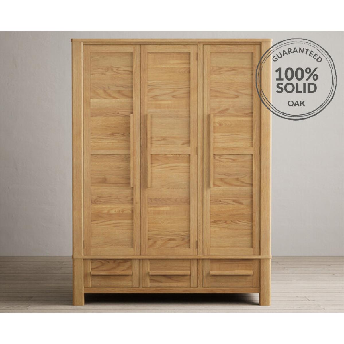 The Eclipse Solid Oak Triple Wardrobe features a natural finish and minimalist panelled design, complete with Dovetail drawers and inbuilt handles.