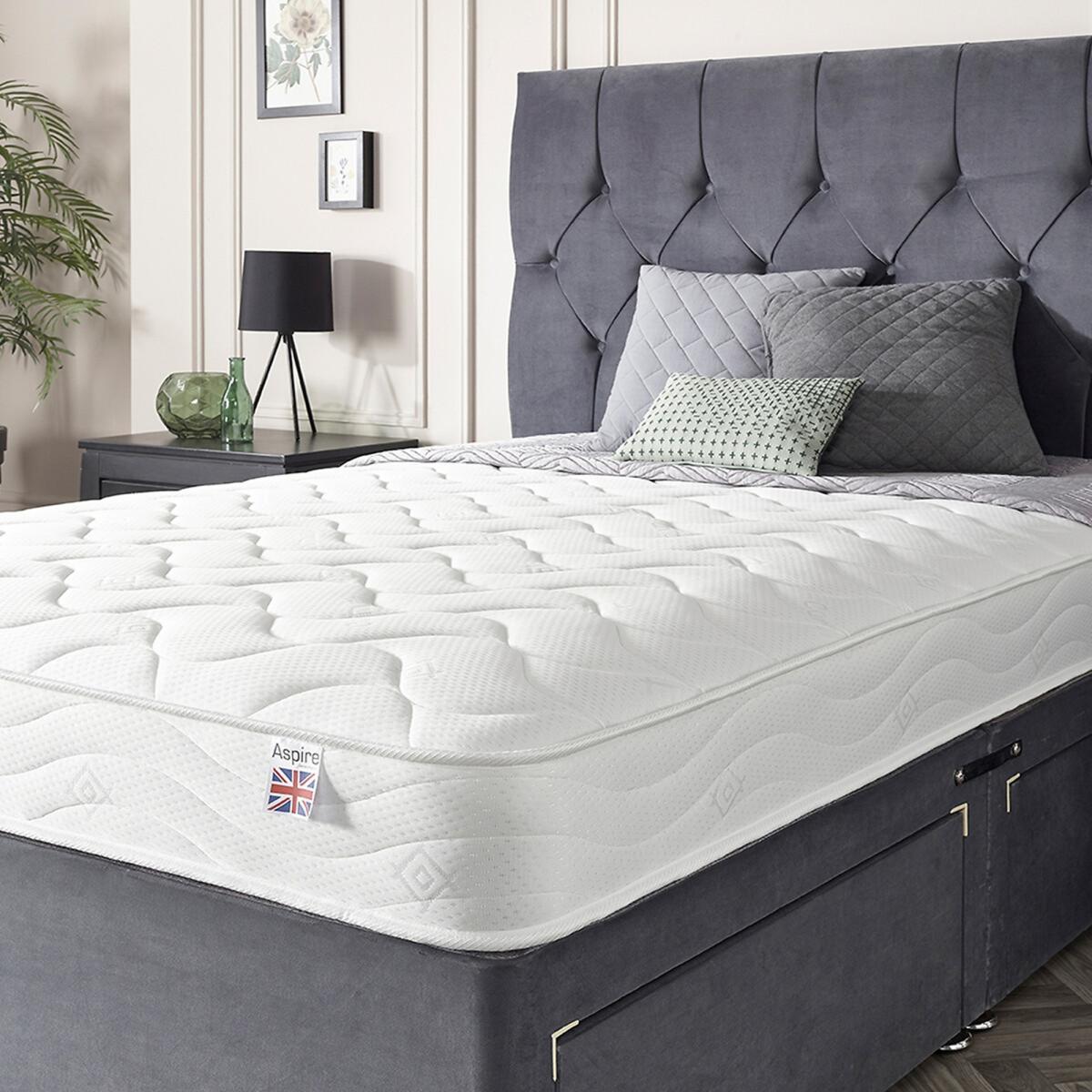 Please note: this product cannot be delivered to all Offshore Islands, Northern Island or Republic of Ireland. Aspire Eco Foam Rolled MattressBONNEL. L SPRUNG OPEN COIL MATTRESS: This 19cms Deep Bonnell Spring Mattress Features A Premium Spring System With A Unique 3 Layer Comfort Construction Combining Layers Of Eco Foam Eco Cloud Poly & Memory Foam Creating An Exceptional Mattress. DOUBLE FILLINGS MEANS DOUBLE COMFORT: We’ve Torn Up The Budget Mattress Rulebook By Doubling The Amount Of Fillings & Memory Foam & Doubling The Comfort Compared To Other Budget Mattresses. It’s Budget Mattresses Redesigned Redefined & RevolutionizedASPIRE-COO. L TOUCH AC SLEEP SURFACE: The Aspire-Cool Touch Sleep Surface Is Up to 10 Times More Breathable Than Standard mattress fabric Providing Air-Conditioned Sleep For Your Body By Regulating Core Temperature & Inhibiting Overheating Whilst Asleep. ACTIVE PRESSURE RELIEVING SLEEP SURFACE: Our Sleep Scientists Have Created A Sleep Surface Design With A Luxurious Long Wave Quilted Design Which Actively Supports The Body’s Key Pressure Points For A Stress Free & Pressure Relieving Night’s SleepU K MADE & EASY SHIPPING: This Mattress Is Designed & Manufactured In The UK & Meets All UK Fire Standards & Utilises Aspire Roll Tech For The Easiest Possible Delivery. The Mattress Is Compressed Rolled & Arrives In An Easy To Handle Box Ready For Unpacking. Product Dimensions: Single: 21cmx90cmx190cm. Small Double: 21cmx120cmx190cm. Double: 21cmx135cmx190cm. King: 21cmx150cmx200cm. Please remember to measure your available space before ordering. Packaged Dimensions: Single: 90cmx 38cmx 38cm Weight: 12.5kg. Small Double: 120cmx 38cmx 38cm Weight: 18.5kg. Double: 135cmx 38cmx 38cm Weight: 20.5kg. King: 150cmx 38cmx 38cm Weight: 30.5kg. This product will be dispatched by one of our trusted suppliers. You’ll be contacted by their selected courier about your delivery.