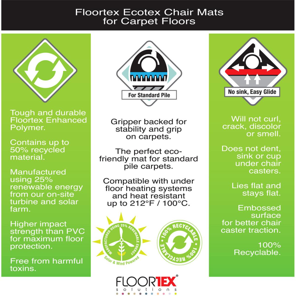 The Floortex Ecotex Evolutionmat is one of the tops of the range plastic chair mats Floortex offer and also has the benefit of many green credentials. Manufactured from an enhanced polymer that contains up to 50% recycled material and is 100% recyclable. The Evolutionmat protects your flooring from damage and helps reduce your carbon footprint. Chair mats have the added benefit of making your workspace more ergonomic help take the strain off of the legs and back. Smooth back for hard floors. Not suitable for carpeted flooring.