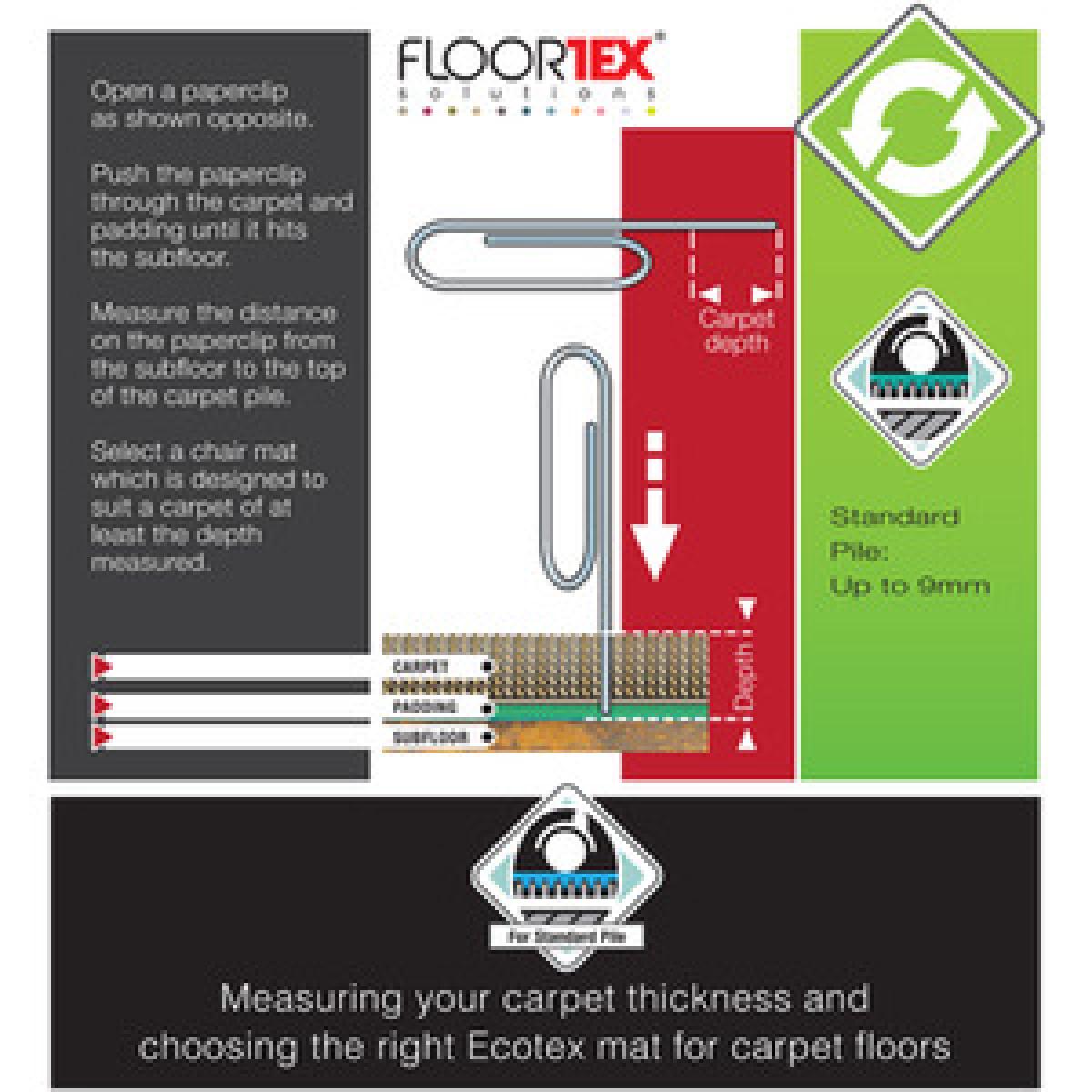 The Floortex Ecotex Evolutionmat is one of the top of the range plastic chair mats Floortex offer and also has the benefit of many green credentials. Manufactured from an enhanced polymer that contains up to 50% recycled material and is 100% recyclable. The Evolutionmat protects your flooring from damage and helps reduce your carbon footprint. Chair mats have the added benefit of making your workspace more ergonomic helping take the strain off of the legs and back. Gripper back for standard pile carpets. Not suitable for hardwood, laminate, vinyl, or wood flooring.
