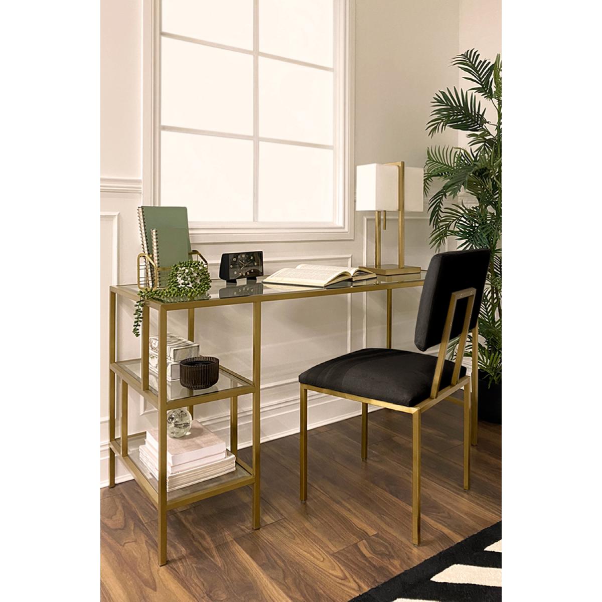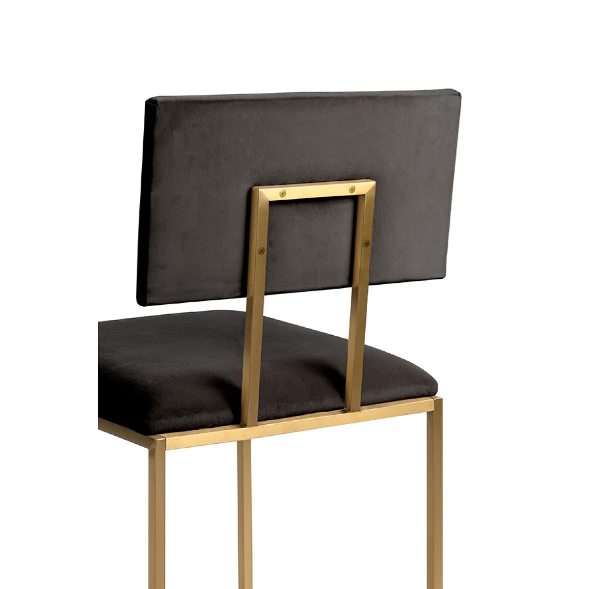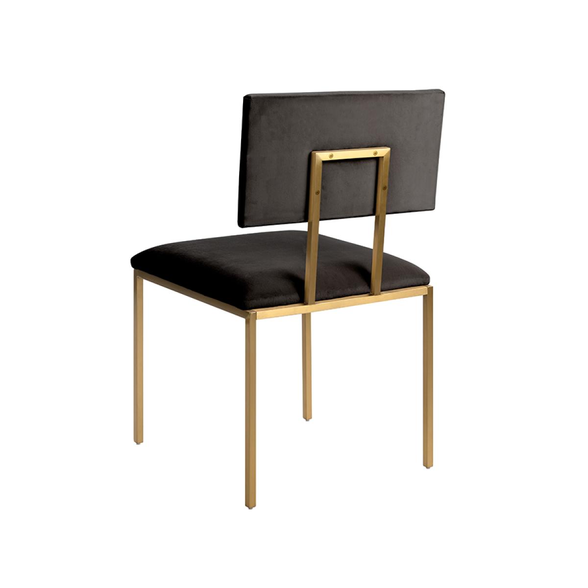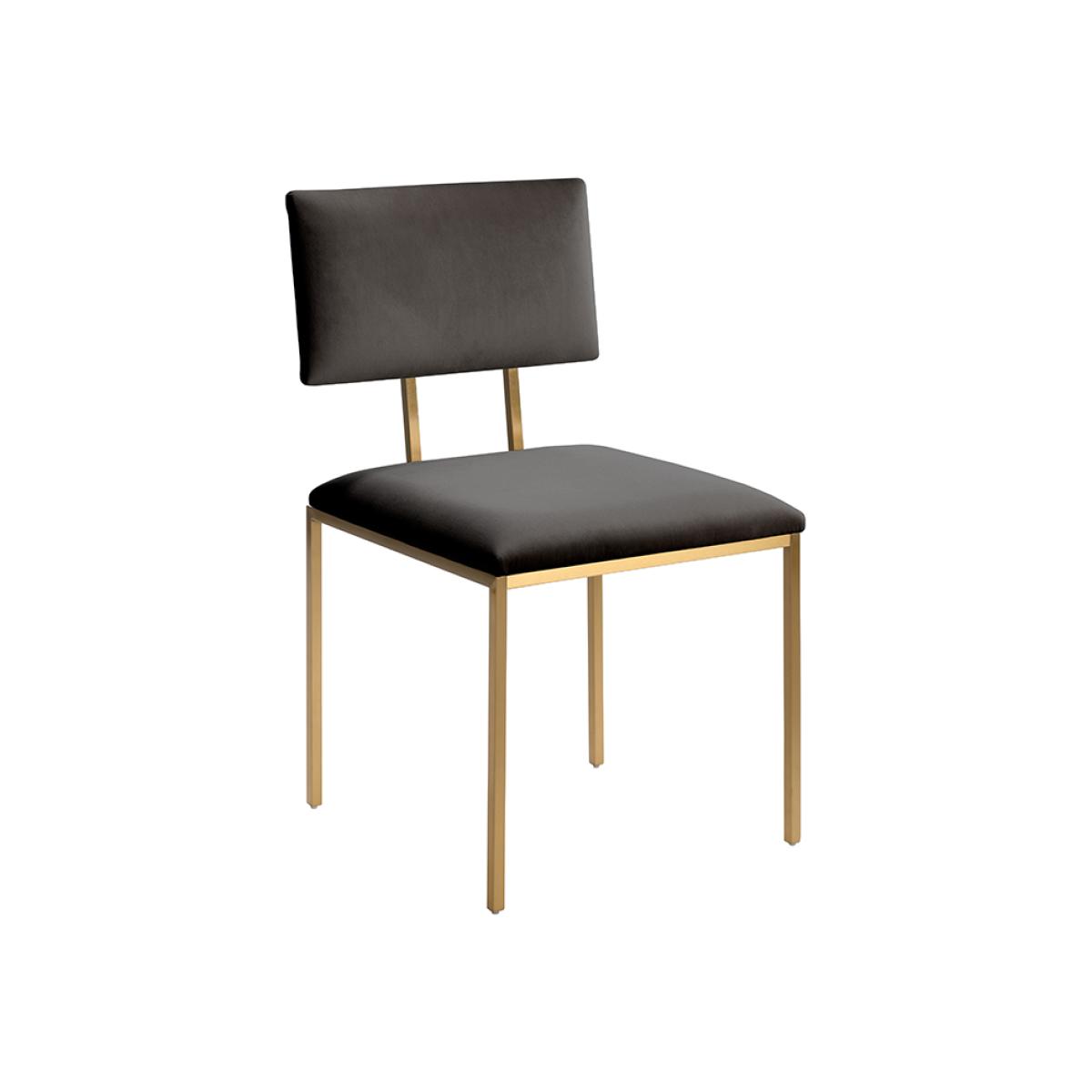 A sleek and contemporary, geometric-inspired dining chair. Precision-engineered steel frame with a brushed brass finish. Comfortable foam padded seat and backrest. Velvet upholstery fabric. Assembly required – approximately ten minutes.