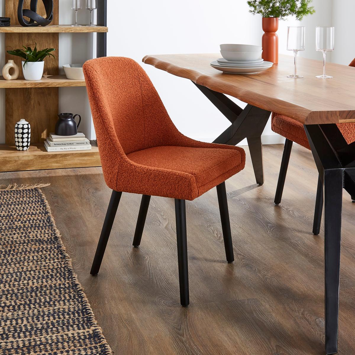 I’m a big fan of this boucle dining chair in orange - let’s call it the Eddie chair - for injecting warmth and texture into a room without shouting for attention. Its soft, tactile fabric works brilliantly in contemporary Scandi schemes or modern eclectic spaces, pairing especially well with light timber tables and muted greys. For a balanced look, team it with brass or matte-black accessories and natural linen cushions; in a compact dining nook, two or four Eddie chairs around a round table will keep the setting feeling spacious and inviting.