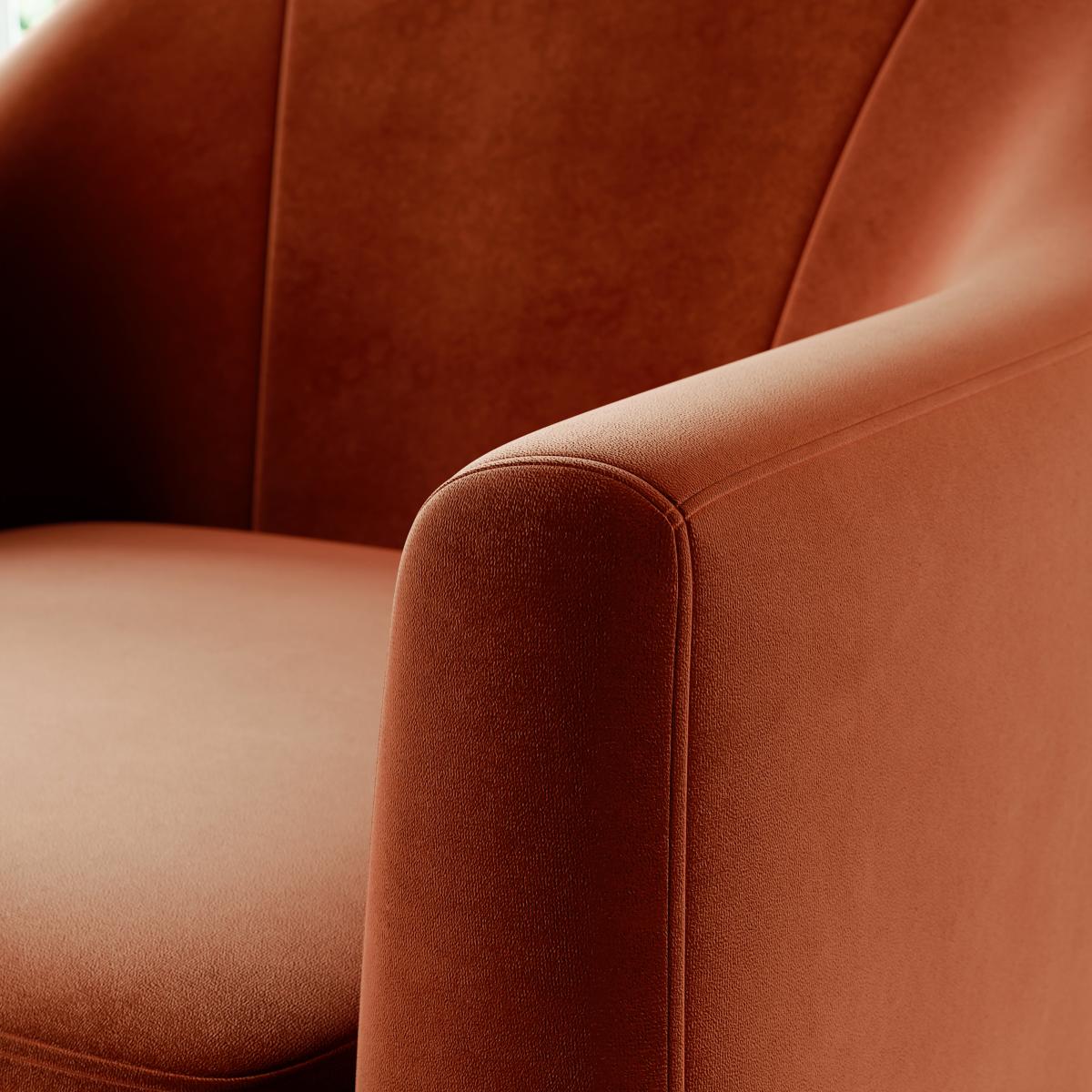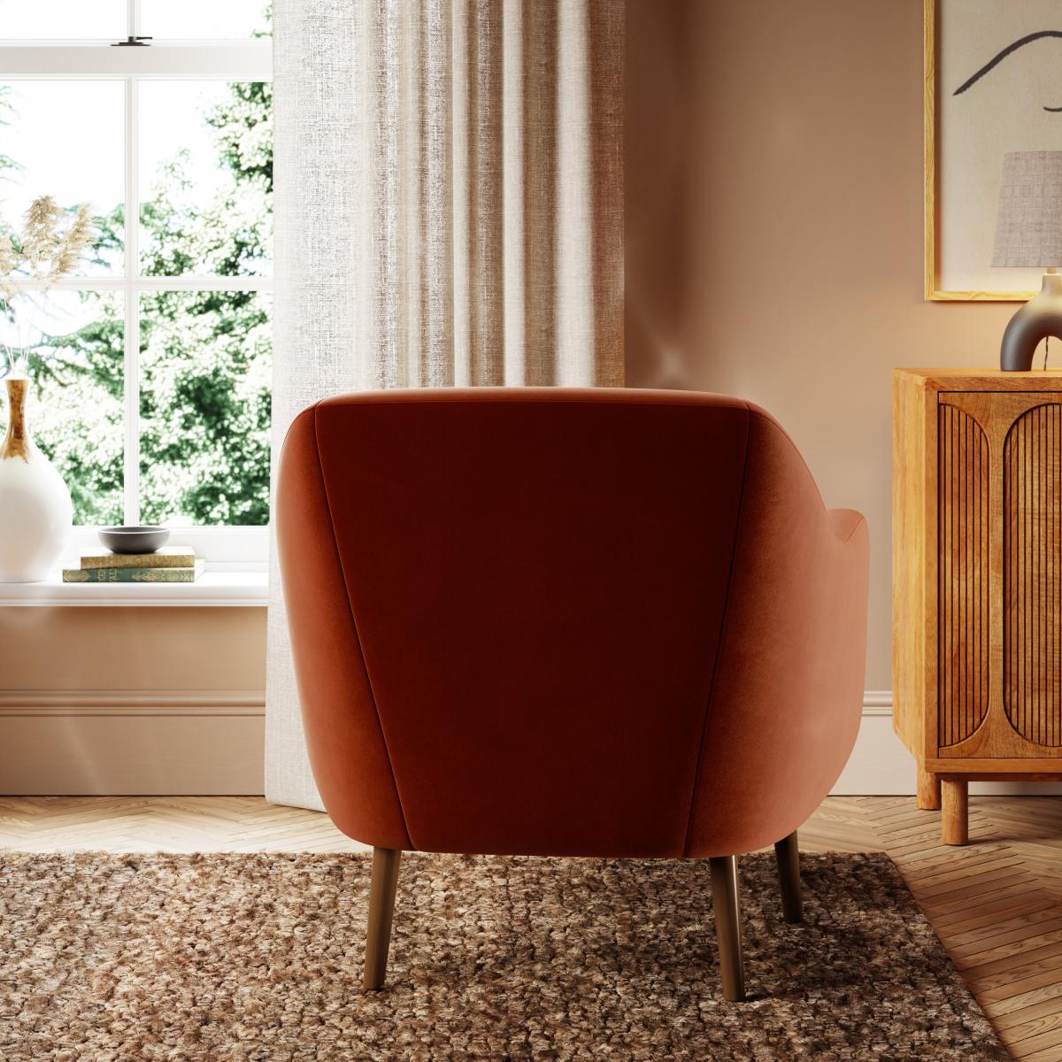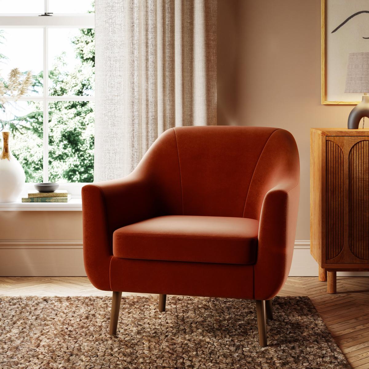 I love the Eddie tub armchair for its bold, warm tone and inviting silhouette, making it a real statement piece in any living space. Its velvet upholstery adds a touch of luxe and texture, perfect for both contemporary and retro interiors. This chair works particularly well in a neutral setting, such as beige, cream, or grey schemes, where it can become the focal point. For practical styling tips, pair it with patterned cushions or a cosy throw for added comfort and visual interest. It also looks great in living rooms, bedrooms, or reading nooks where its distinctive colour can really stand out without clashing with other colours - just keep surrounding furniture simple and understated to let the orange pop.