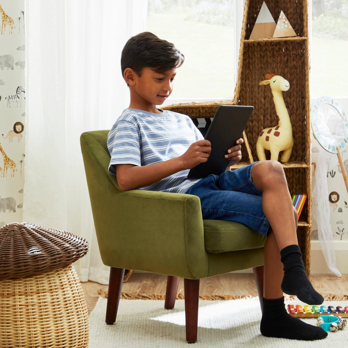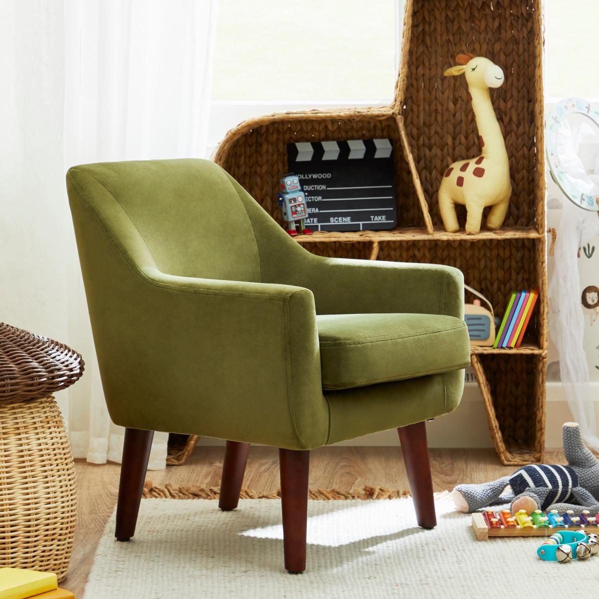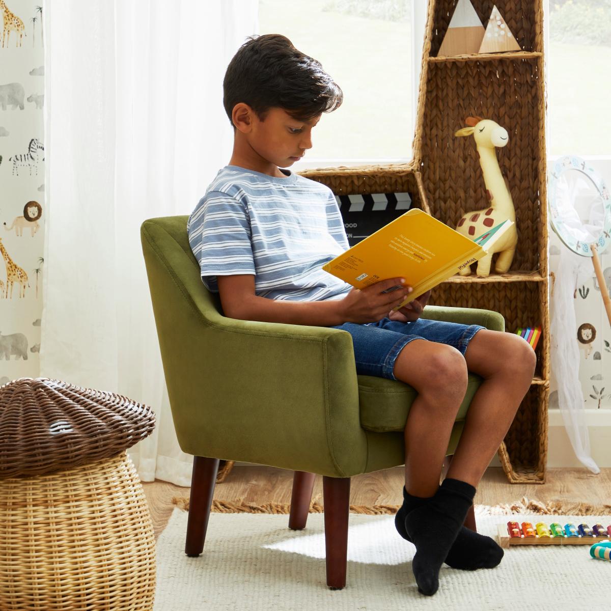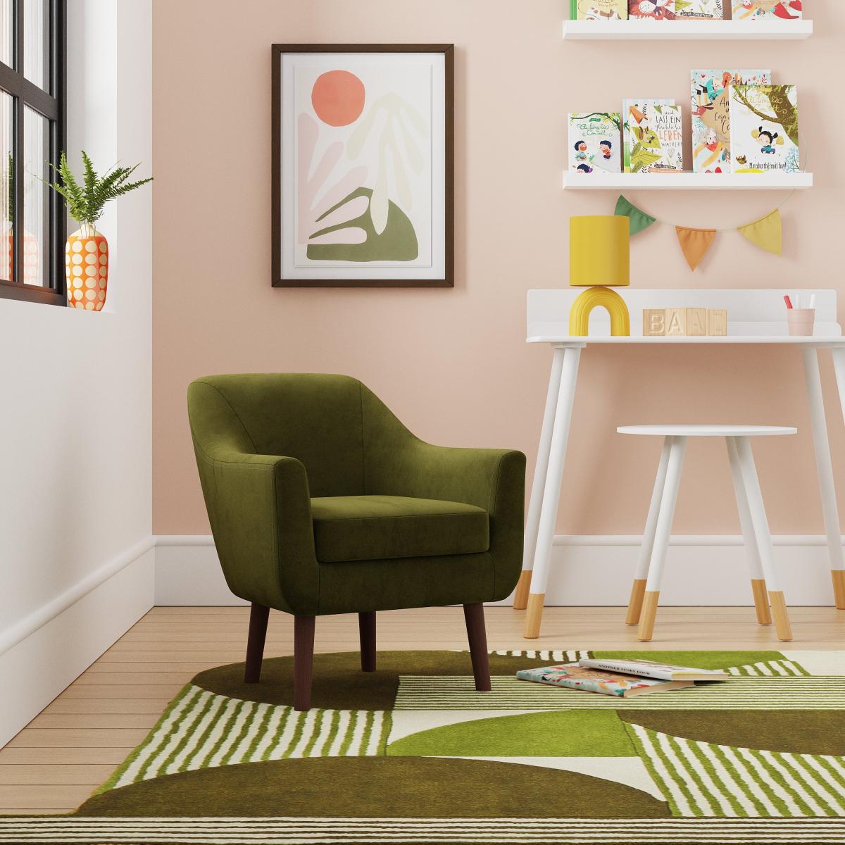 I love this little green chair because it adds a vibrant yet calming touch to a child's space. Its velvet texture brings a soft, tactile element that elevates the overall feel, making it suitable for both modern and eclectic interiors. It works especially well in rooms with a playful or floral scheme, and its bright colour makes it a great focal point for a reading nook or cosy corner. When styling, consider pairing it with neutral walls and adding fun accessories like colourful cushions or a small playful rug to keep the look lively. It’s practical too, as the size is perfect for growing kids and the upholstery is durable, making it a functional yet stylish choice for any child's room.