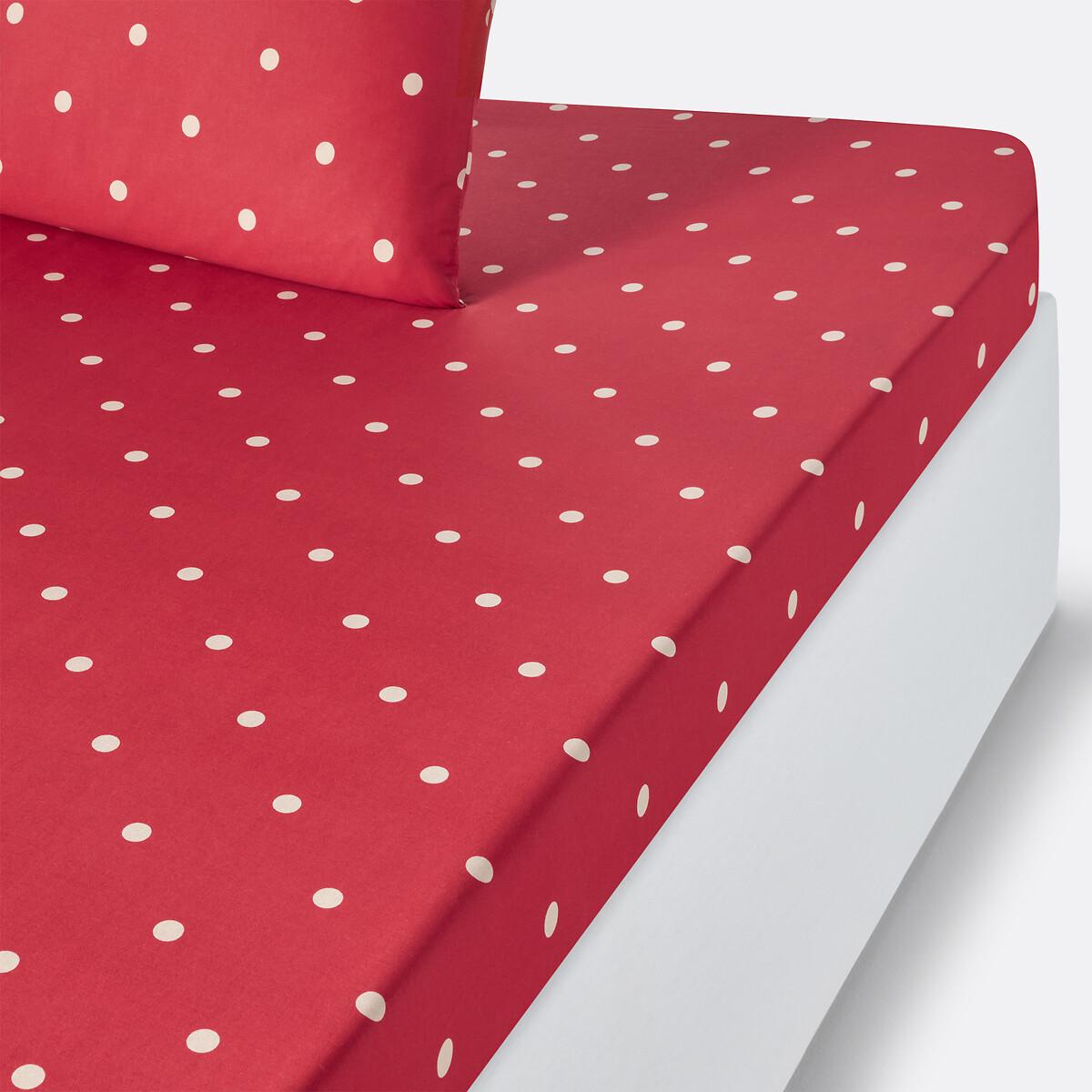 Edelweiss Fitted Sheet. Match this bold polka dot fitted sheet with the rest of the bedding in the Edelweiss range for a gorgeously bright bedroom. You can also mix and match it with different colours and designs from our other bedding ranges to create your own unique looks.. Cotton is part of our daily lives. We love it for its suppleness and softness. Easy Care, it is ideal for the beds of young and old alike!Product Details • 100% cotton • For mattress height 25cm • Elastic edging on the fitted sheet • Beige polka dots on a red background. Care Advice • Machine washable at 60°C • By washing your laundry at 40°C instead of 60°C, you limit energy consumption. Dimensions • 90 x 190cm : Single • 140 x 190cm: Double • 160 x 200cm : King • OEKO-TEX® Standard 100. Standard 100 certification by OEKO-TEX® tests textile products for harmful substances via an independent, international label.